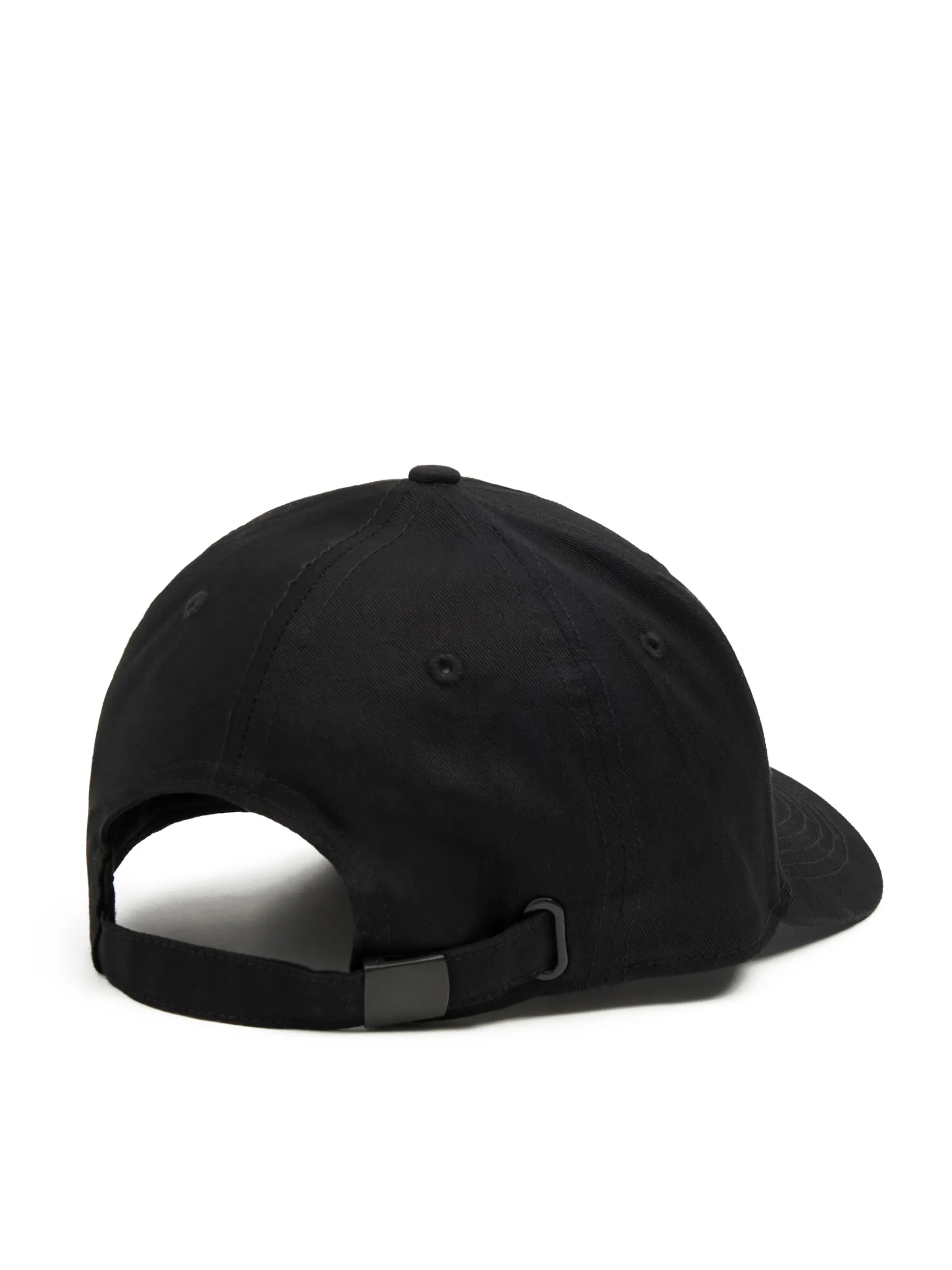 Męska czapka z daszkiem w kolorze czarnym, wykonana z bawełny. Z przodu haftowany napis, z tyłu regulacja obwodu.