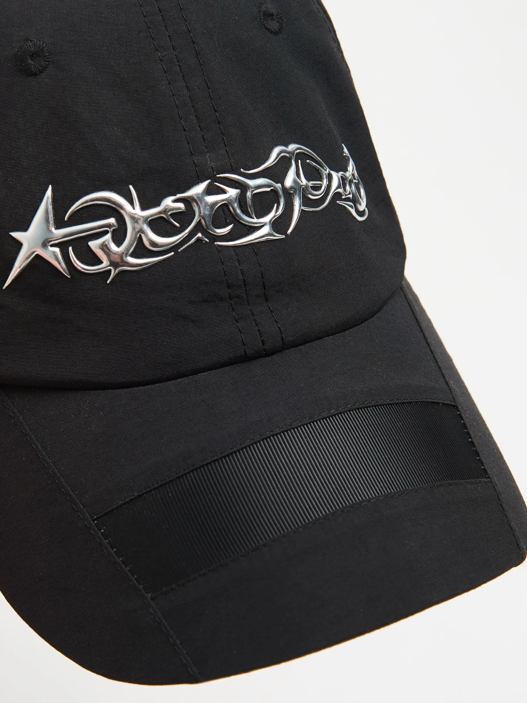 Męska czapka typu bejsbolówka, uszyta z czarnej tkaniny. Będzie idealnie pasować do Twojego outfitu na Baltic Games! profilowany daszek możliwość regulacji obwodu dzięki paskowi z klamrą z przodu błyszcząca aplikacja w stylu Y2K z tyłu haft ze sloganem „PIRATES TILL THE END THINK LESS AND GRIND MORE”