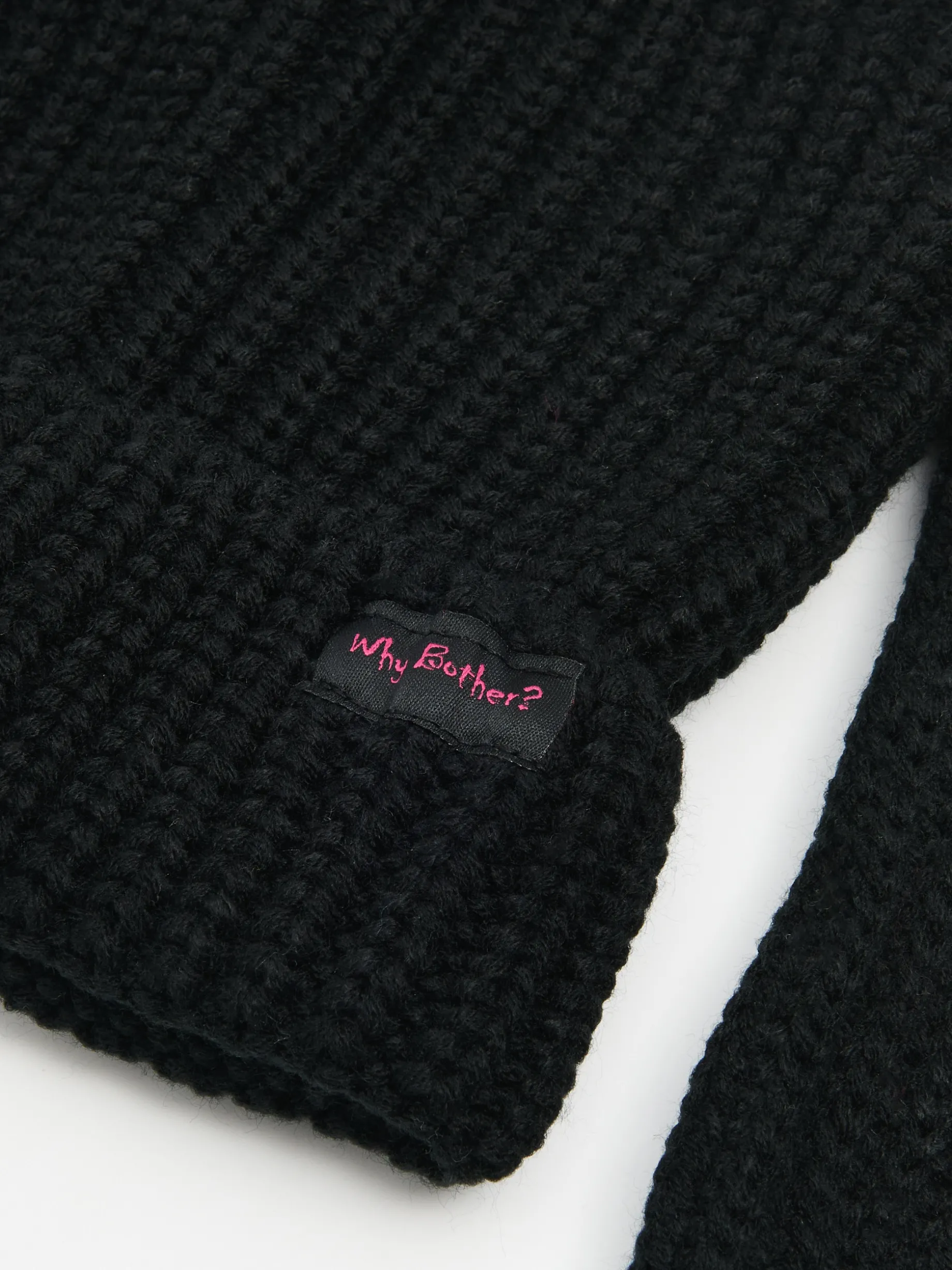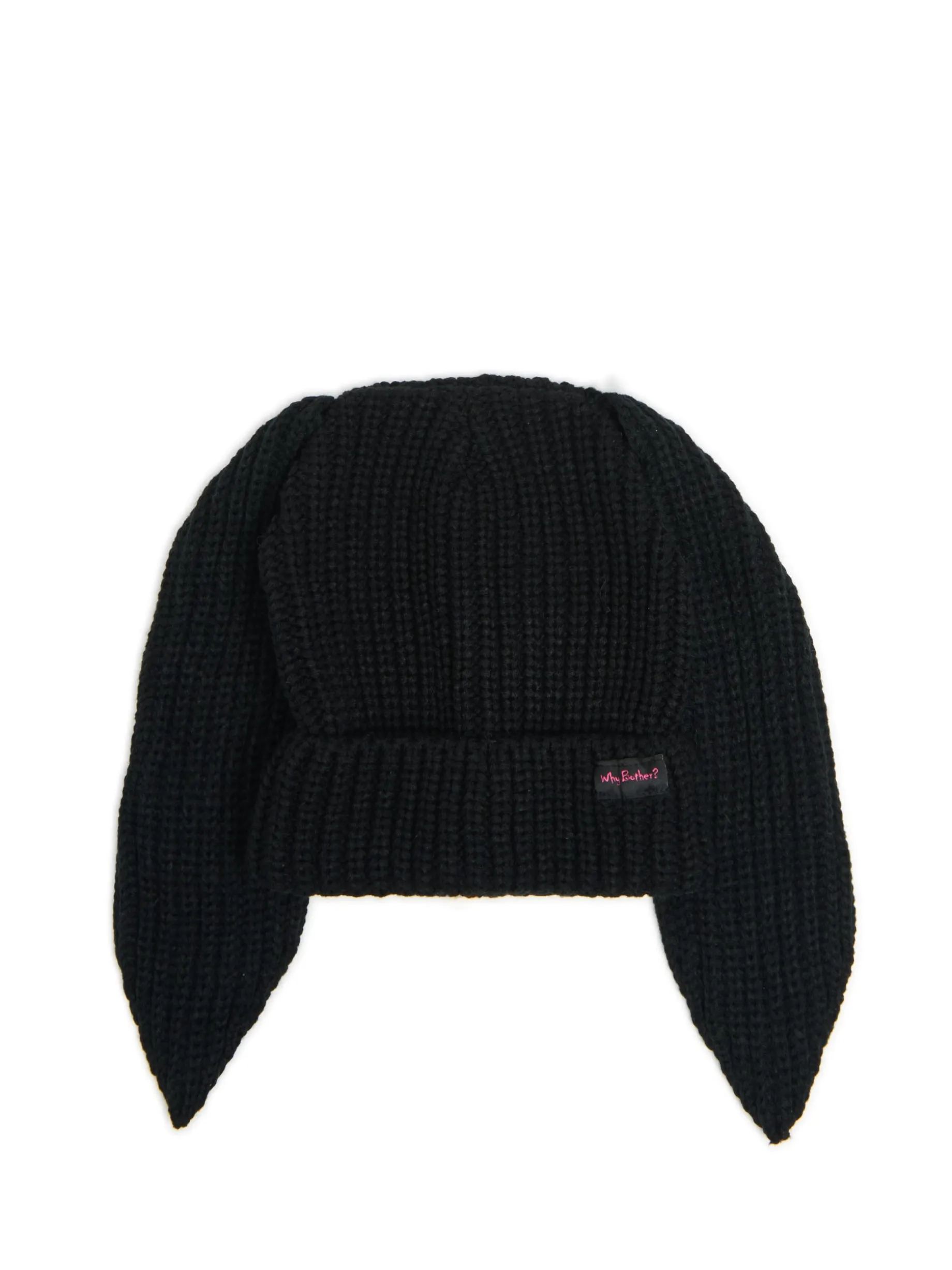 Mamy dla Ciebie uroczą damską czapkę beanie, uszytą z przyjemnej w dotyku dzianiny w kolorze czarnym. Wyjątkowe w tym modelu są zwisające, królicze uszy. Na przodzie ozdobna naszywka z napisem „Why Bother?”. Wejdź w sezon z naszymi zimowymi akcesoriami!