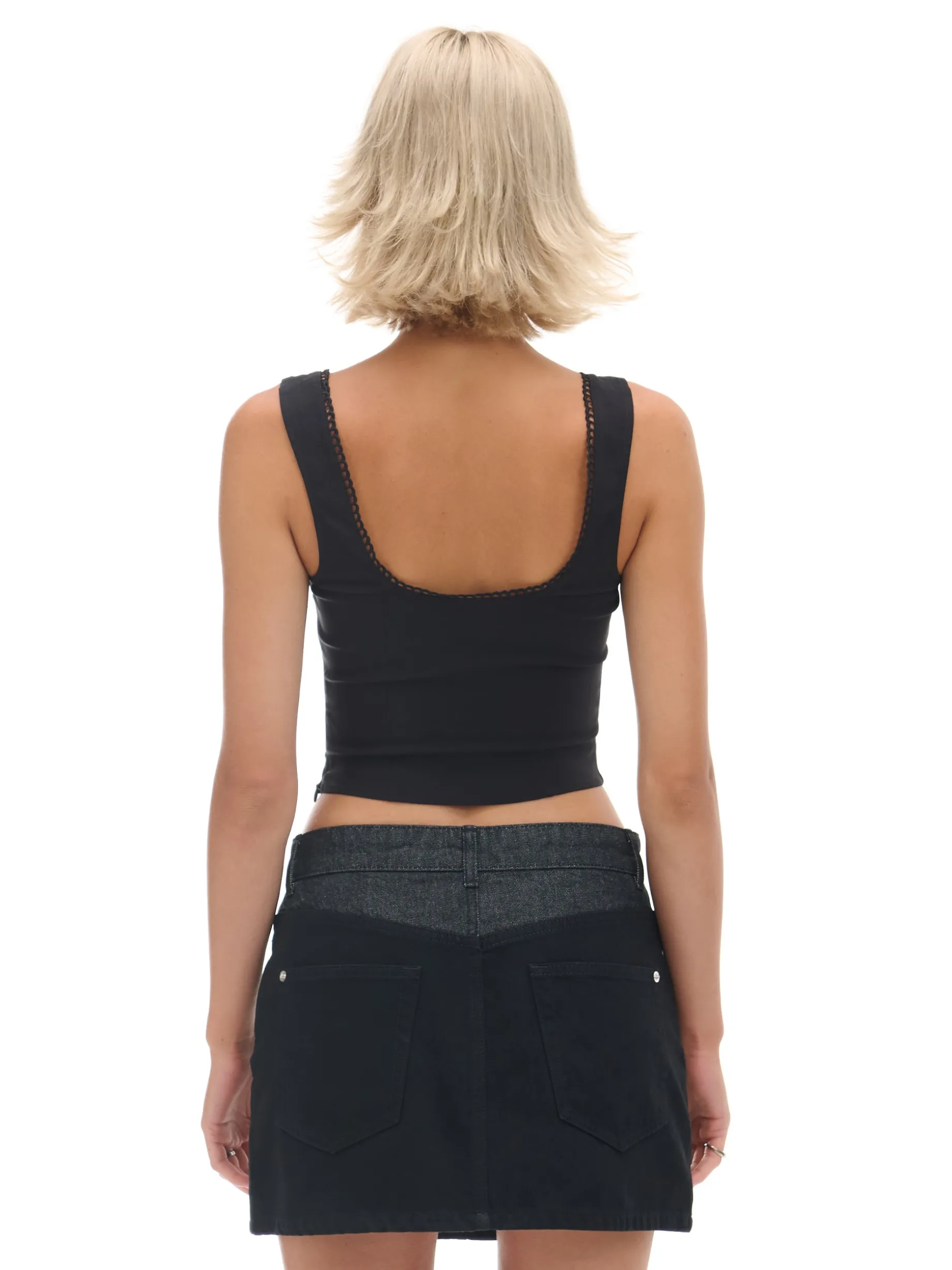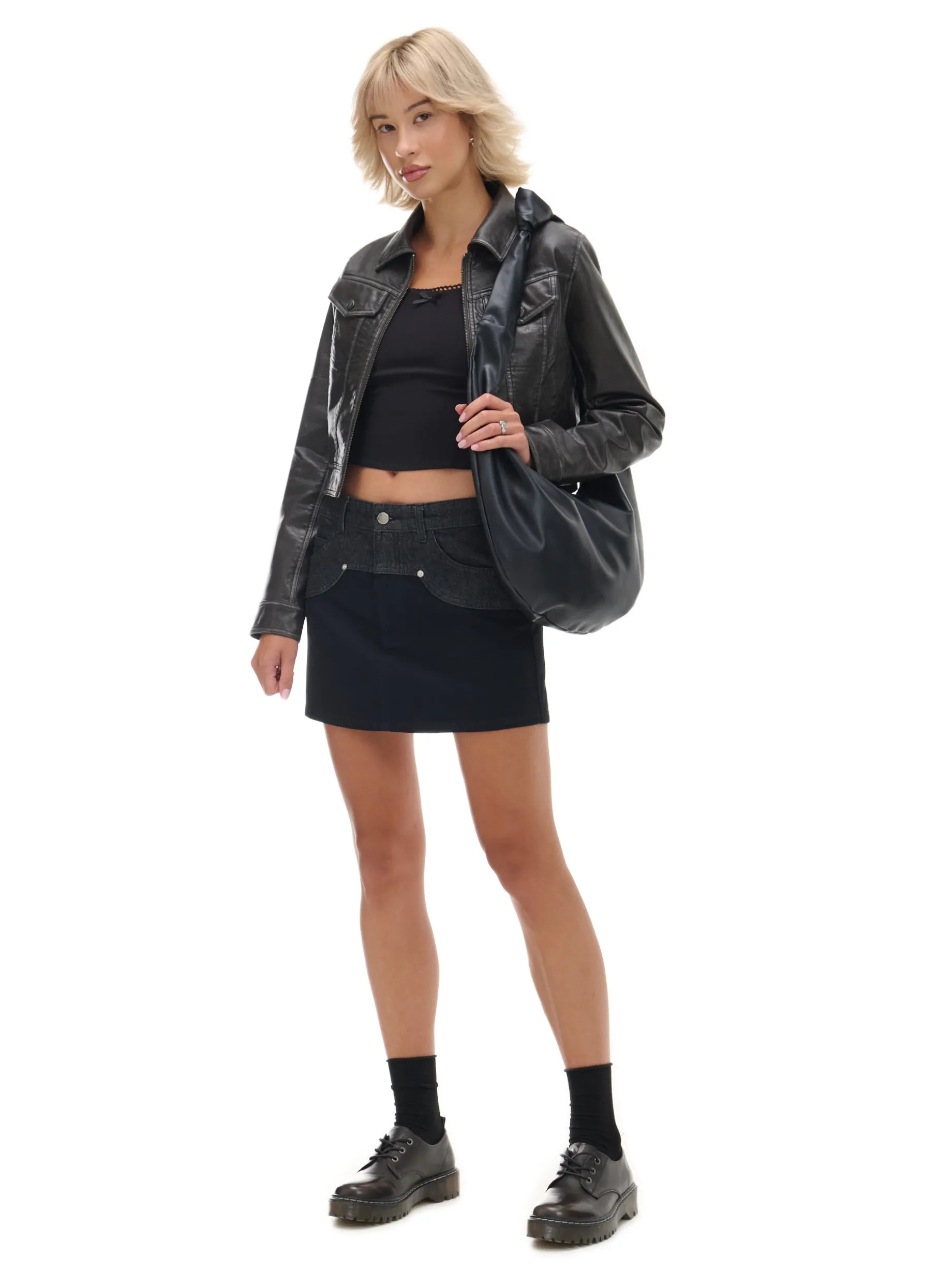 Damska spódnica o długości mini uszyta z czarnej denimowej tkaniny. Ozdobą tego modelu jest dwukolorowy materiał i metalowe dźety po obu stronach. Nowoczesny design w klasycznym wydaniu. 100% bawełny długość mini zapięcie na zamek i guzik otwarte kieszenie po bokach dwie naszyte kieszenie tylnie jedna mała kieszeń na drobniaki szlufki na pasek metalowe detale Wzrost modelki: 177 cm