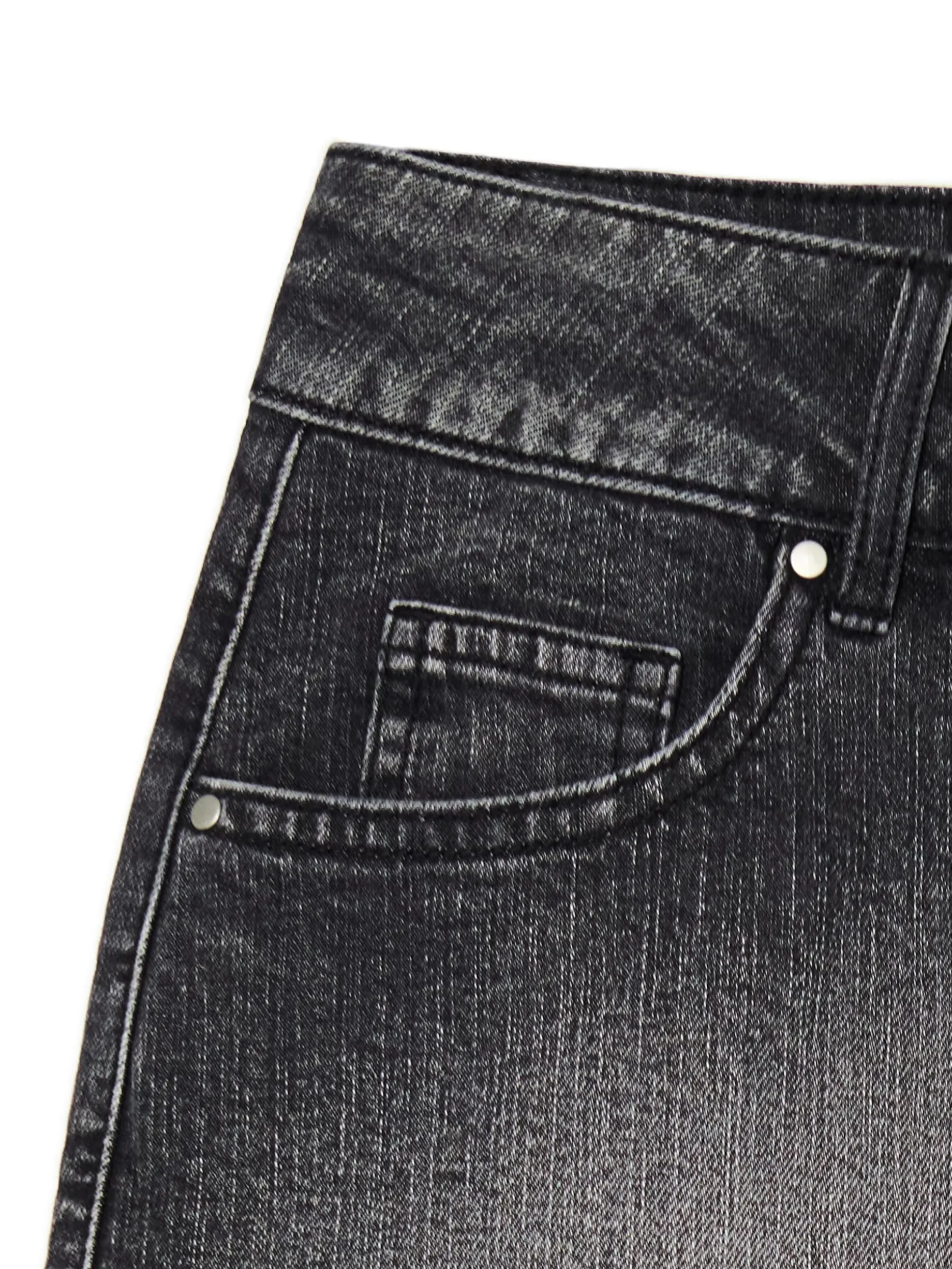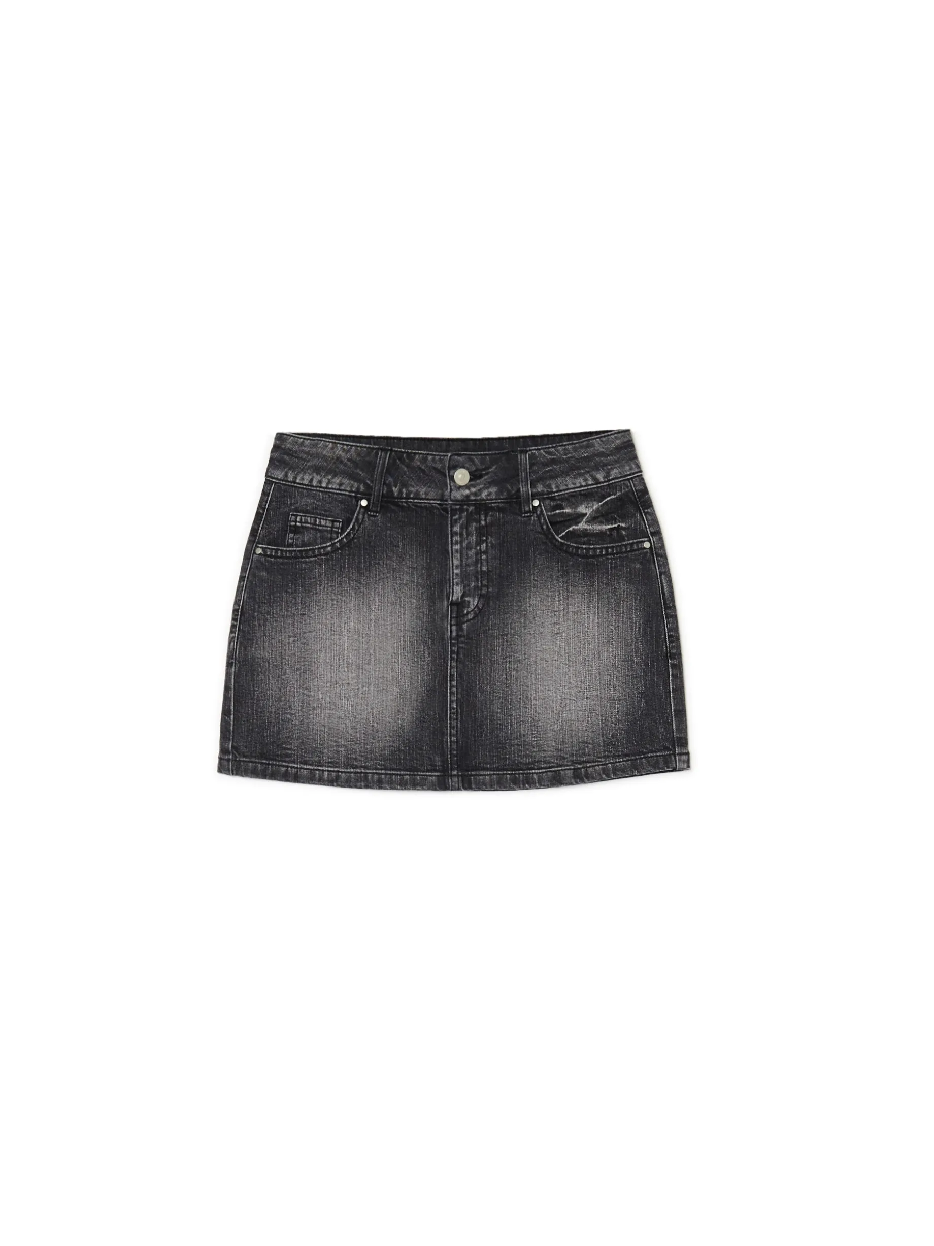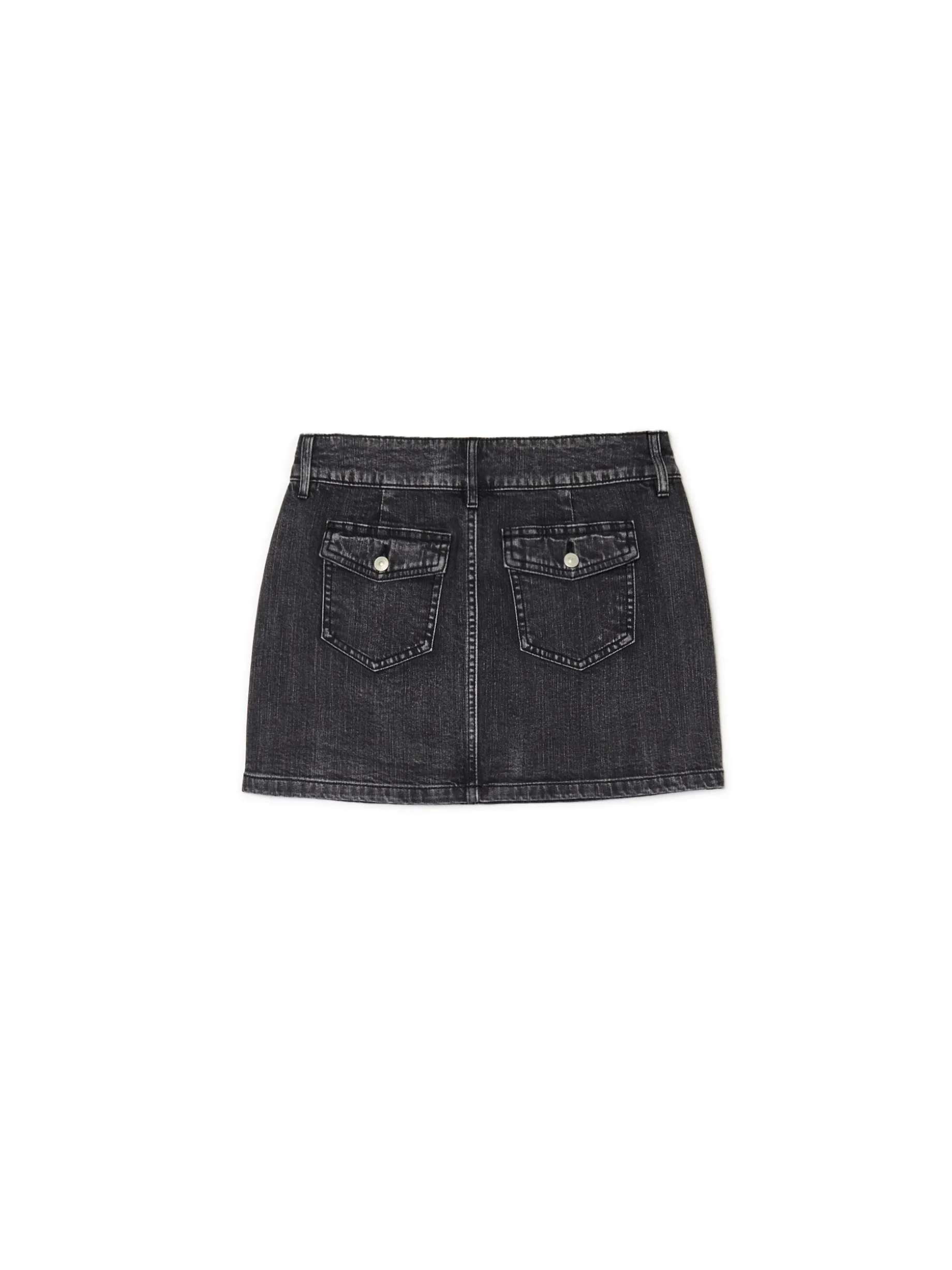 Spódnica damska o długości mini uszyta z denimu o czarnym kolorze w stylu vintage. Fituje ze sneakersami, jak i półbutami. bawełna z dodatkiem elastycznych włókien długość mini zapięcie na zamek i guzik pięć kieszeni tylne kieszenie zapinane na guziki zakładki modelujące z tyłu szerokie szlufki na pasek