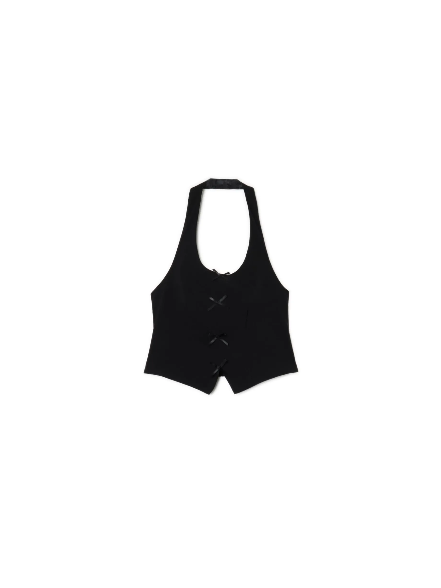 Damska kamizelka bez rękawów, uszyta z mieszanki tkanin o wysokiej zawartości wiskozy. Wykończona na plecach elastyczną gumą, która zapewnia komfort noszenia. Halterneck i dekoracyjne naszywki nadają jej wyjątkowego looku. uszyta z tkaniny z dodatkiem wiskozy dopasowany krój podkreślający sylwetkę dekolt typu halter ozdobne naszywki