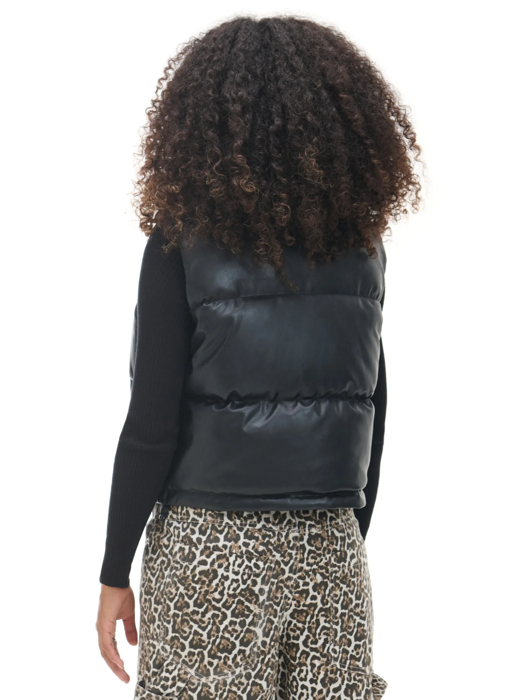 Damska pikowana kamizelka typu puffer o krótszym kroju, uszyta z imitacji skóry. Idealna na sezon przejściowy, dzięki delikatnemu wypełnieniu. kamizelka o krótszym kroju pikowanie na całości wewnątrz wykończenie na podszewce syntetyczne wypełnienie zapięcie na zamek na całej długości wysoka stójka bez rękawów dwie kieszenie po bokach regulacja dołu za pomocą gumek ze stoperami