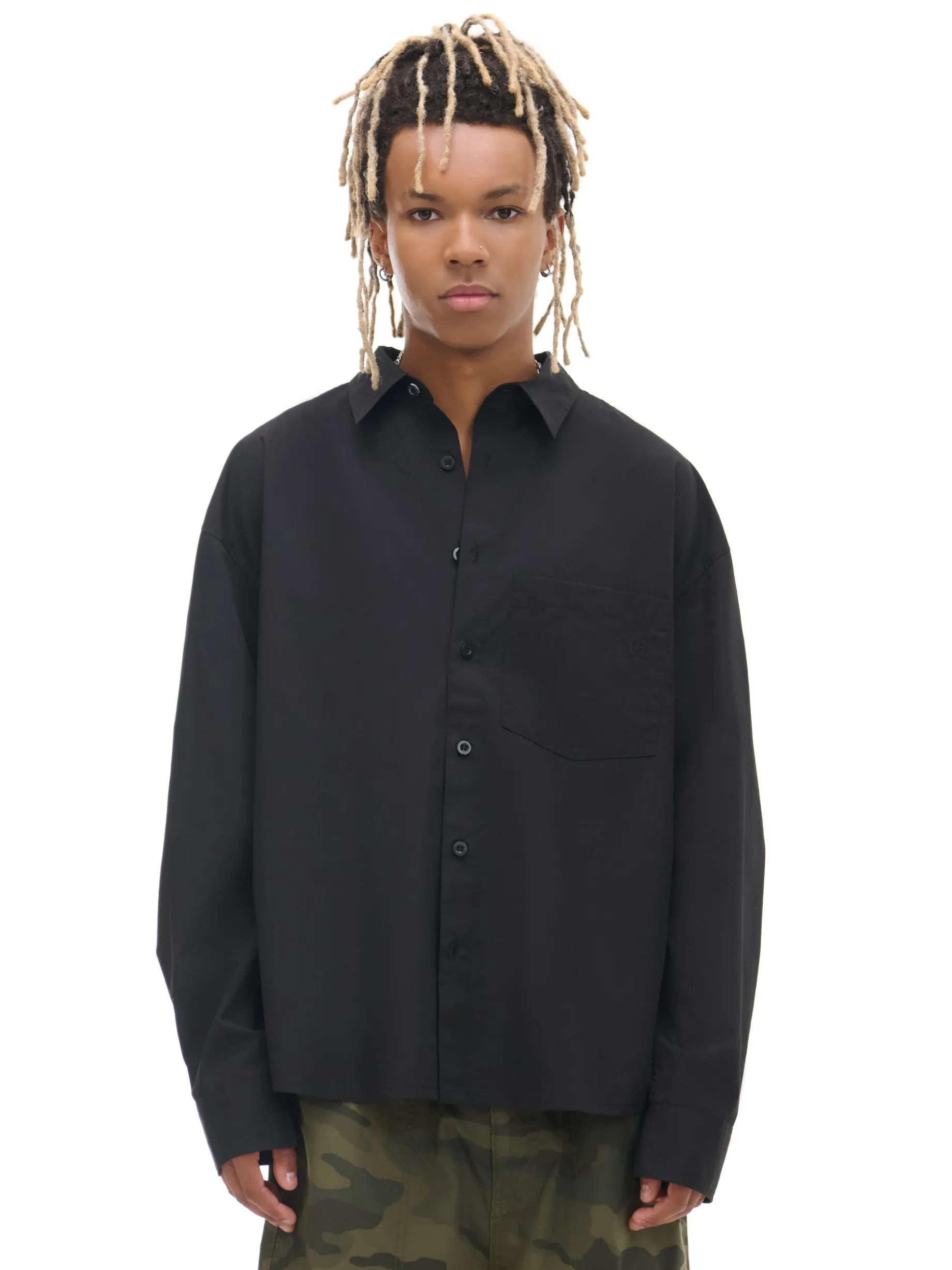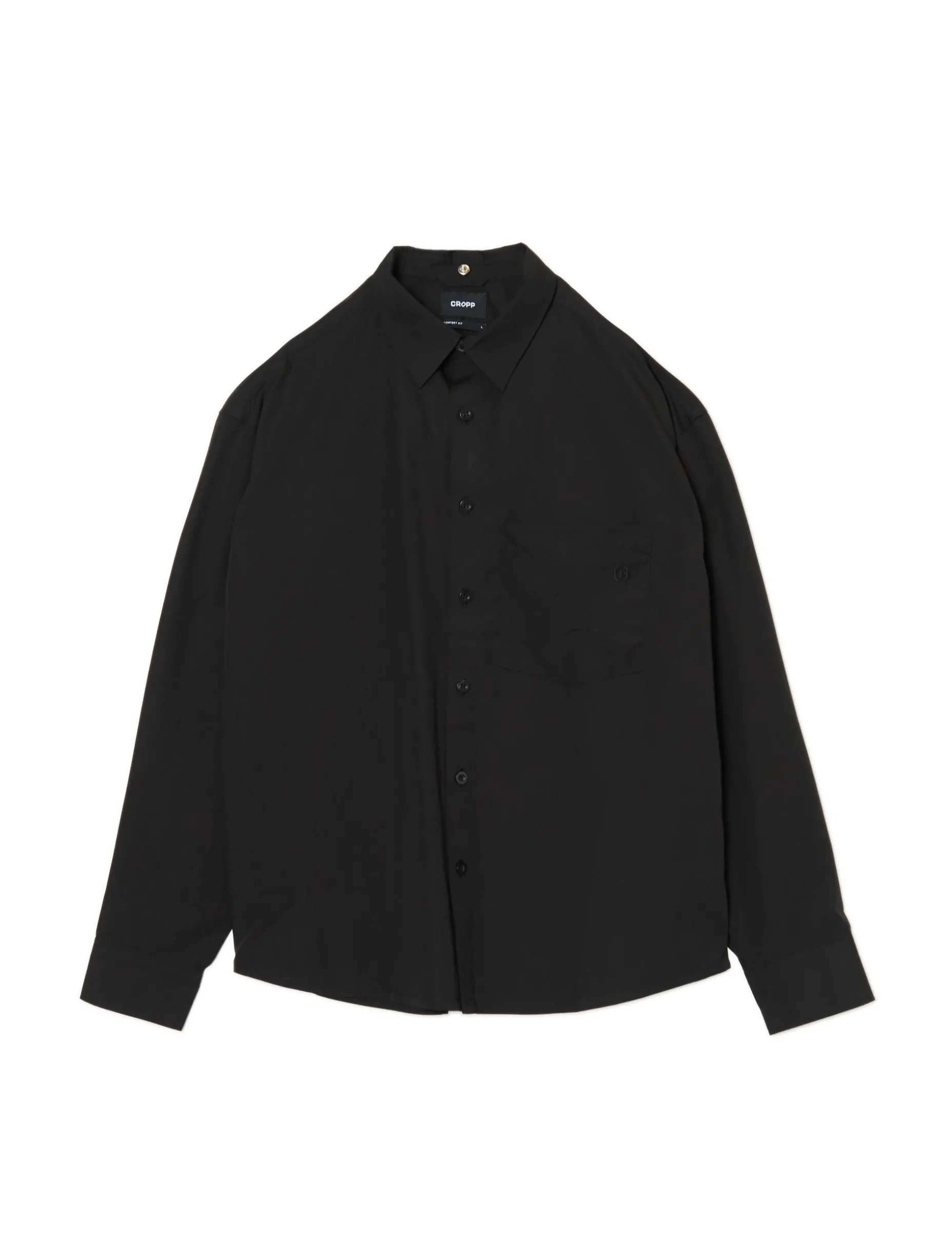 Czarna męska koszula o kroju comfort z kołnierzykiem, uszyta z miękko wykończonej popeliny. Delikatny haft na kieszonce sprawia, że koszula pasuje do casualowej, jak i bardziej eleganckiej stylizacji. dzianinowy materiał z bawełną swobodny krój jednorzędowe zapięcie na guziki klasyczny kołnierzyk długie rękawy zakończone mankietem z guzikami kieszeń piersiowa niewielki haft z przodu