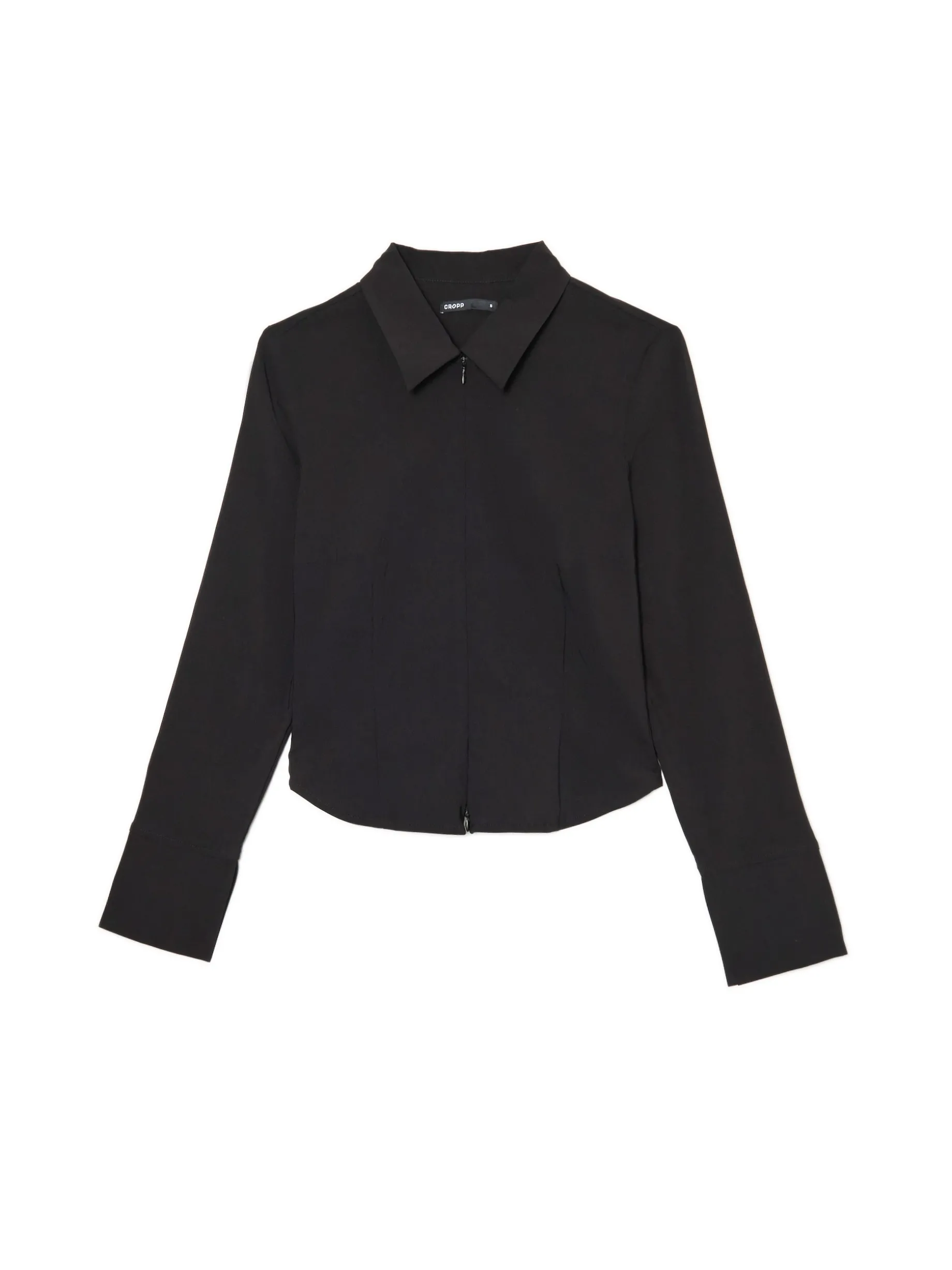 Czarna koszula damska z długim rękawem uszyta z mieszanki tkanin o wysokiej zawartości wiskozy. Posiada dwustronny suwak z możliwością regulacji długości zapięcia. Wypróbuj różne warianty. uszyta z tkaniny z dodatkiem wiskozy zapięcie na podwójny zamek krótki, dopasowany krój klasyczny kołnierzyk długie rękawy wykończone mankietami Wzrost modelki: 177 cm