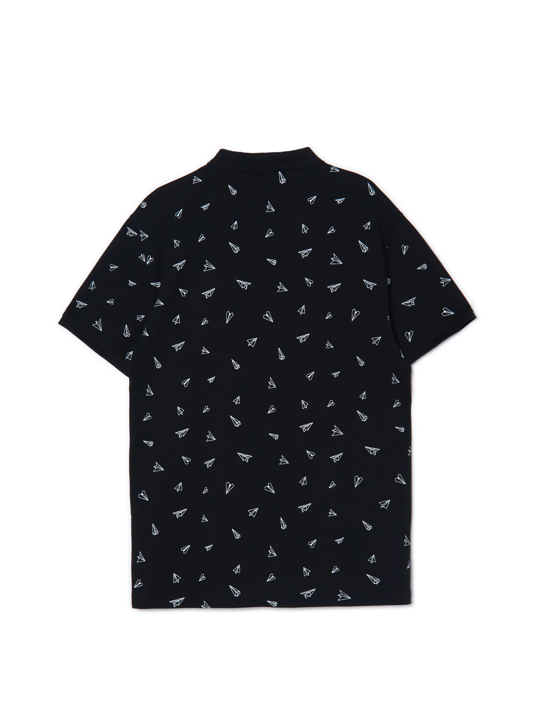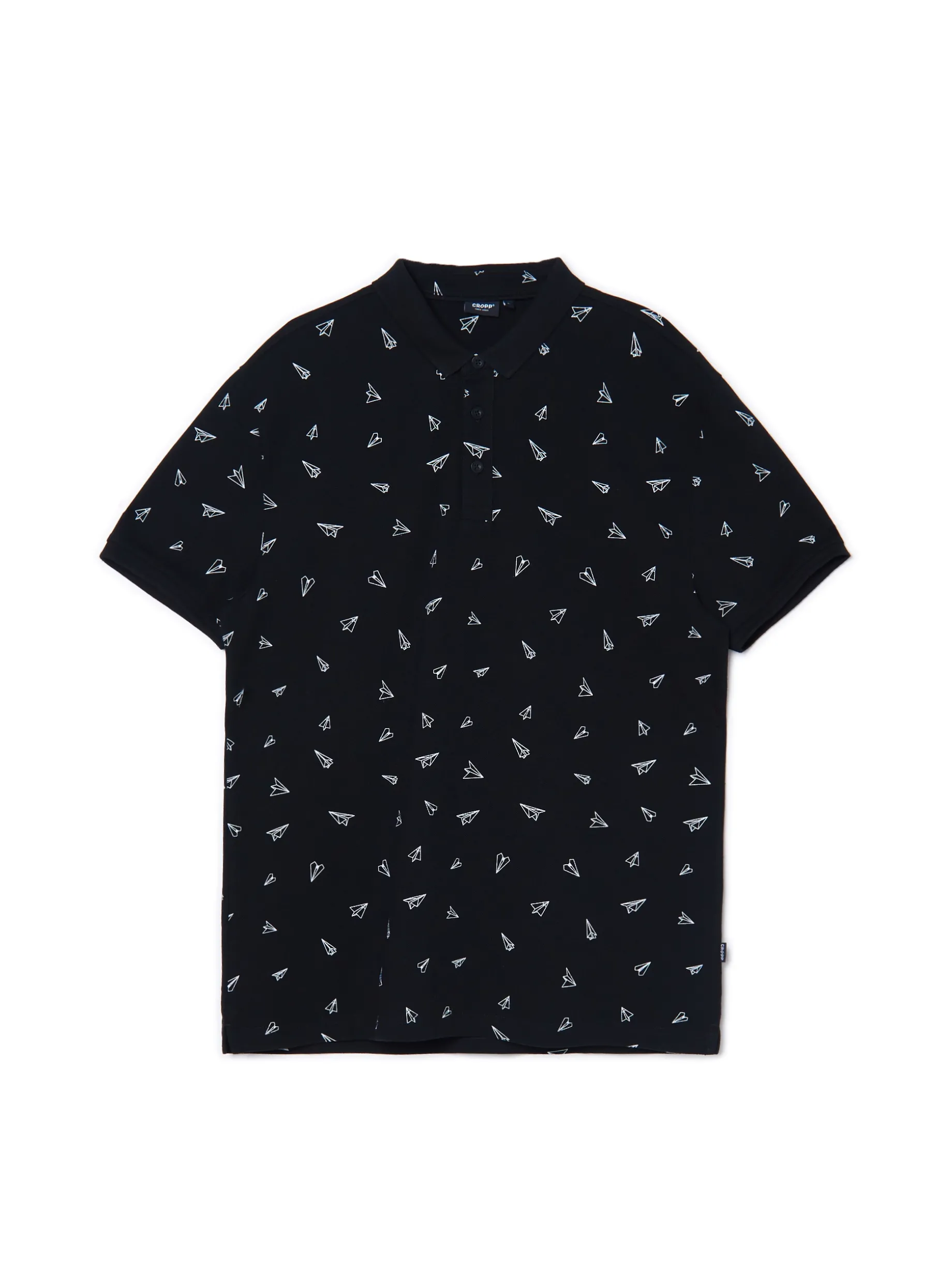 Czarna męska koszulka polo, uszyta w 100% z bawełny. krój regular krótkie rękawy kołnierzyk polo nadruk z motywem papierowych samolotów all over