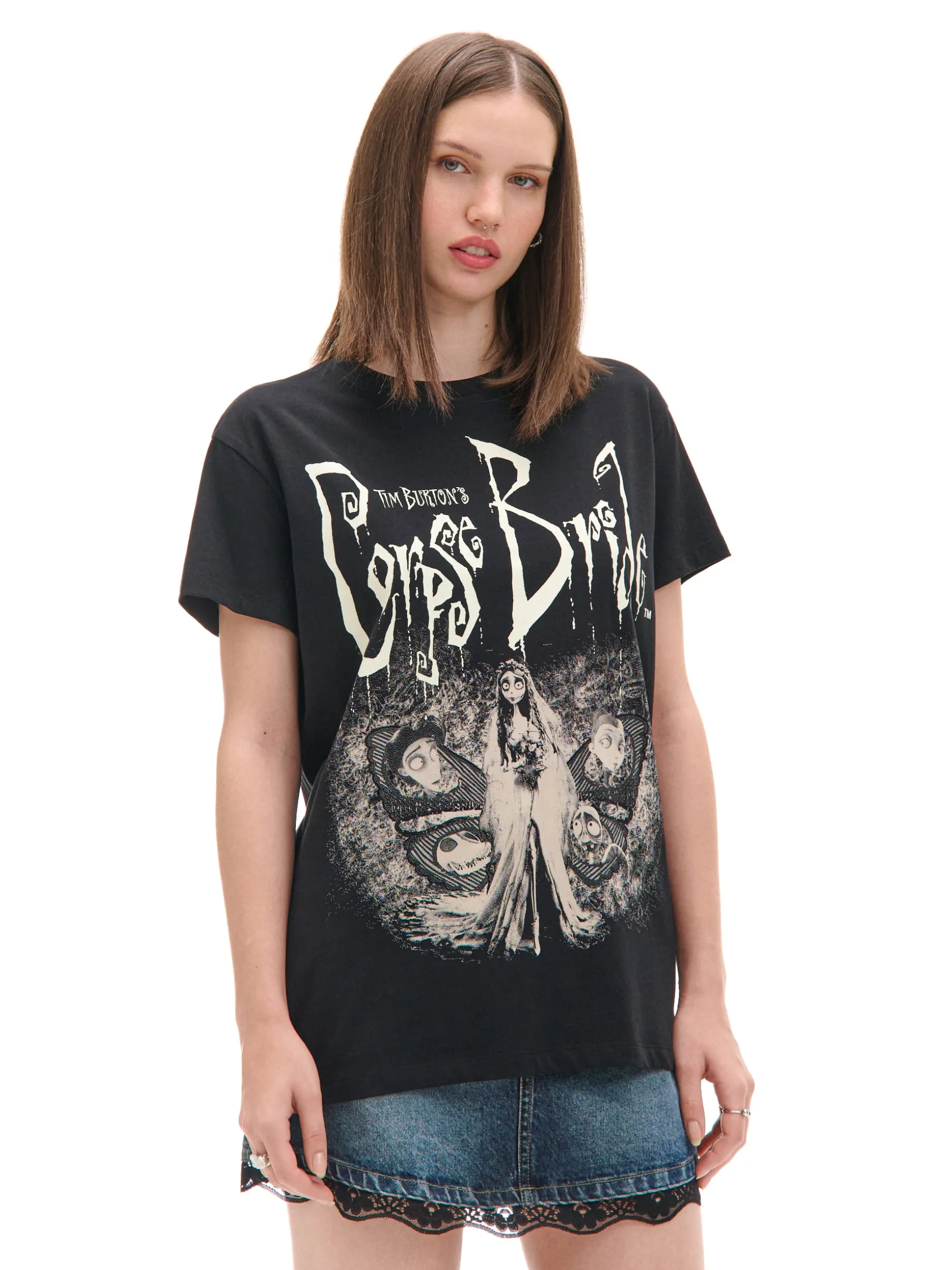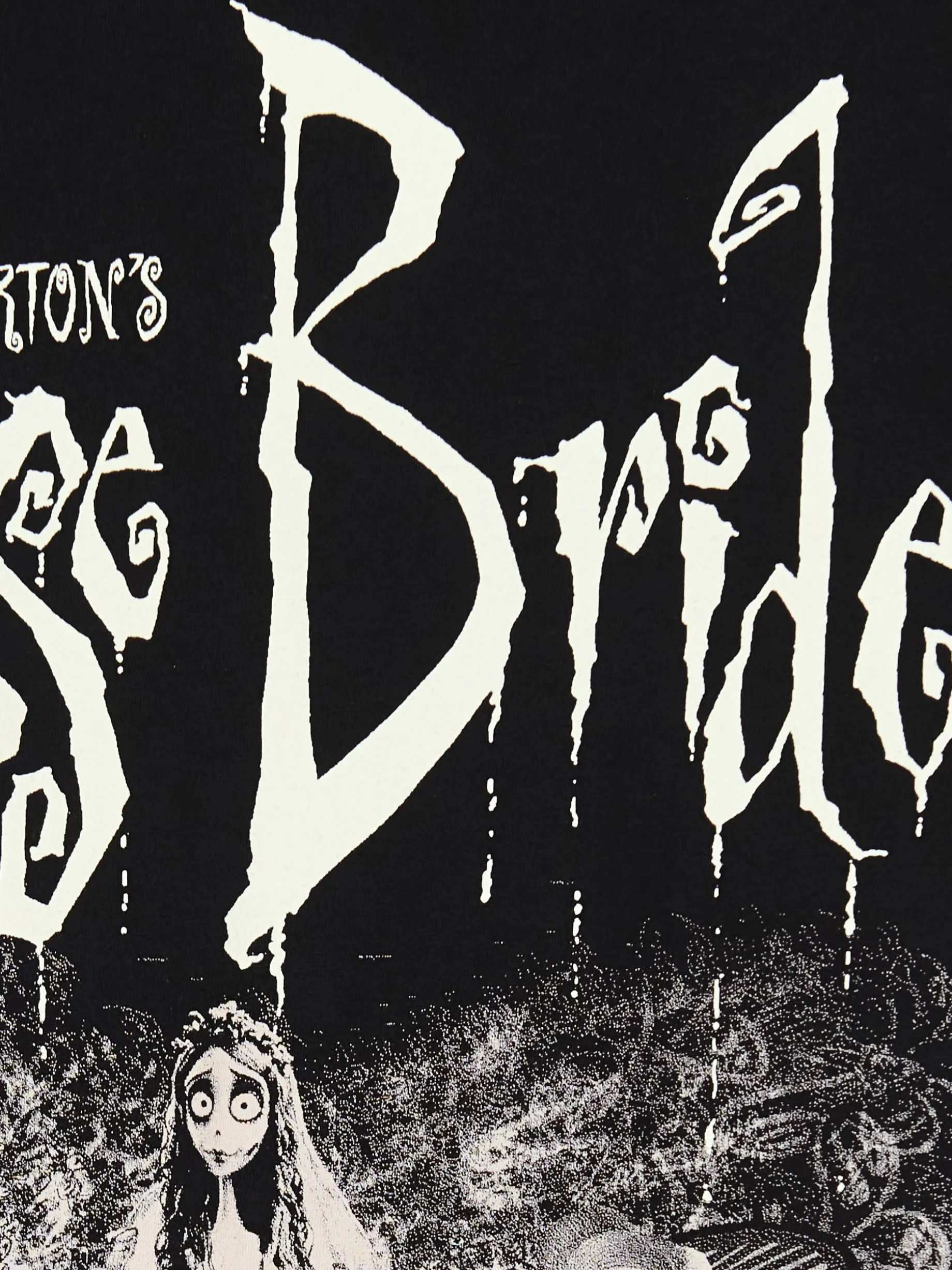 Item na hallowenowy wieczór i nie tylko. Damski T-shirt uszyty z bawełnianej dzianiny w czarnym kolorze. Na przodzie licencjonowany nadruk z bohaterii filmu Tima Burtona „Gnijąca Panna Młoda”. Hop siup i do koszyka! 100% bawełny krój oversize okrągły dekolt krótkie, swobodne rękawy nadruk z motywem Halloween Wzrost modelki: 172 cm CORPSE BRIDE and all related characters and elements © & TM Warner Bros Entertainment Inc. WB SHIELD: © & TM WBEI. (s24)