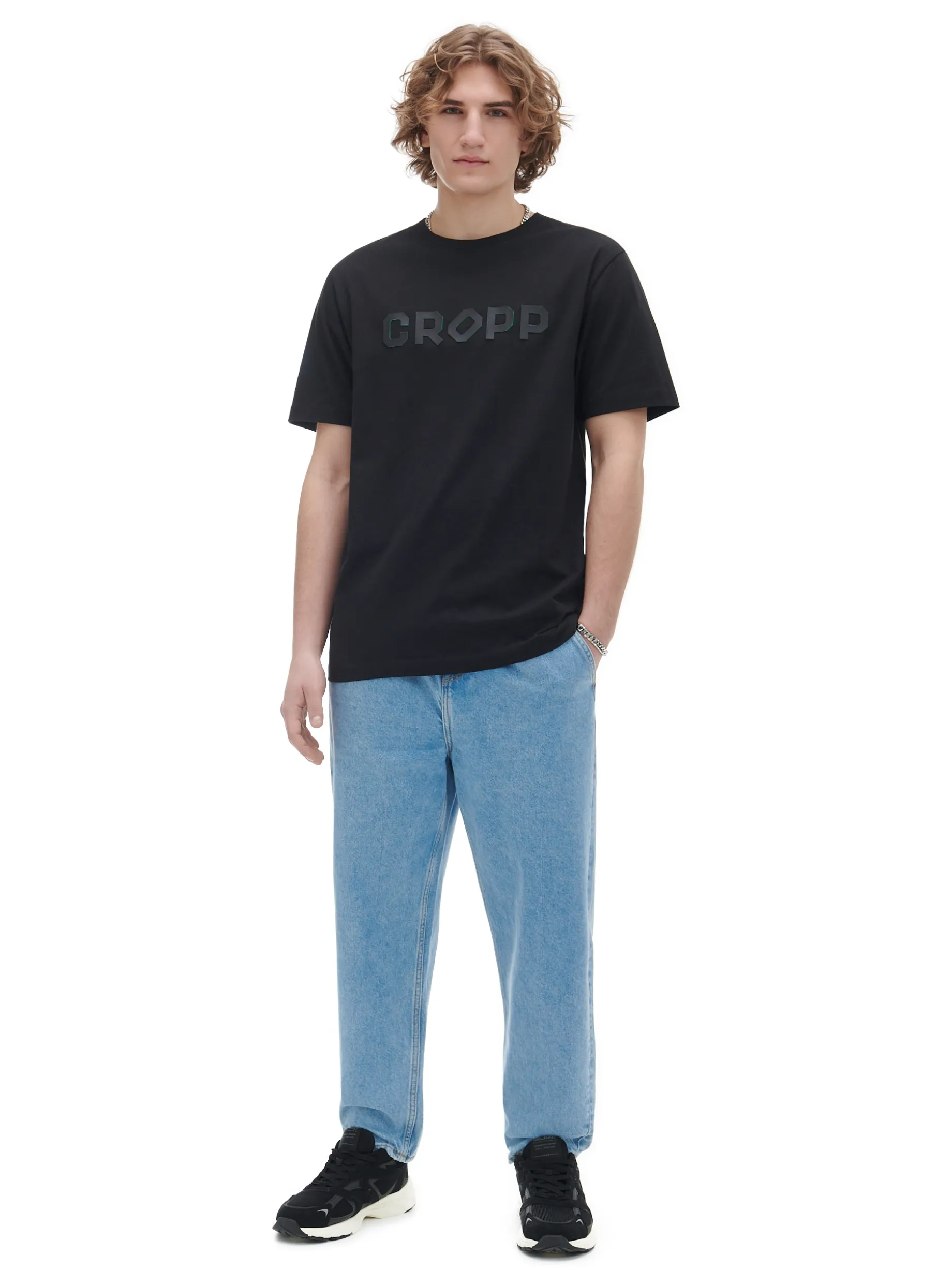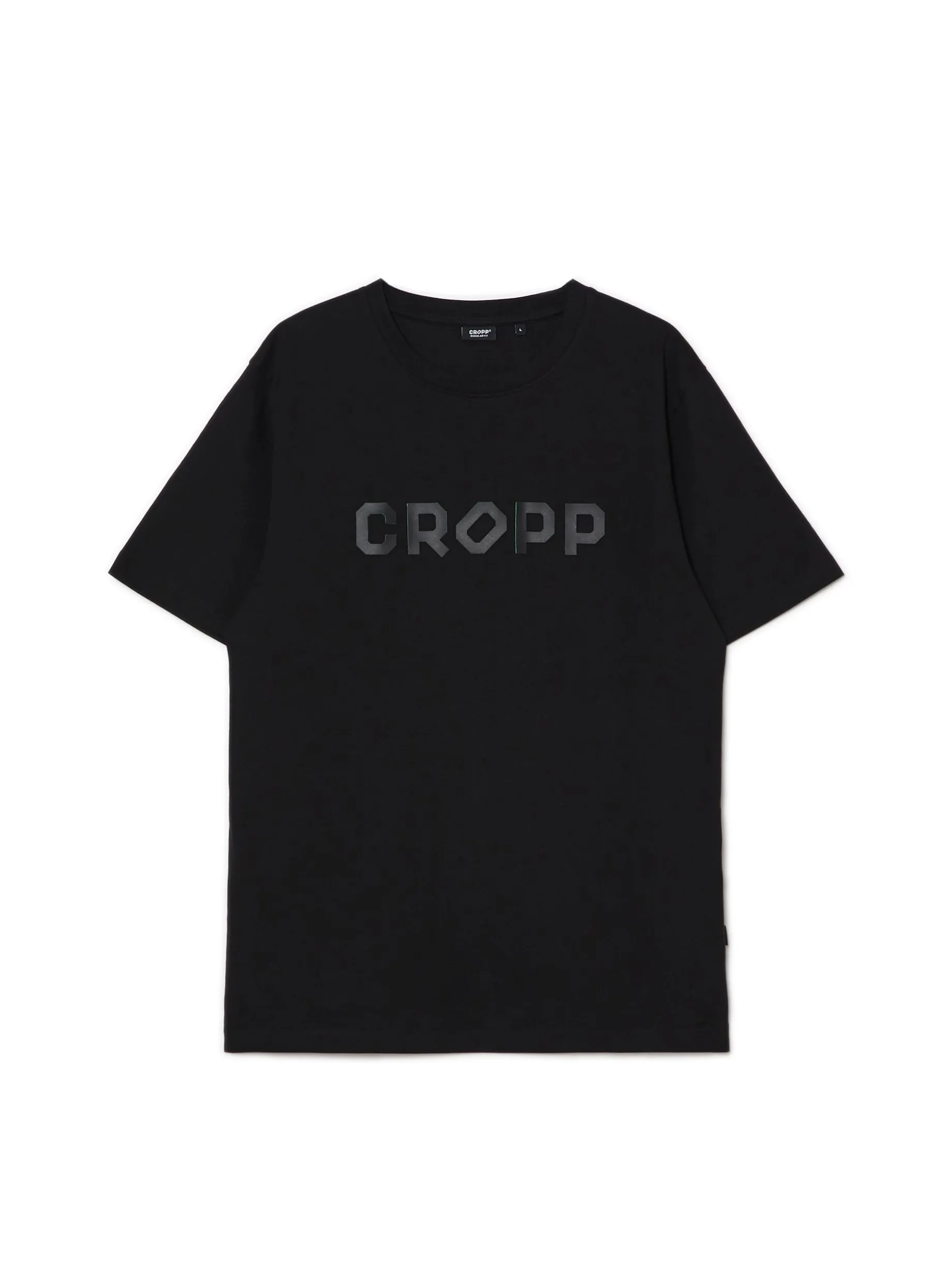 Czarna męska koszulka o kroju regular, uszyta z bawełny. Z przodu nadruk tekstowy CROPP. 100% bawełny regularny krój uniwersalny basicowy styl krótkie, swobodne rękawy Wzrost modela: 184 cm