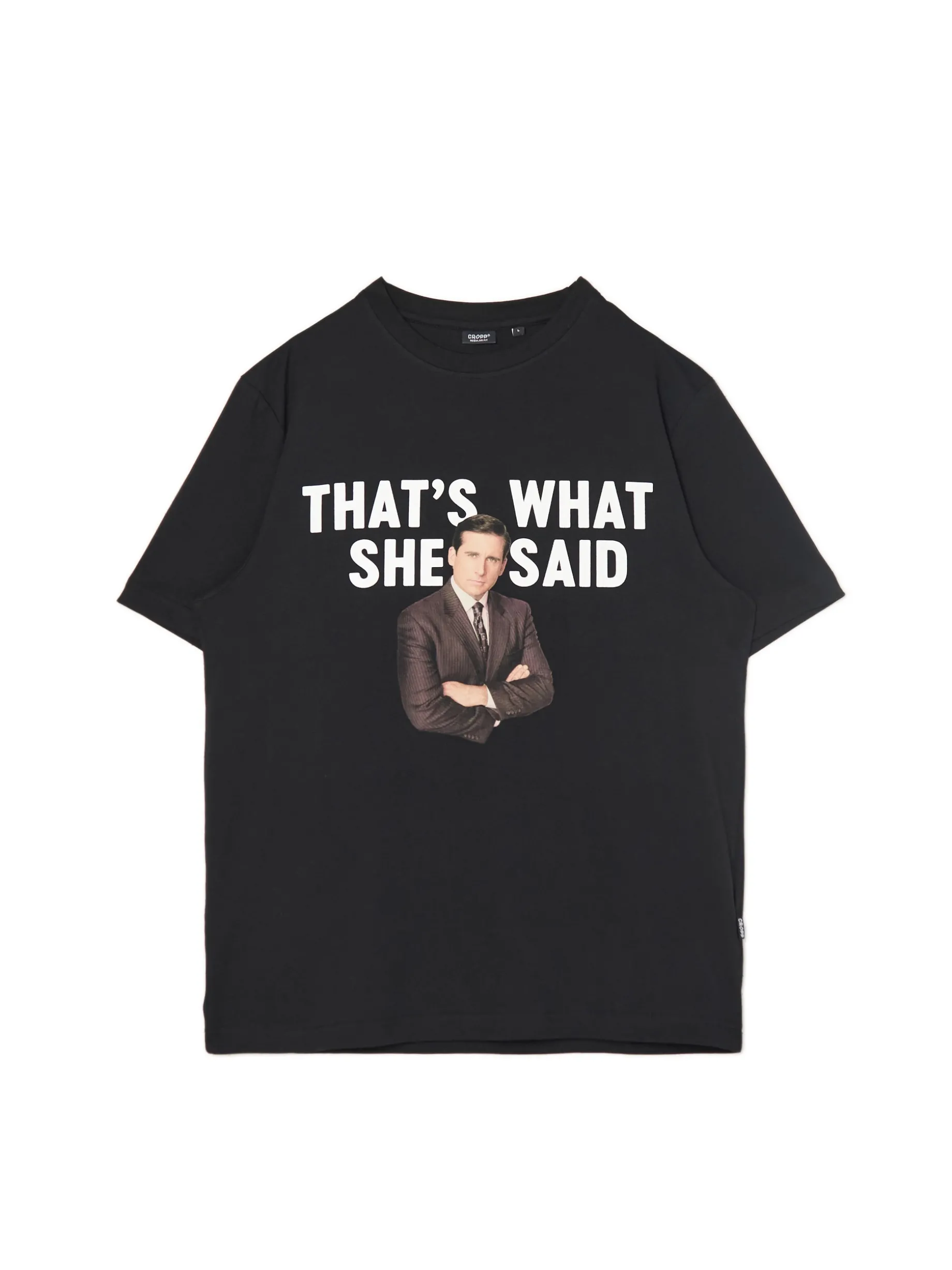 Męski czarny T-shirt, uszyty w 100% z bawełny. Idealna opcja dla fanów Michaela Scotta i całej ekipy z Dunder Mifflin w Scranton w Pensylwanii. regularny krój krótkie rękawy z przodu nadruk z serialu The Office i napisem THAT’S WHAT SHE SAID © THE OFFICE