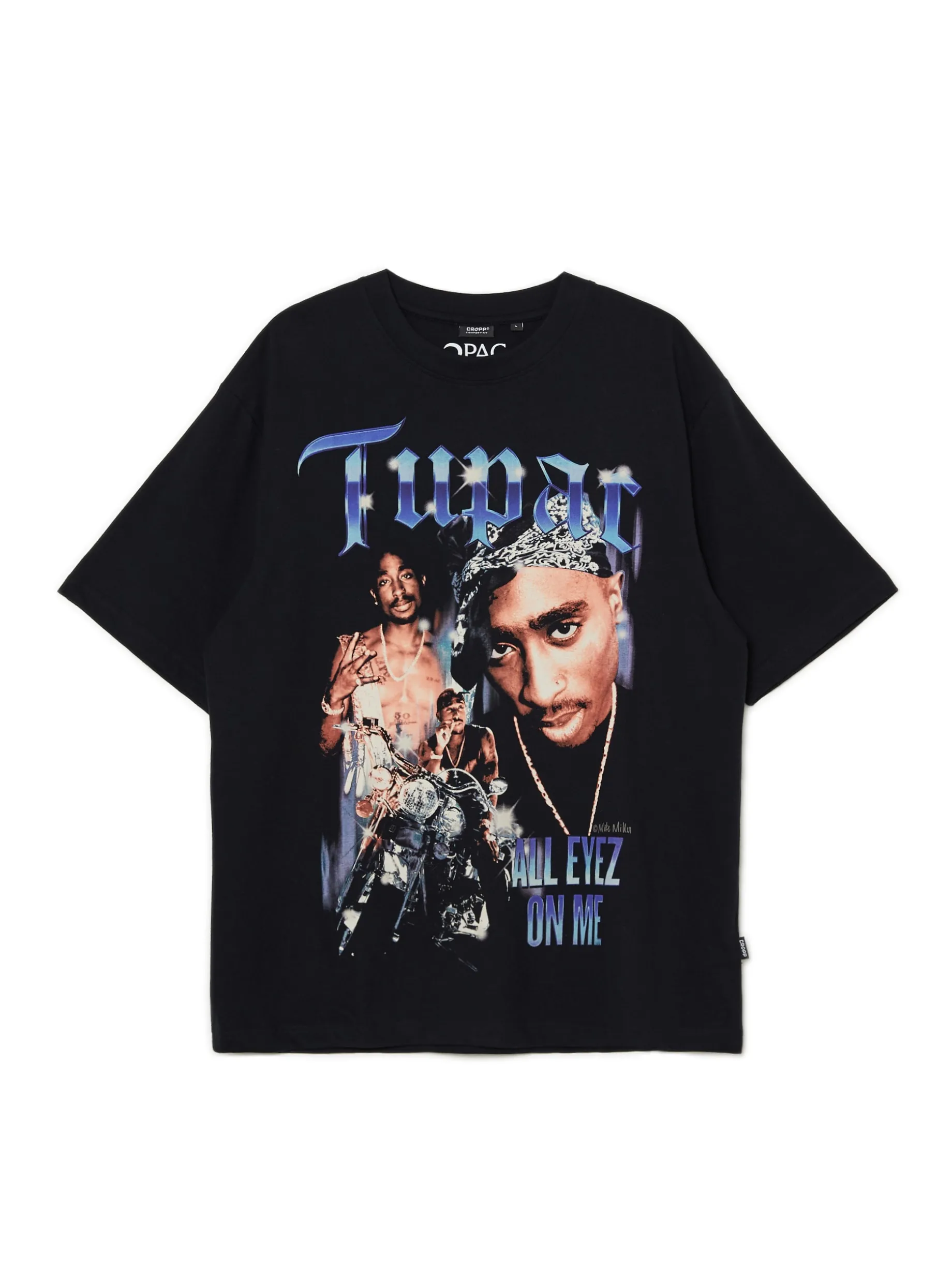 Męska czarna koszula, uszyta w 100% z bawełny. krój comfort krótkie rękawy z przodu duży nadruk z motywem Tupaca © 2PAC