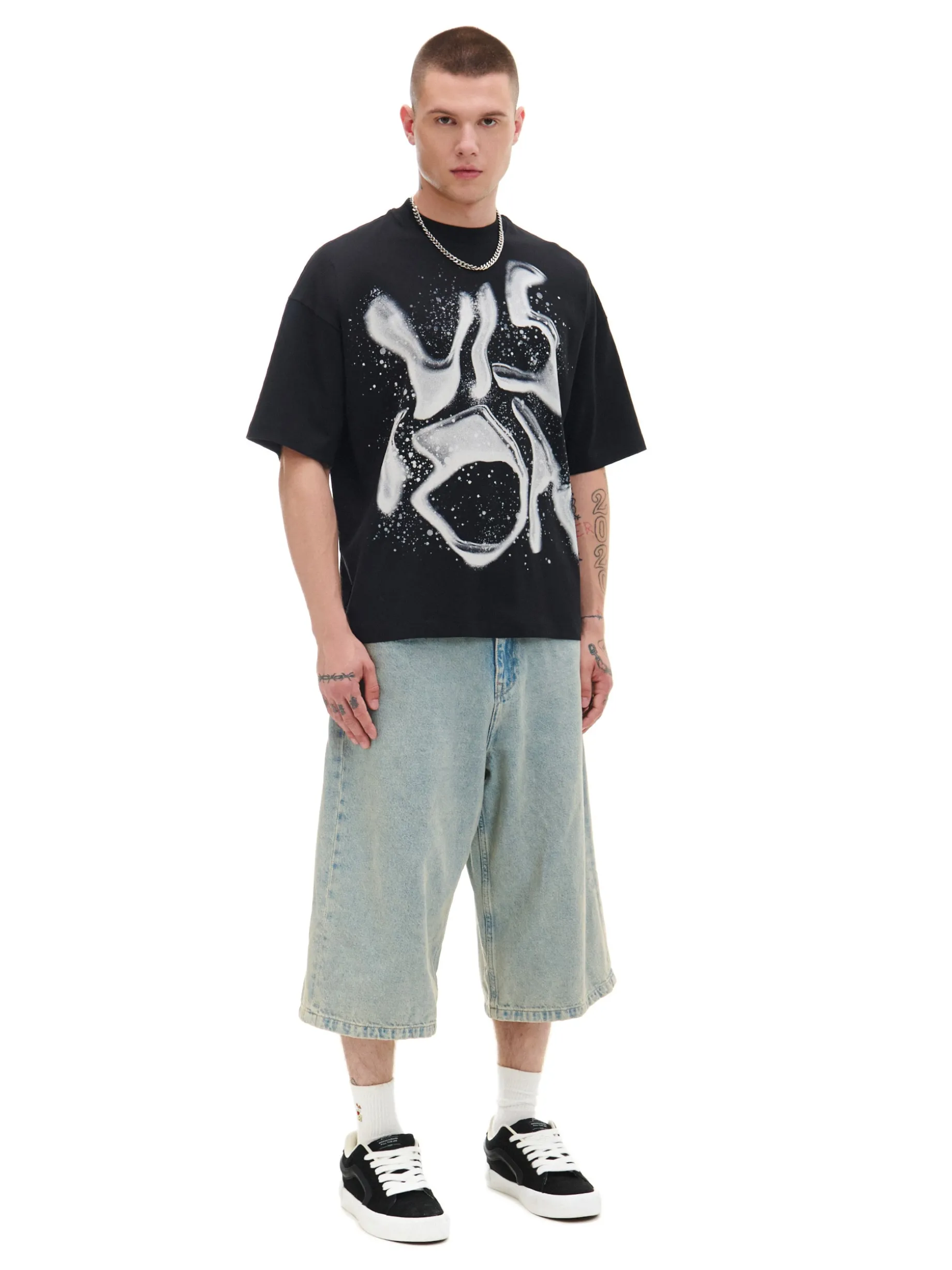 Męska bawełniana koszulka z krótkim rękawem i oryginalnym nadrukiem. 100% bawełny obszerny krój boxy krótkie, swobodne rękawy oryginalny print Model prezentuje produkt w rozmiarze M/L. Wzrost modela: 185 cm