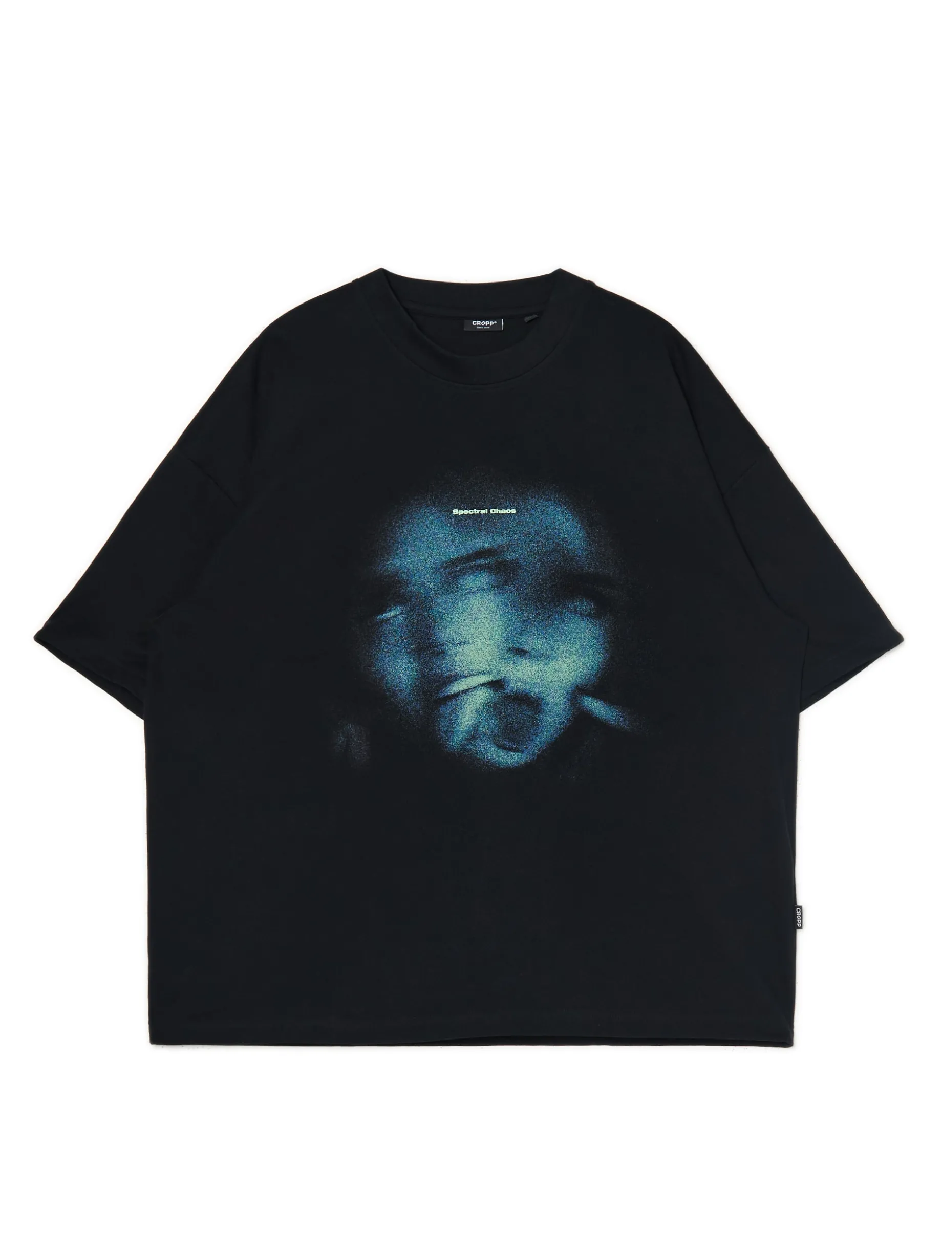 Męska bawełniana koszulka w kolorze czarnym z artystycznym nadrukiem. 100% bawełny obszerny krój boxy krótkie rękawy oryginalny print Model prezentuje produkt w rozmiarze M/L. Wzrost modela: 185 cm