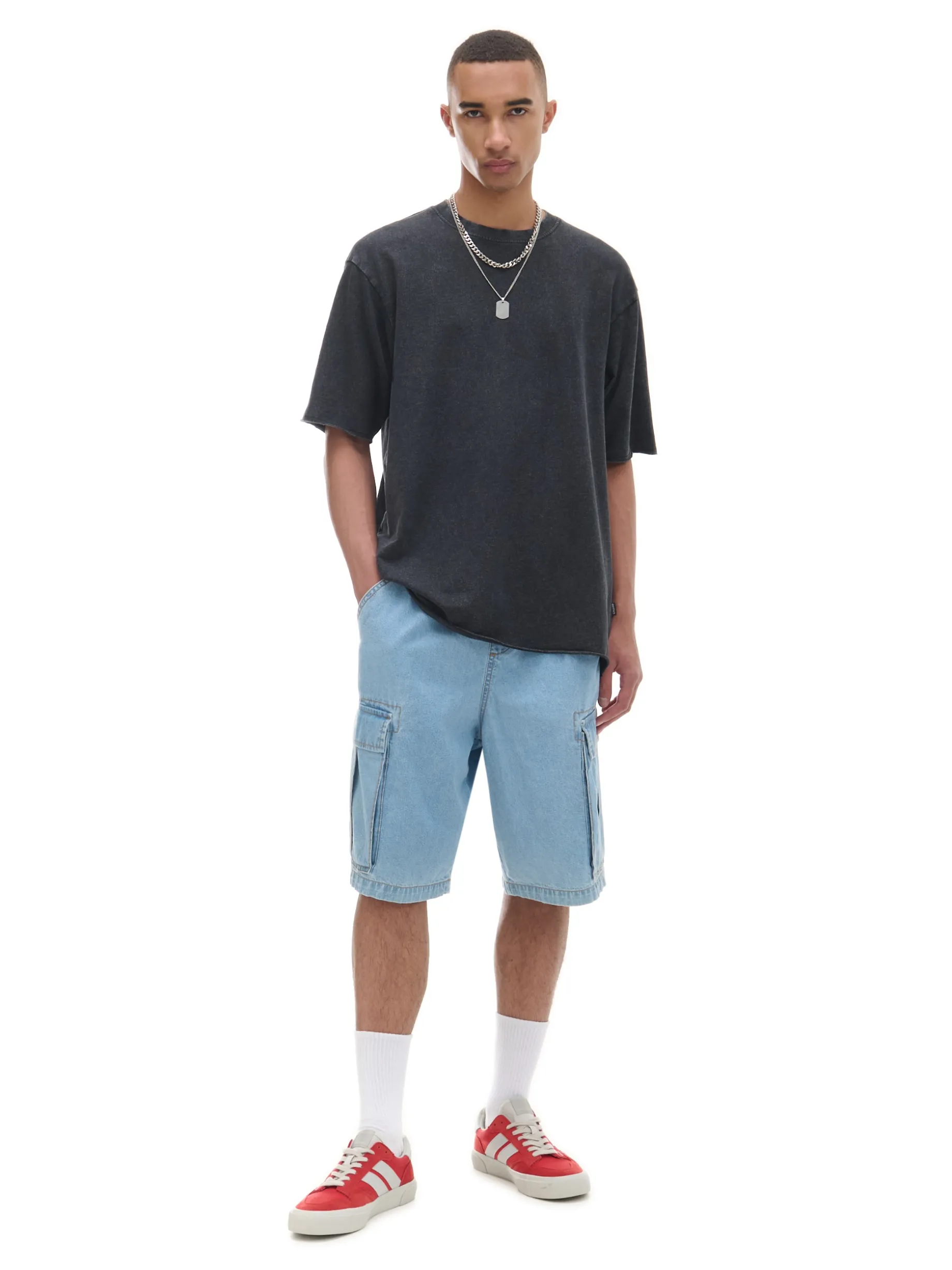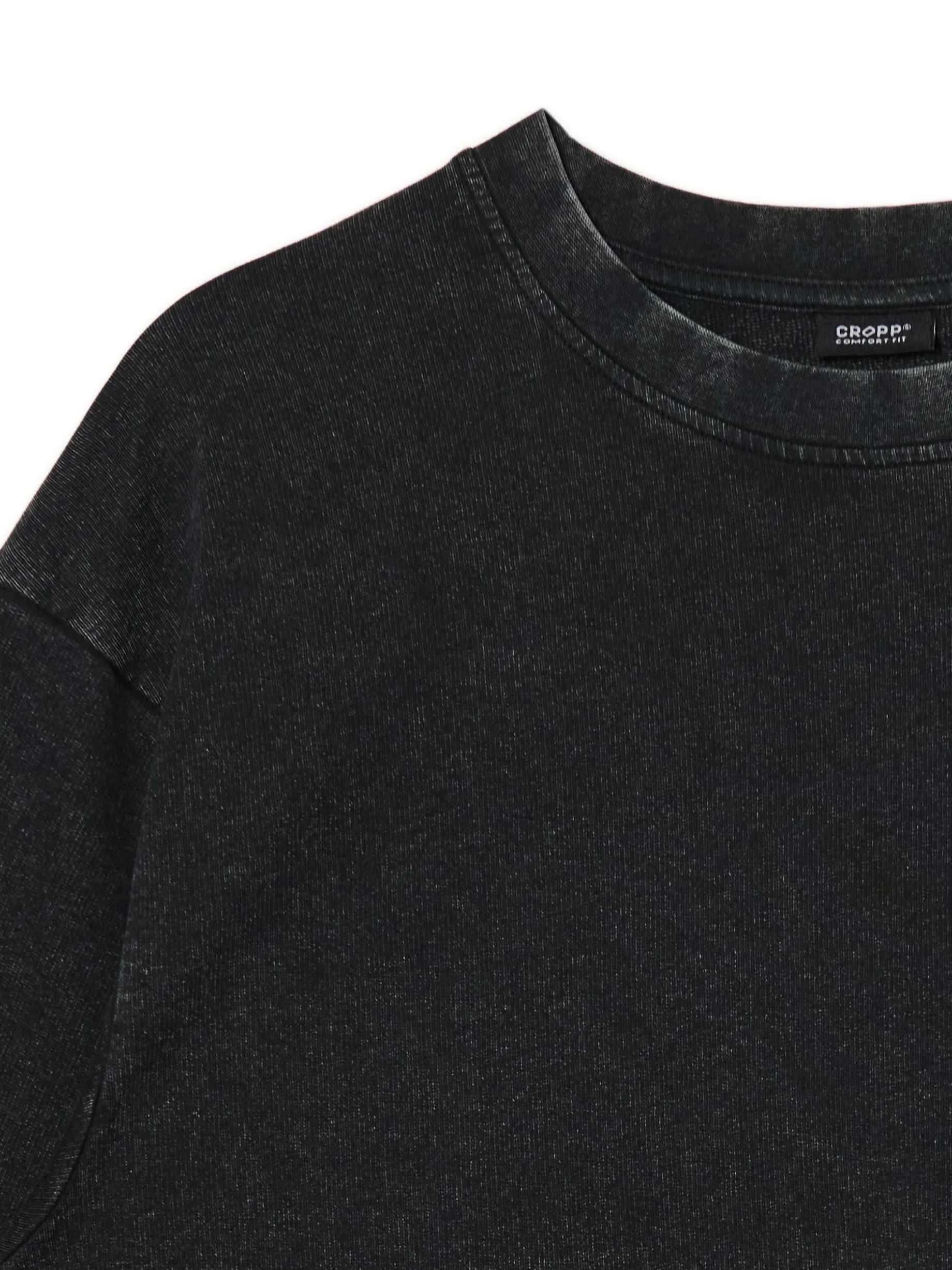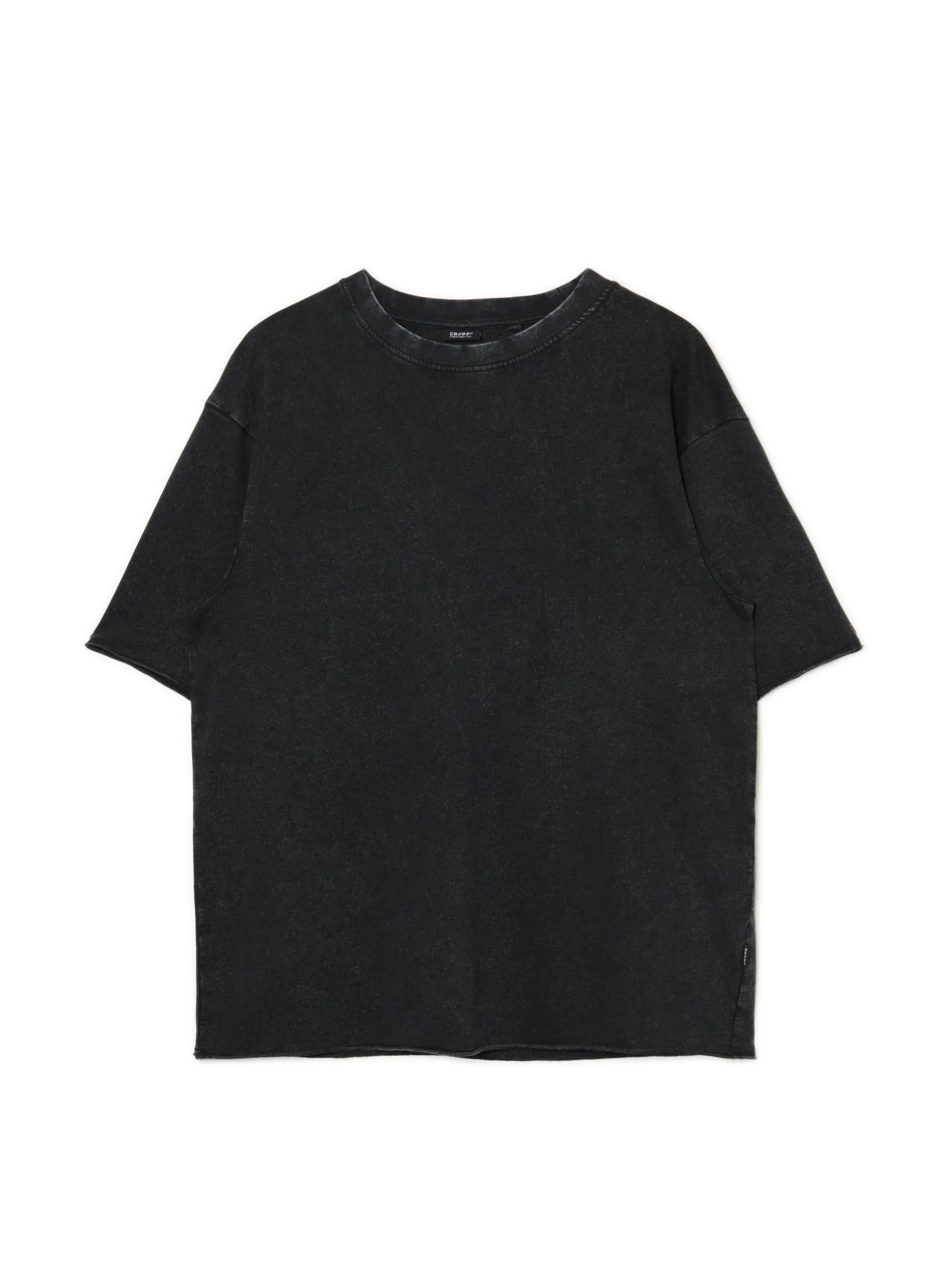Męska koszulka uszyta z bawełnianej dzianiny french terry z efektem sprania i surowym wykończeniem brzegów. 100% bawełny luźny fason z obniżoną linią ramion krótkie, swobodne rękawy surowe wykończenie brzegów efekt sprania na całości Wzrost modela: 185 cm