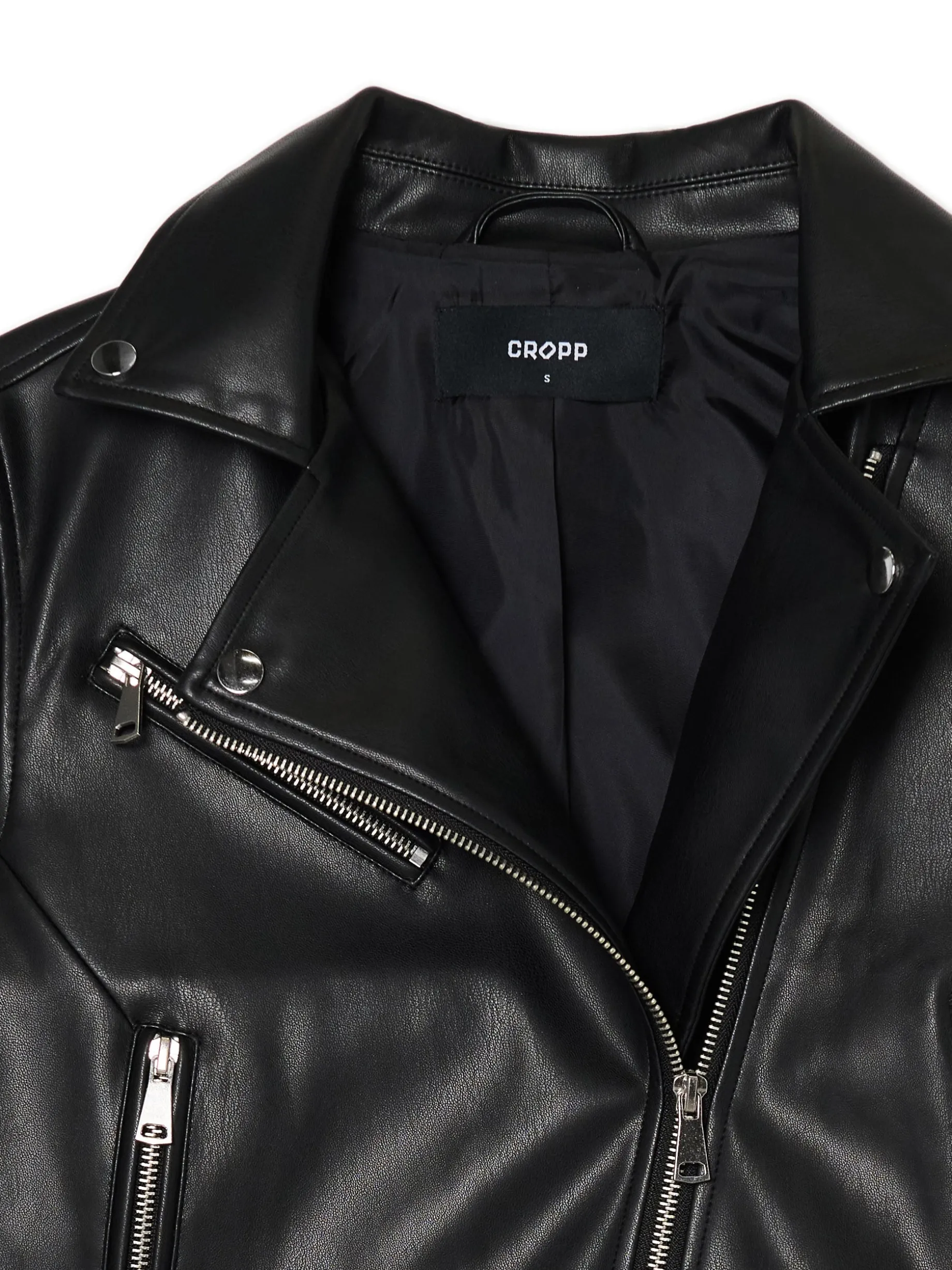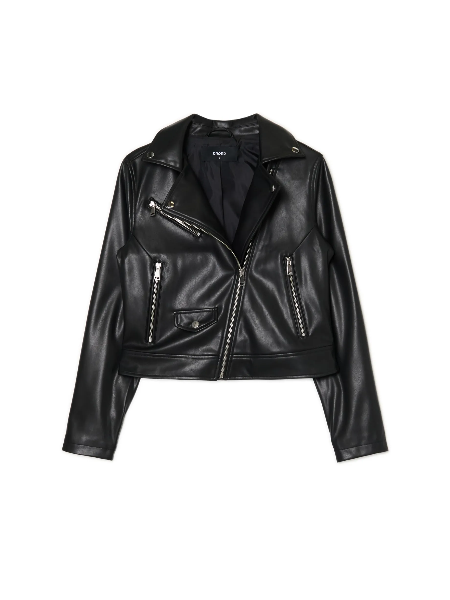 Damska kurtka typu biker, wykonana ze sztucznej skóry. Ten czarny klasyk będzie fitował z sukienkami, koszulkami i topami. kurtka typu biker z imitacji skóry zapinana na zamek na całej długości kołnierz z szerokimi klapami ozdobne napy i metalowe elementy trzy kieszenie z zapięciem na zamek