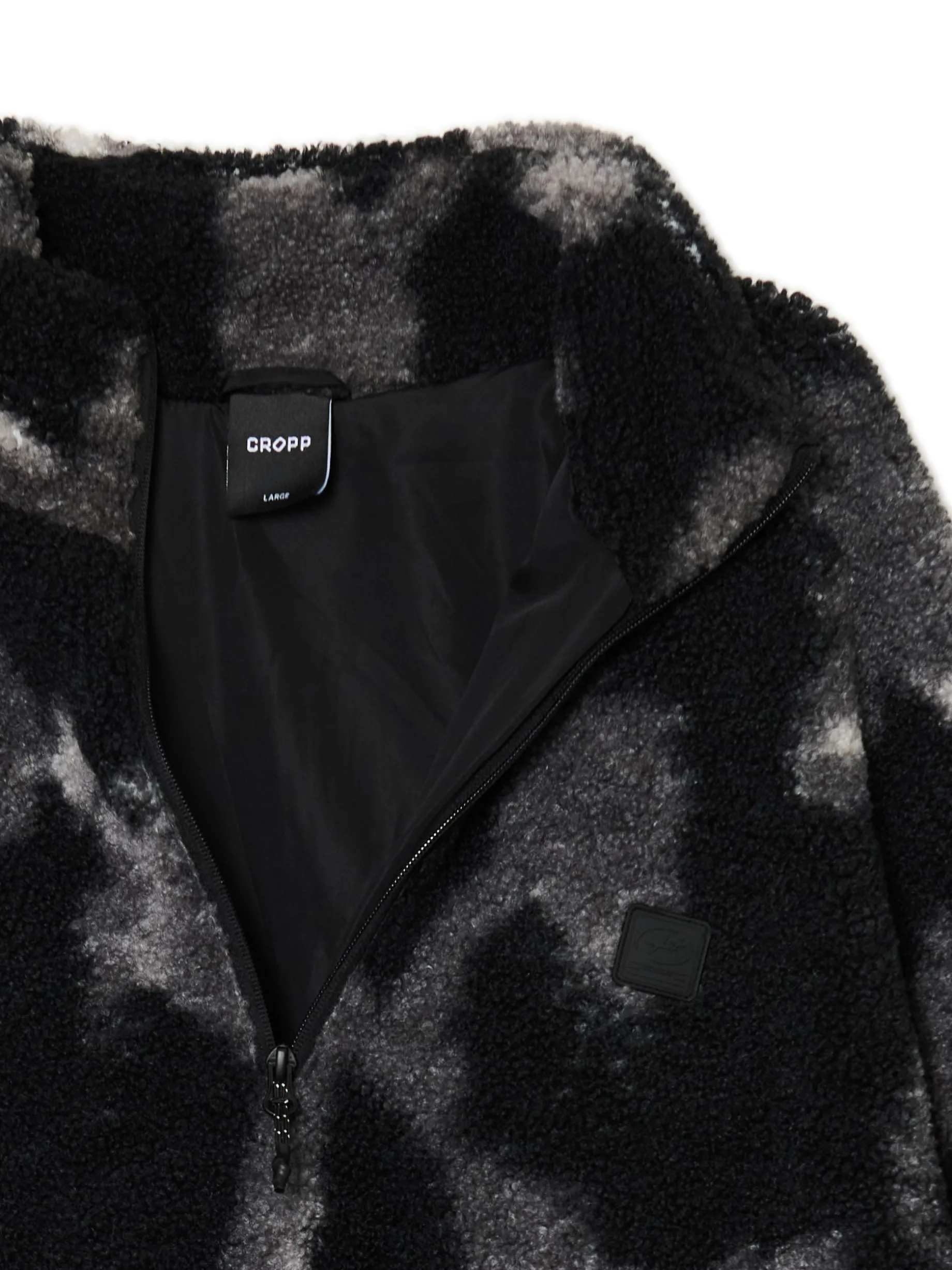 Bluza męska uszyta z imitacji baranka z mozaiki kolorów – czarnego i białego. Od wewnątrz otuli Cię miękkie i przyjemne w dotyku wykończenie. Oldschoolowy item w nowoczesnym wydaniu specjalnie dla Ciebie. bluza typu sherpa o regularnym kroju uszyta z miękkiego, pluszowego materiału wykończenie na podszyciu ze sztucznego baranka stójka zapinana na suwak długie rękawy zakończone gumką otwarte kieszenie po bokach efekt tie-dye na całości naszywka Cropp