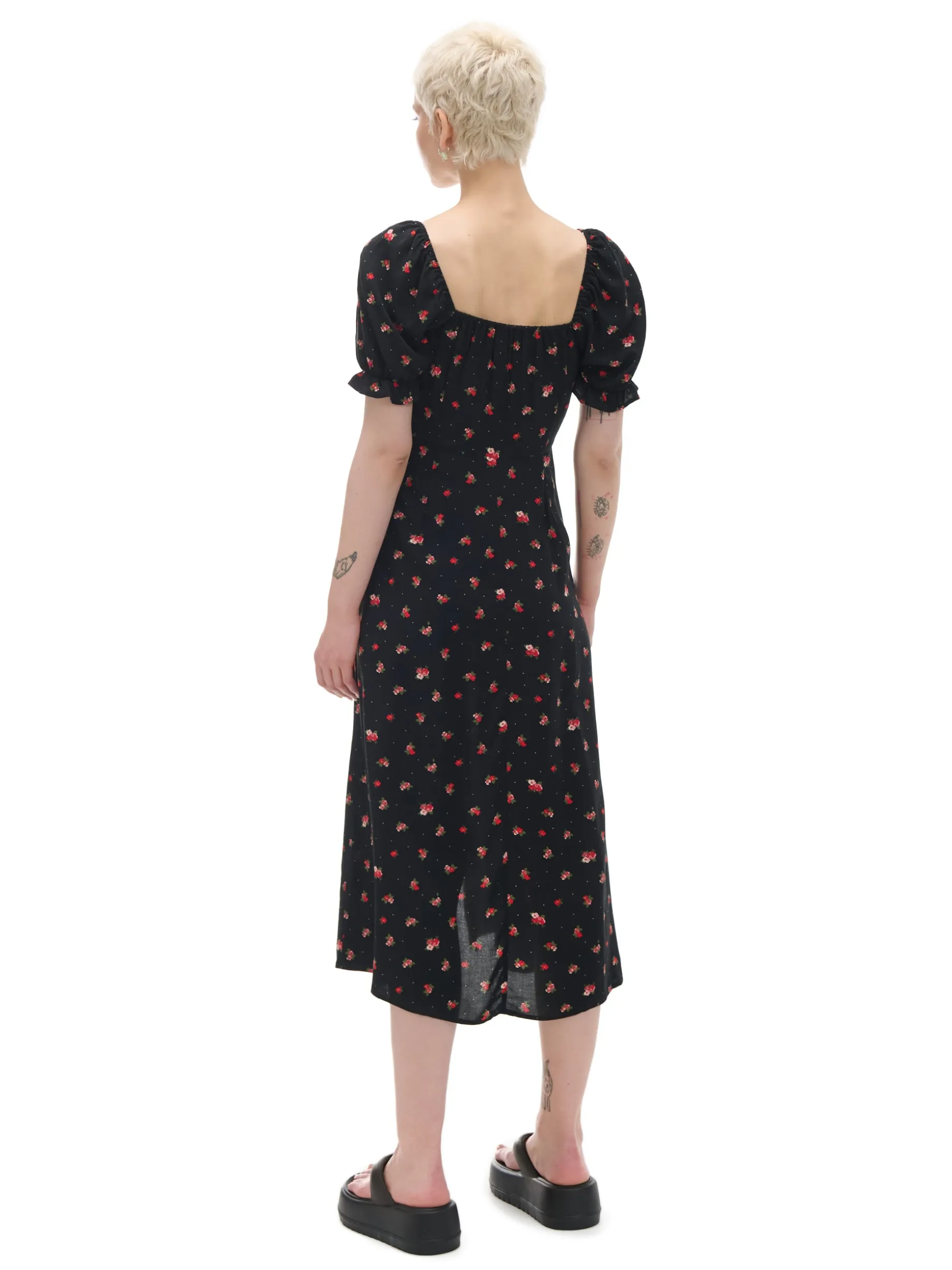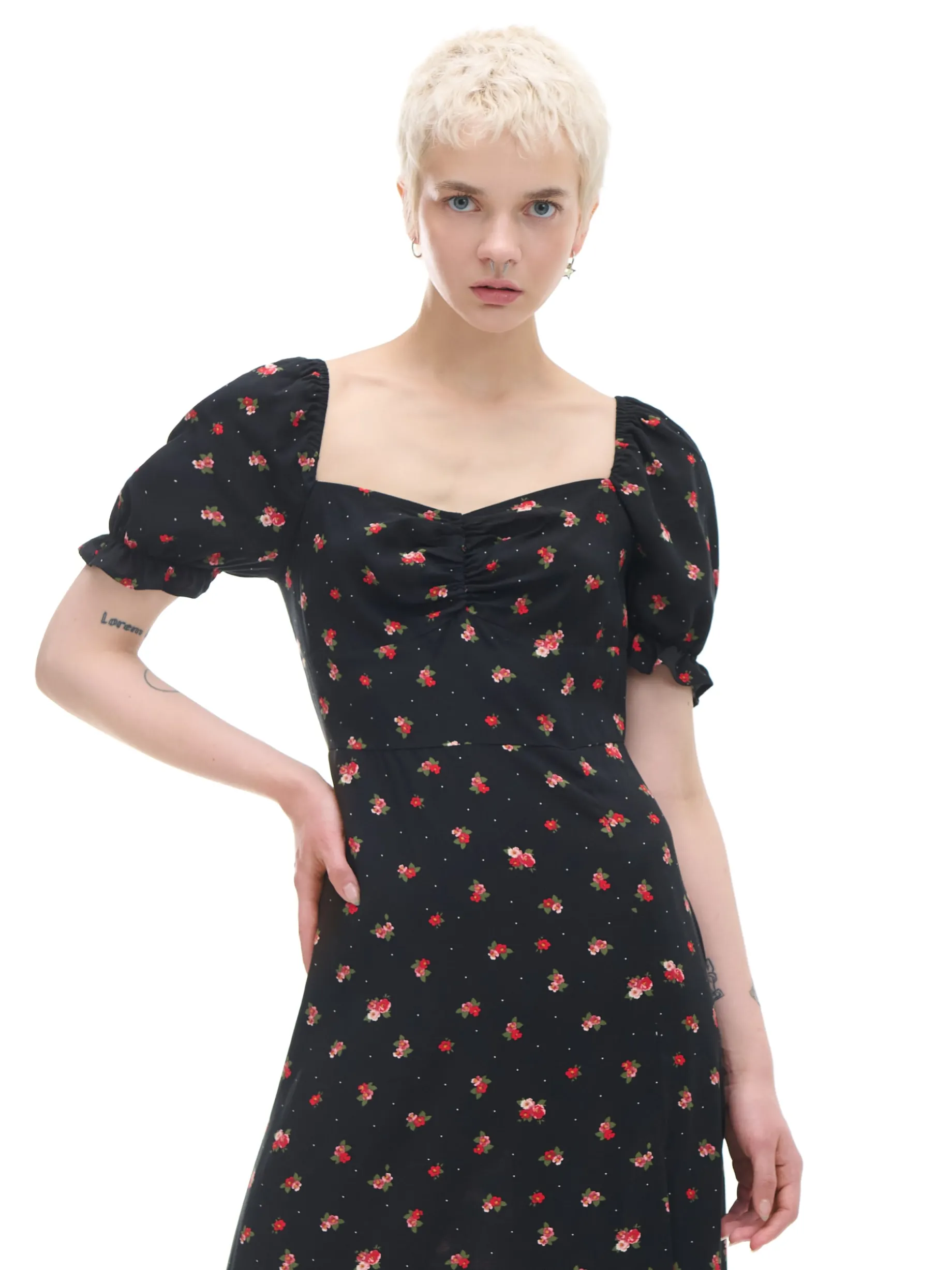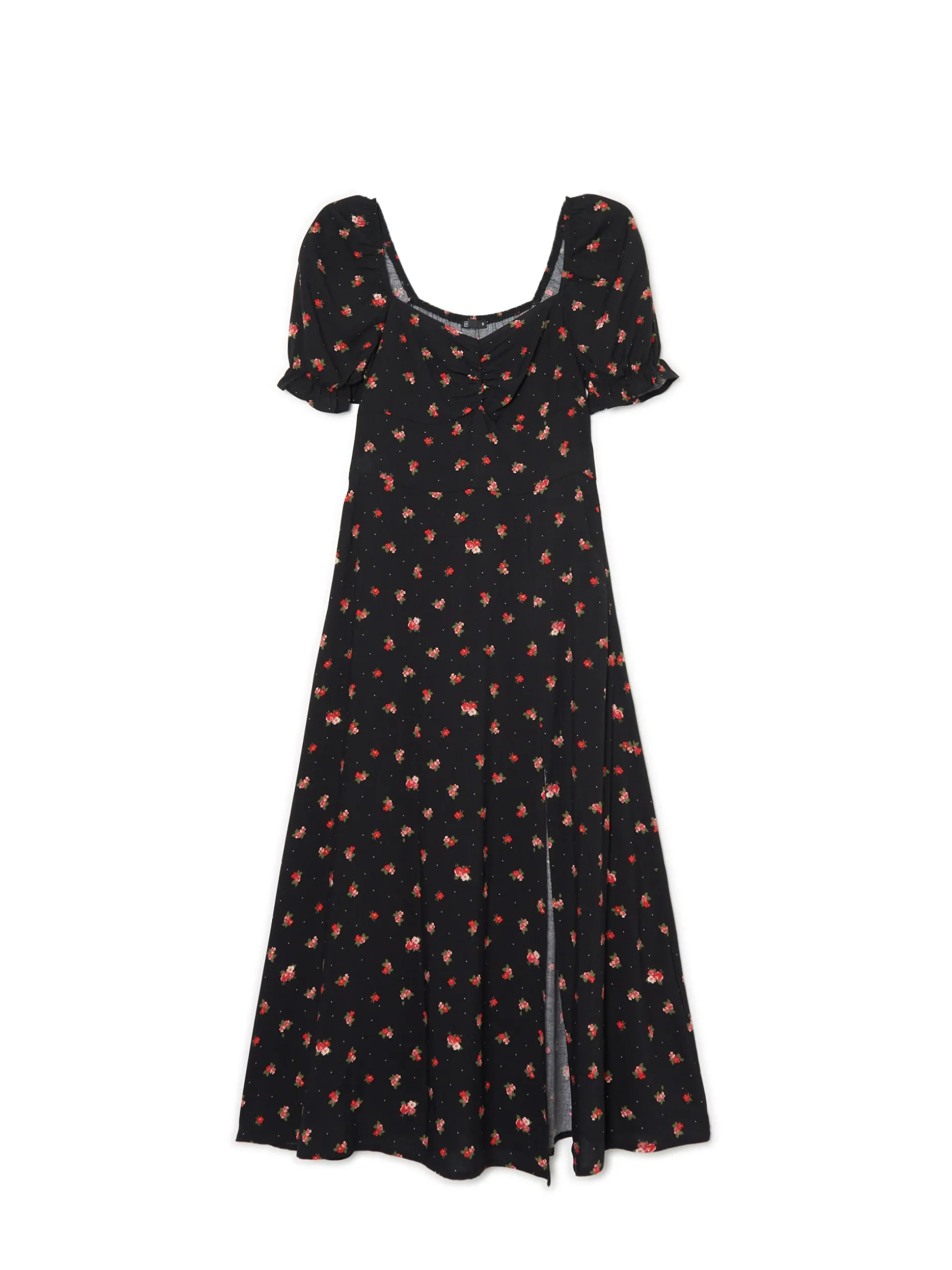 Delikatna damska czarna sukienka z kwiatowym wzorem idealna na letnie dni. 100% wiskozy długość midi rozcięcie z boku dekoracyjne marszczenie pod biustem krótkie, bufiaste rękawy zakończone gumką