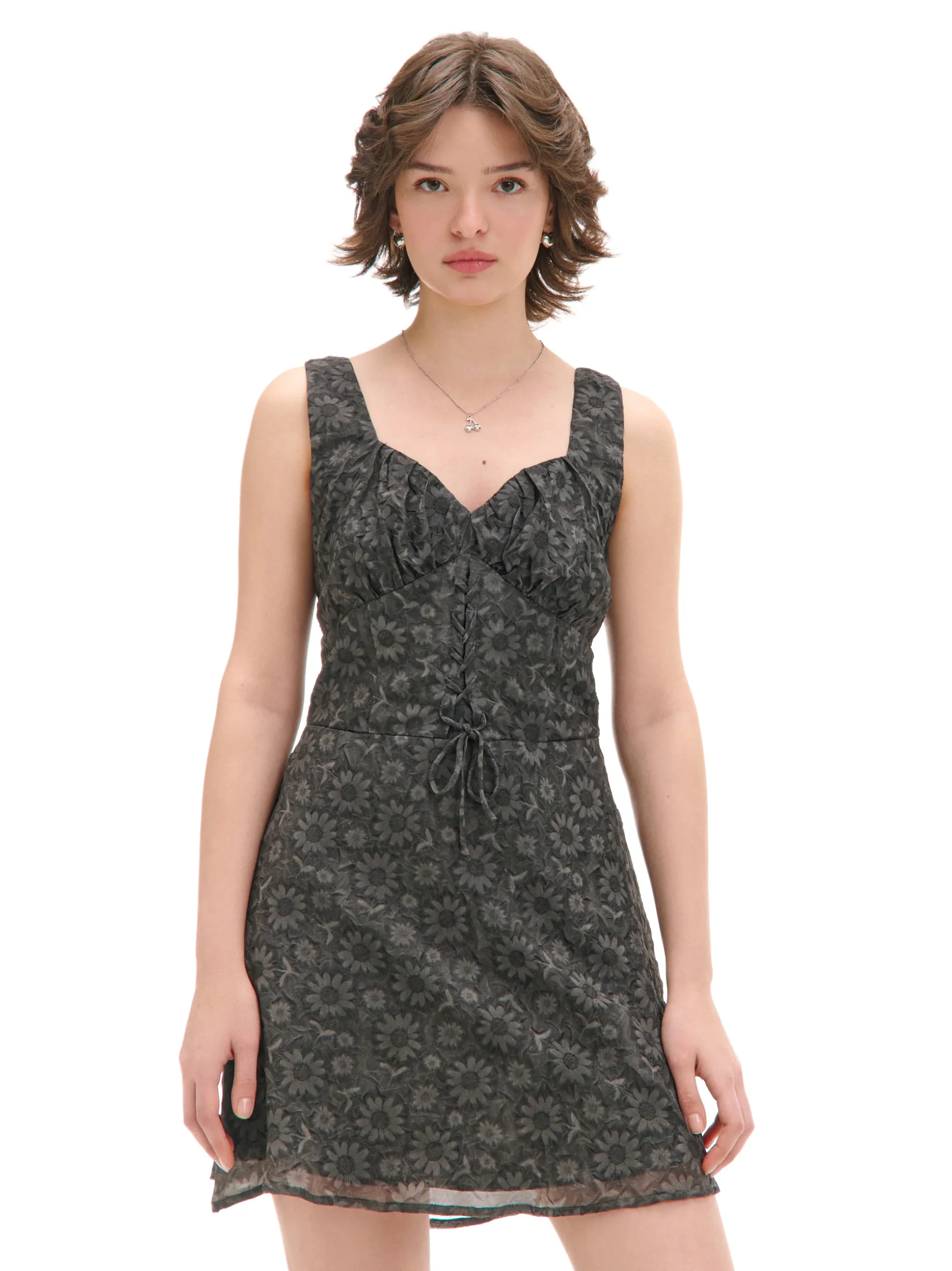 Damska sukienka w czarnym kolorze, uszyta z lekkiego materiału z delikatnym wzorem w kwiaty na całym materiale. Idealna na letnie spontany! lekki materiał długość mini rozszerzany dół zapięcie na kryty zamek z tyłu szersze ramiączka głęboki dekolt w kształcie litery V zaszewki modelujące biust i talię dekoracyjne marszczenie pod biustem sznurowanie i ozdobne przeszycia kwiatowy wzór