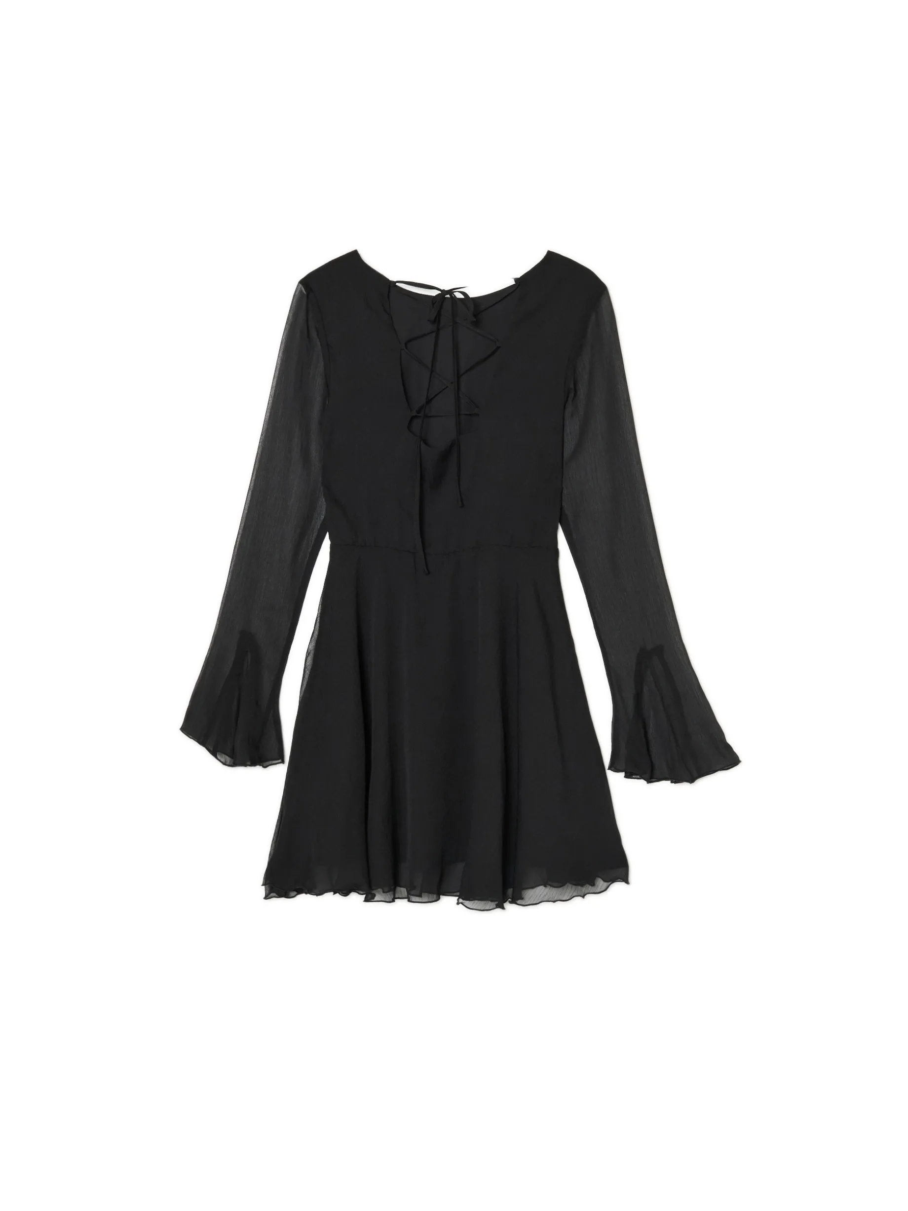 Łap szyfonową damską sukienkę z delikatnymi falbanami na dole i przy rękawach. Ten klasyczny czarny kolor będzie wyglądał sztosowo podczas świątecznych meetingów z rodziną i nie tylko. uszyta z szyfonowej tkaniny długość mini i dopasowany krój lekko rozkloszowany dół odcięcie w talii zapięcie na kryty zamek z boku dekolt w łódkę rękawy z gumką i efektowną falbanką ozdobne wiązanie na plecach ozdobne marszczenia