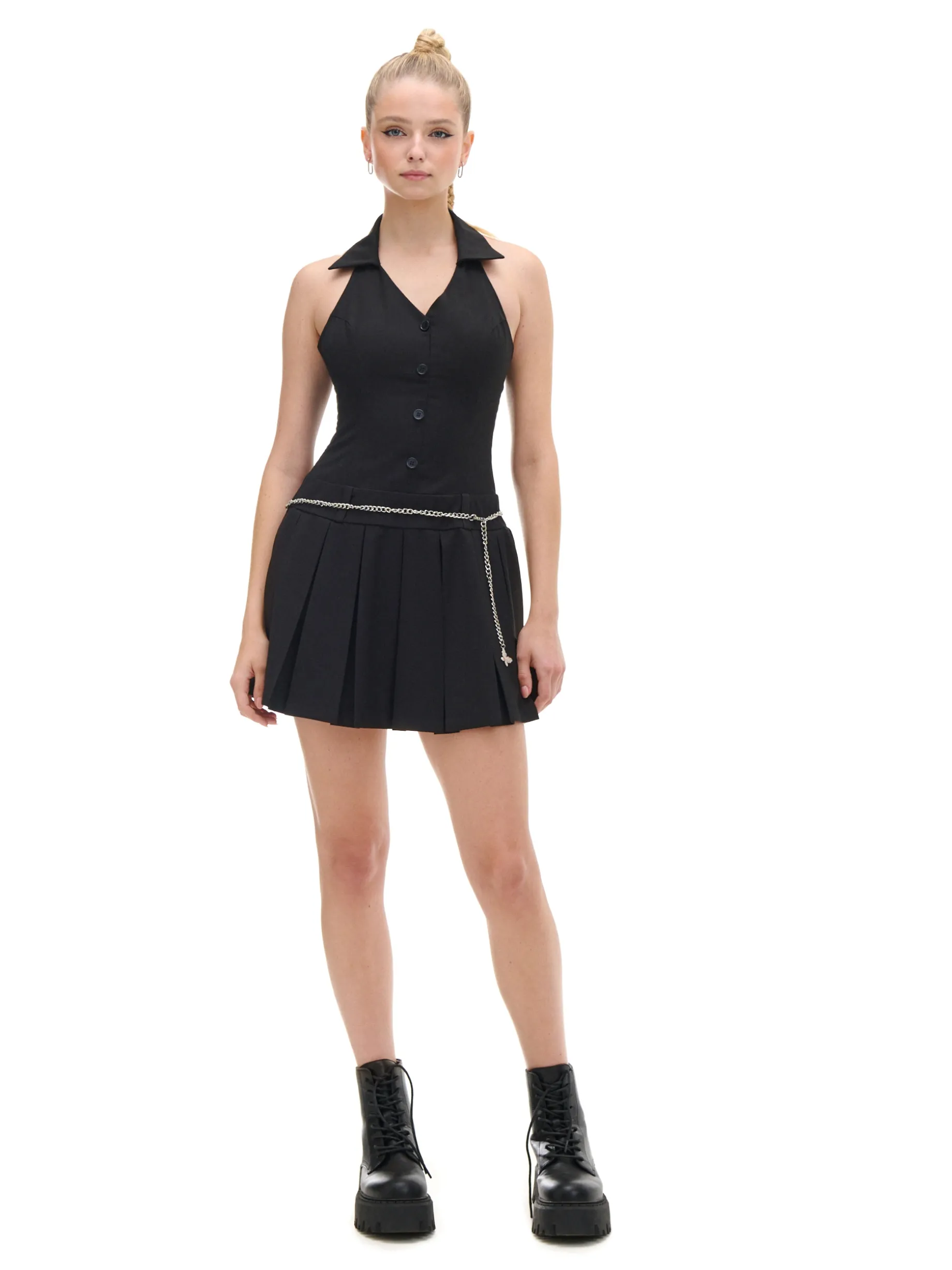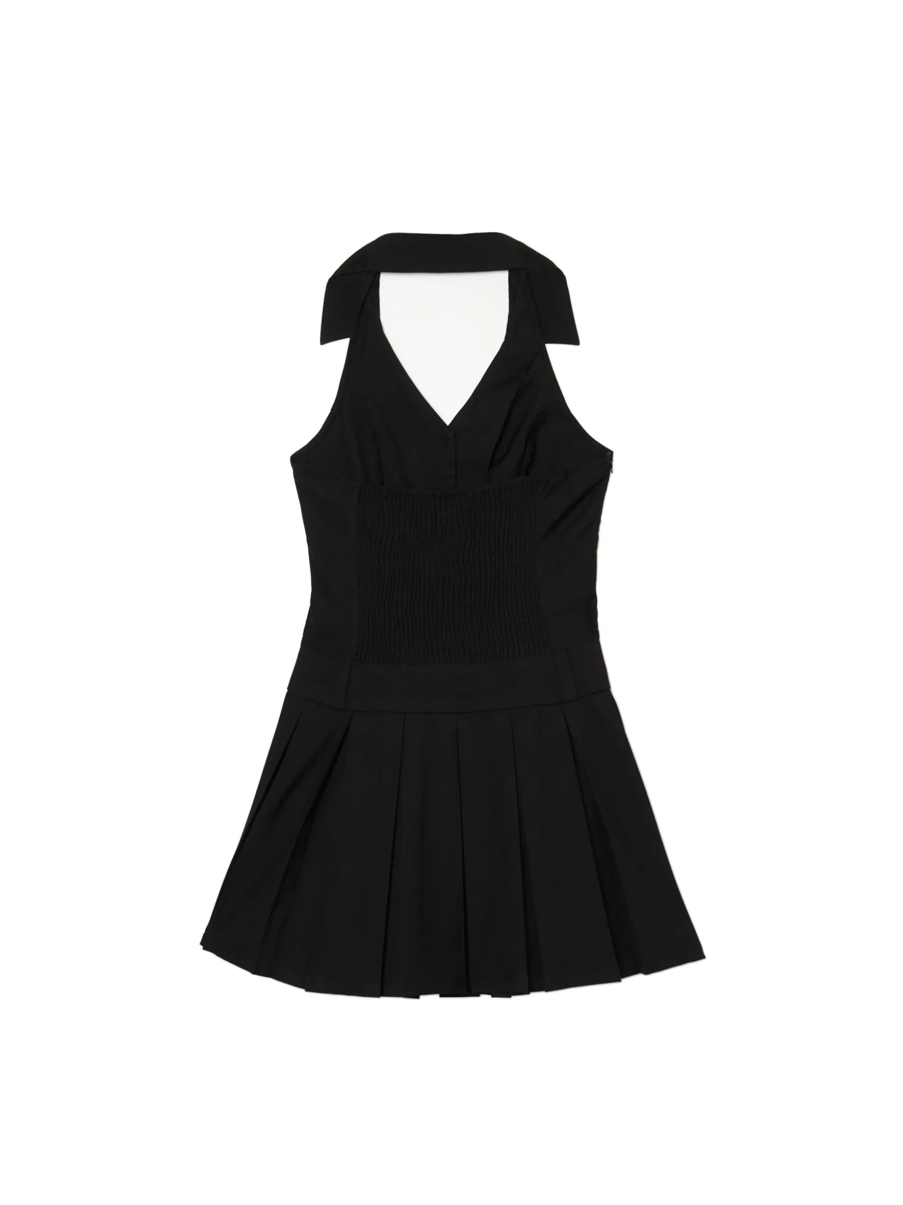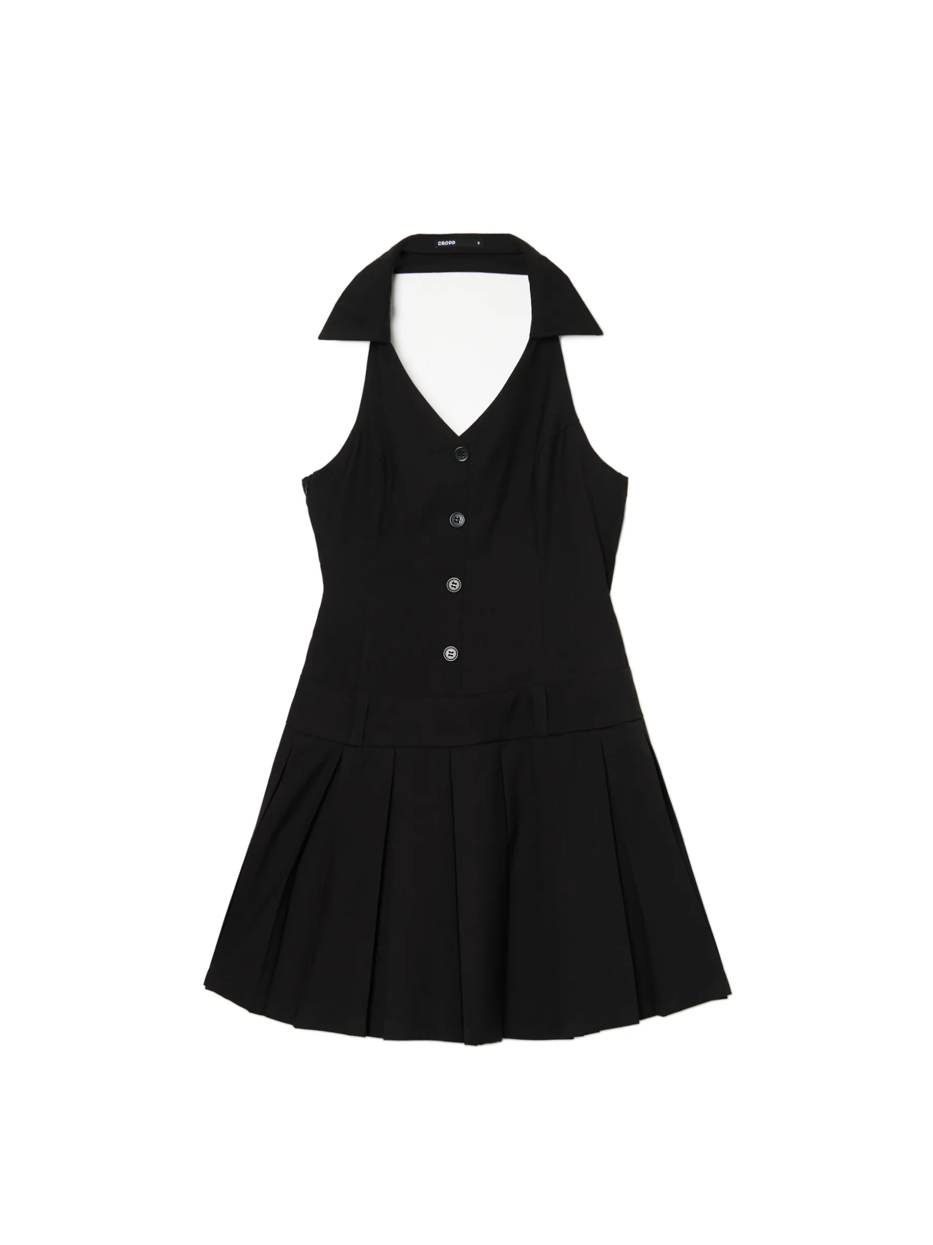 Damska sukienka o długości mini, wykonana z gładkiej mieszanki tkanin w kolorze czarnym. Wygląda fantastycznie w wersji soft ze sportowymi, jak i eleganckimi dodatkami. Sama zdecyduj! tkanina z dodatkiem elastycznych włókien, dzięki czemu model dopasowuje się do zmieniającej się sylwetki długość mini zapięcie na kryty zamek z boku elastyczna wstawka z tyłu dekolt typu halter kołnierzyk, wycięcie w kształcie litery V szlufki na pasek plisowany, lekko rozkloszowany dół