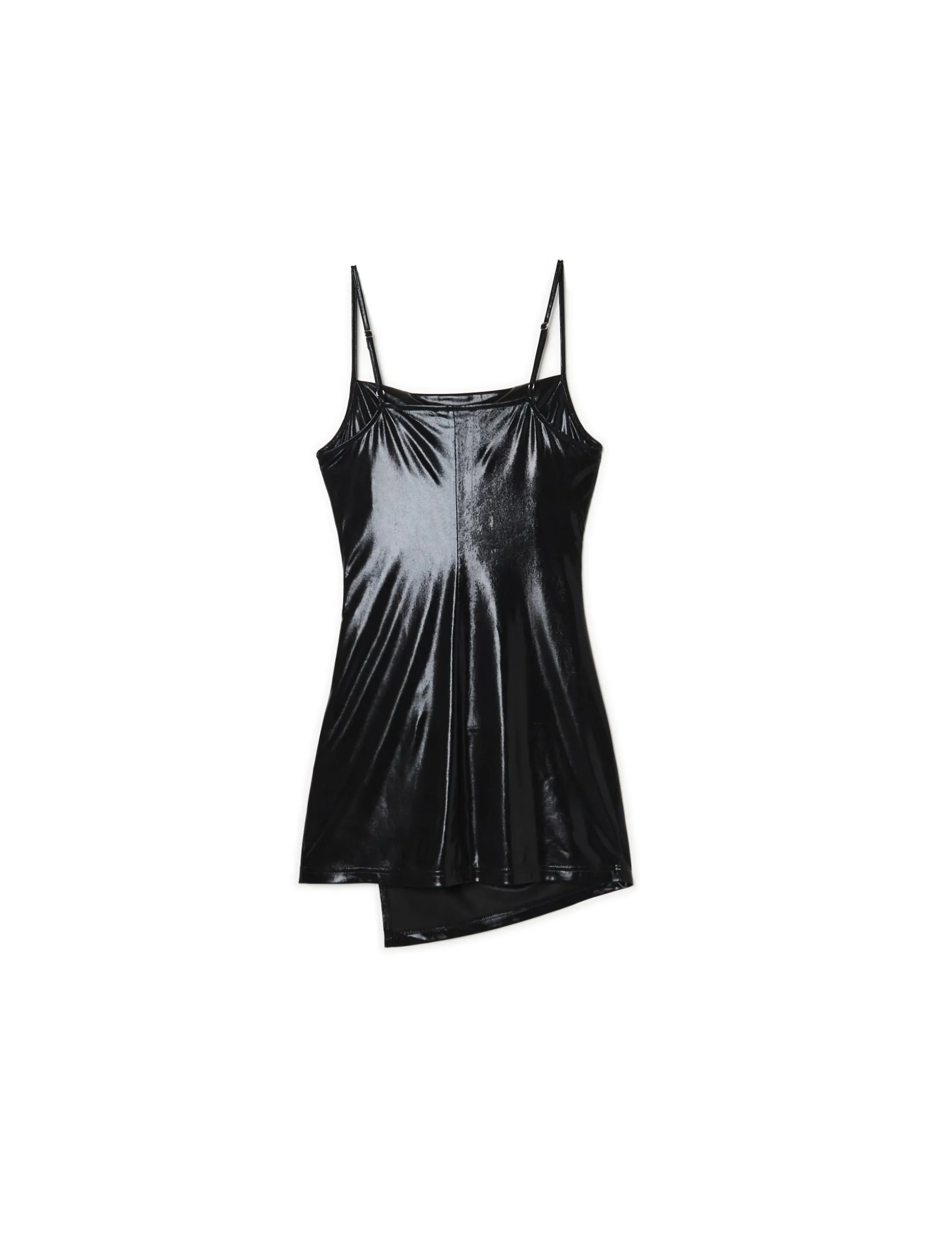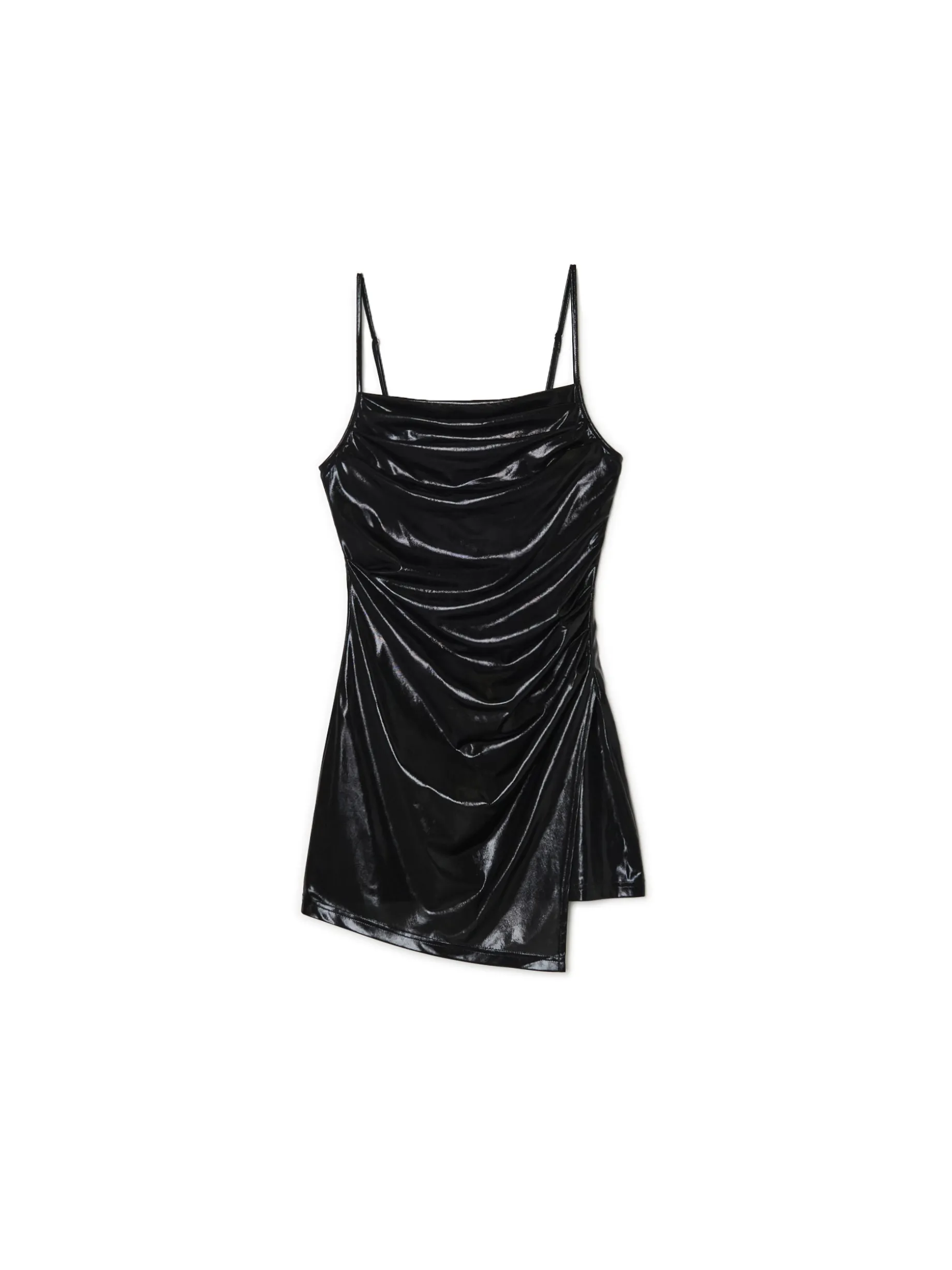 Damska sukienka mini na specjalne okazje! Uszyta z mieszanki dzianin w połyskującej czerni. Wyposażona w wąskie, regulowane ramiączka, dekoracyjne marszczenia i zawijany dół. Sztosowy item na sylwestra lub spontany z ekipą. dzianina z domieszką elastycznych włókien dopasowany krój podkreślający sylwetkę długość mini dekolt w szpic wąskie ramiączka z regulacją długości ozdobne marszczenia dekoracyjna zakładka z przodu