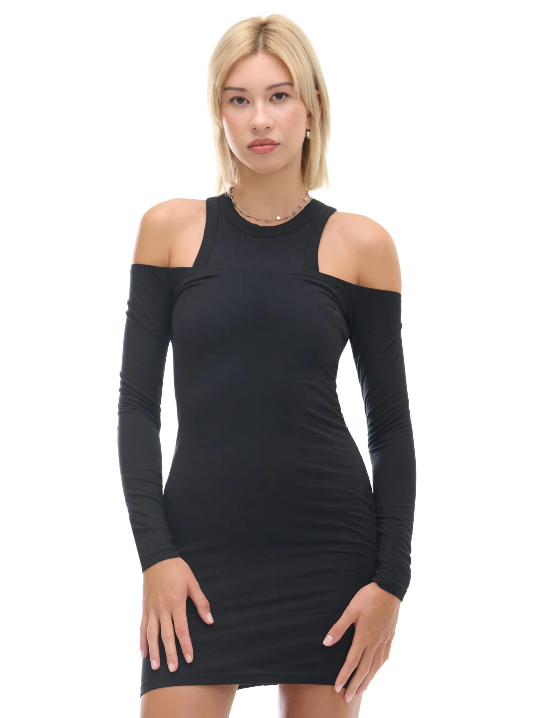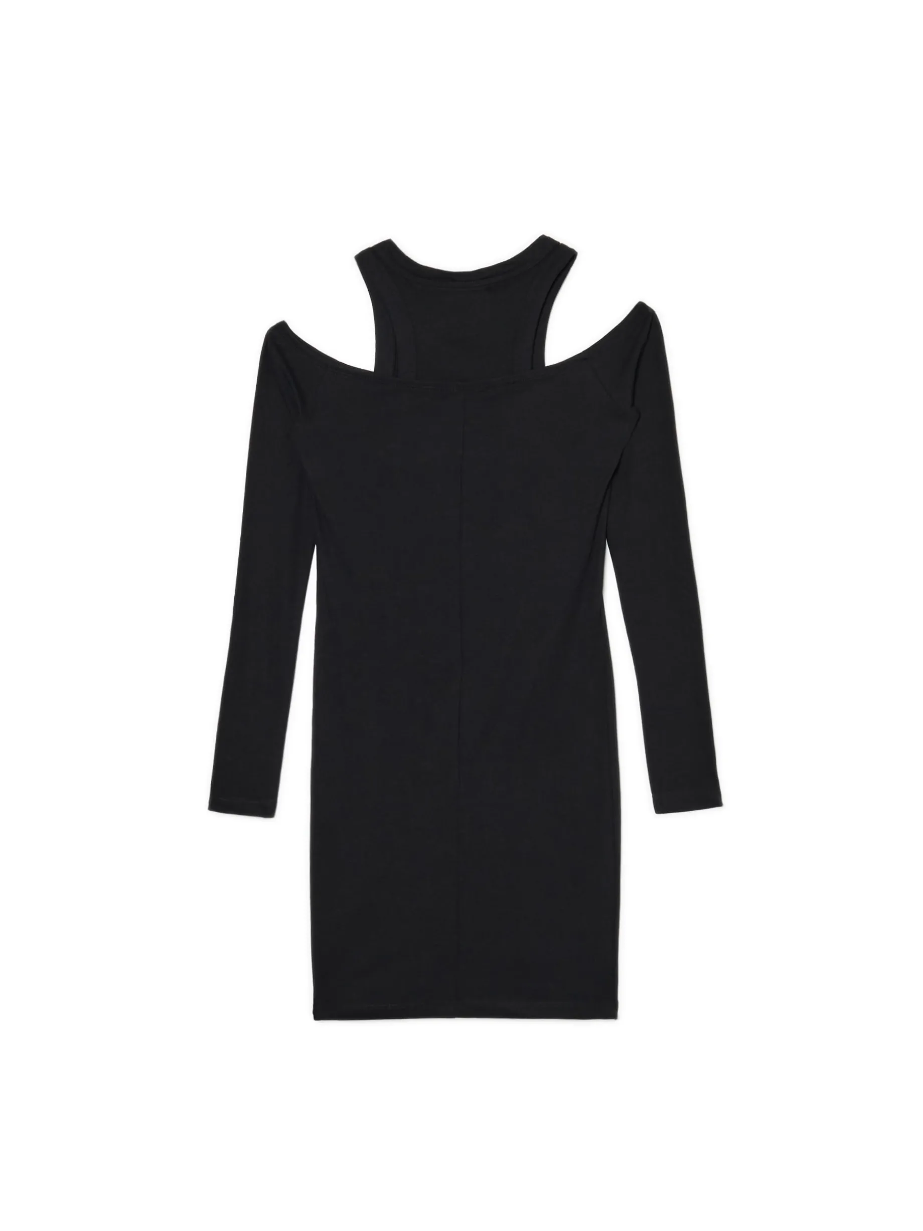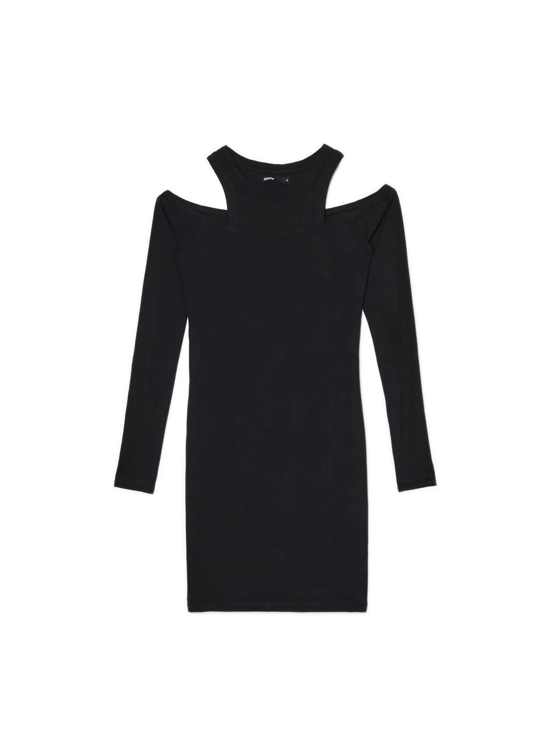 Damska sukienka o długości mini, uszyta z dwuwarstowej, półtransparentnej dzianiny. Te efektowne wycięcia na ramionach dopełniają stylizację. dzianinowy materiał z bawełną długość mini dopasowany krój podkreślający sylwetkę długi rękaw z wycięciami na ramionach półokrągły dekolt z lamówką Wzrost modelki: 177 cm