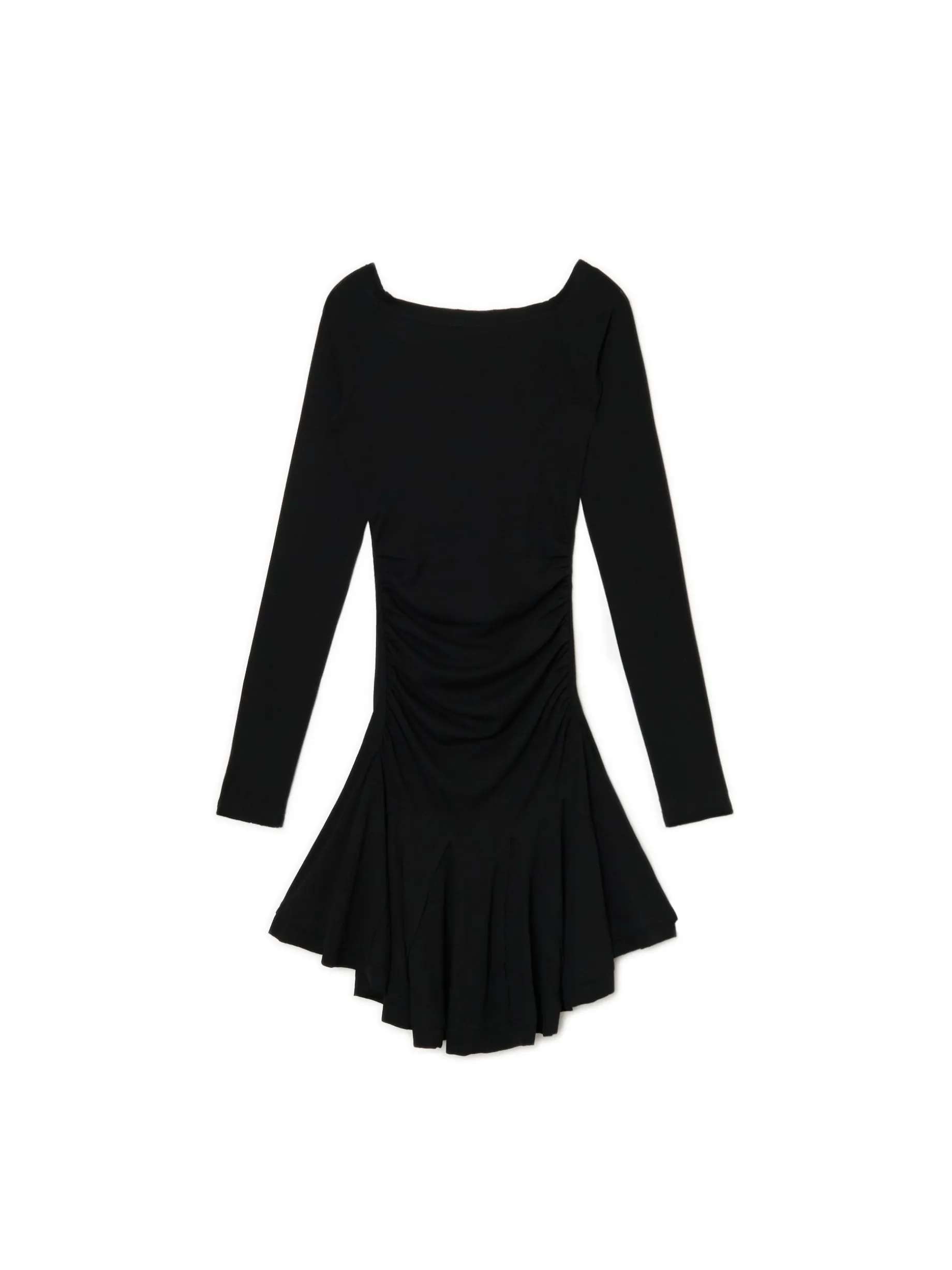 Krótka czarna sukienka, uszyta z lekkiej dzianiny zawierającej wiskozę. długość mini krój A dekolt typu łódka długie, proste rękawy marszczenia w talii plisowany dół surowe wykończenie brzegów Wzrost modelki: 177 cm