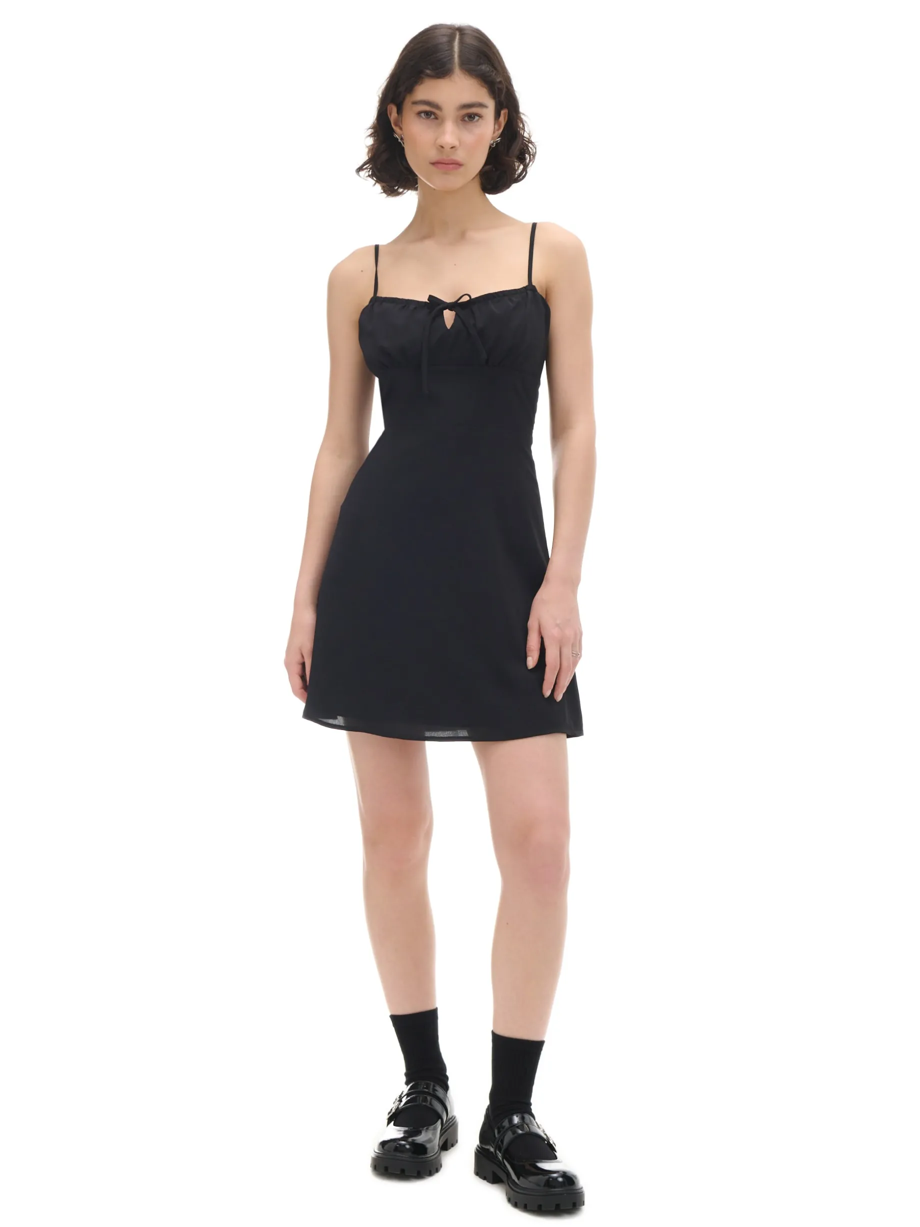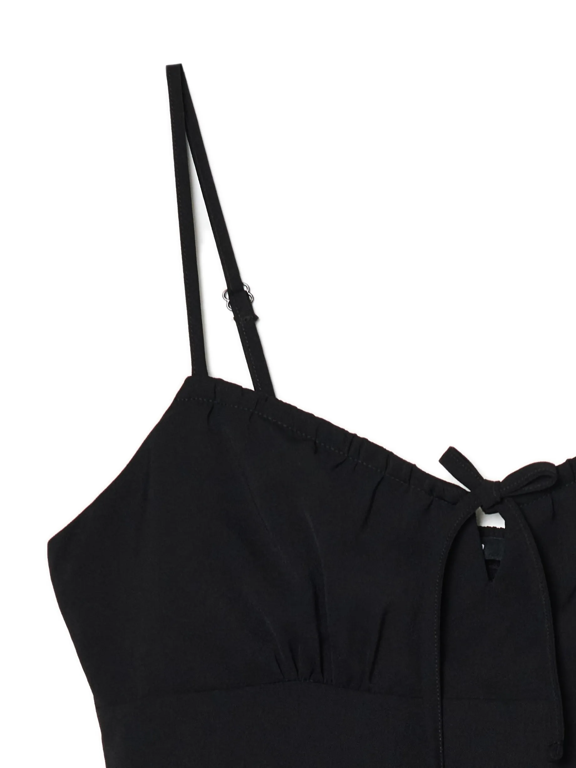 Lekka, zwiewna sukienka o długości mini. Idealna propozycja na lato! lekki materiał długość mini odcięcie w talii zapięcie na kryty zamek z boku dekolt w kształcie litery V elastyczna wstawka z tyłu wąskie ramiączka z regulacją długości z przodu ozdobne wiązanie Wzrost modelki: 172 cm