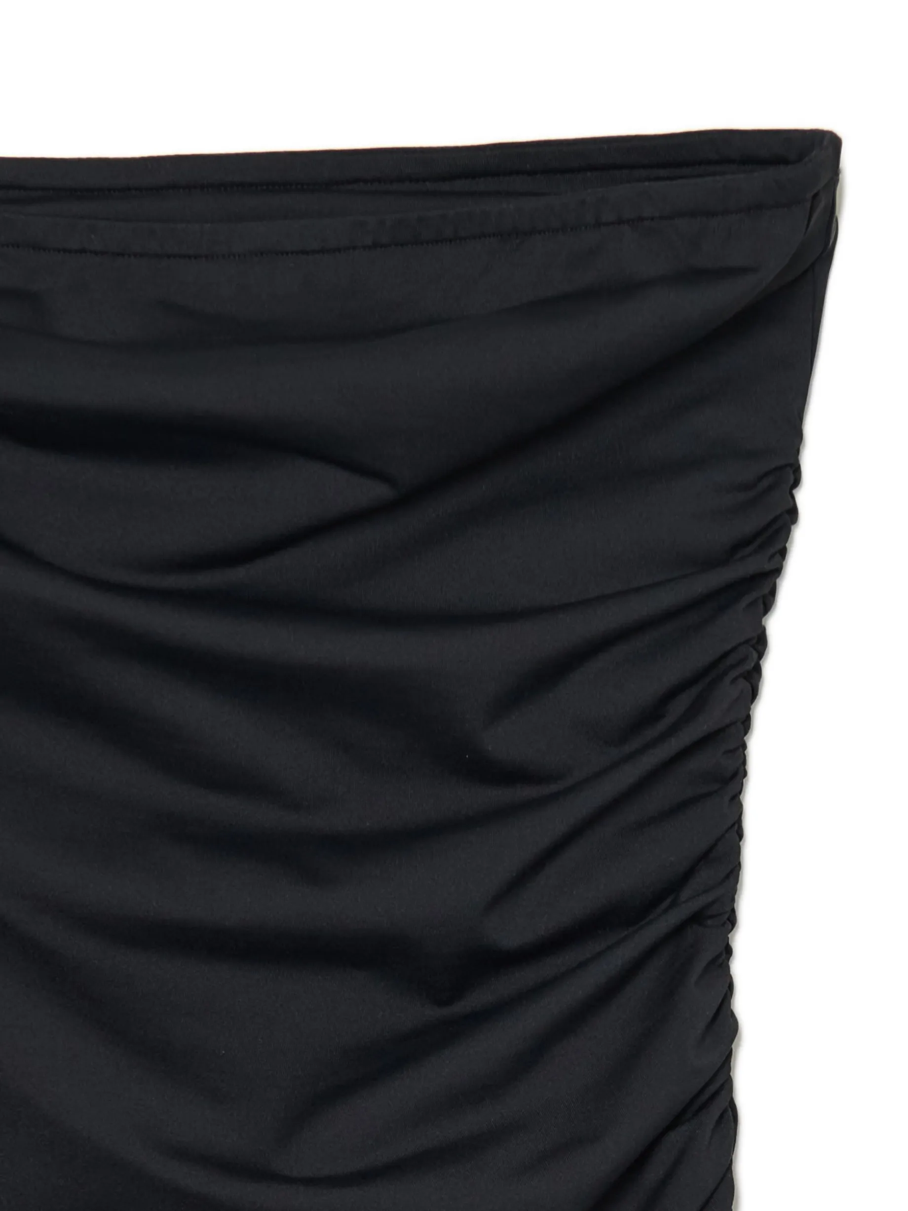 Czarna sukienka bez rękawów ze ściętym dołem i ozdobnymi marszczeniami to must have imprezowego outfitu. dzianina z dodatkiem elastycznych włókien dopasowany krój podkreślający sylwetkę długość mini bez rękawów podwójny materiał w miejscu biustu ozdobne marszczenia Wzrost modelki: 172 cm