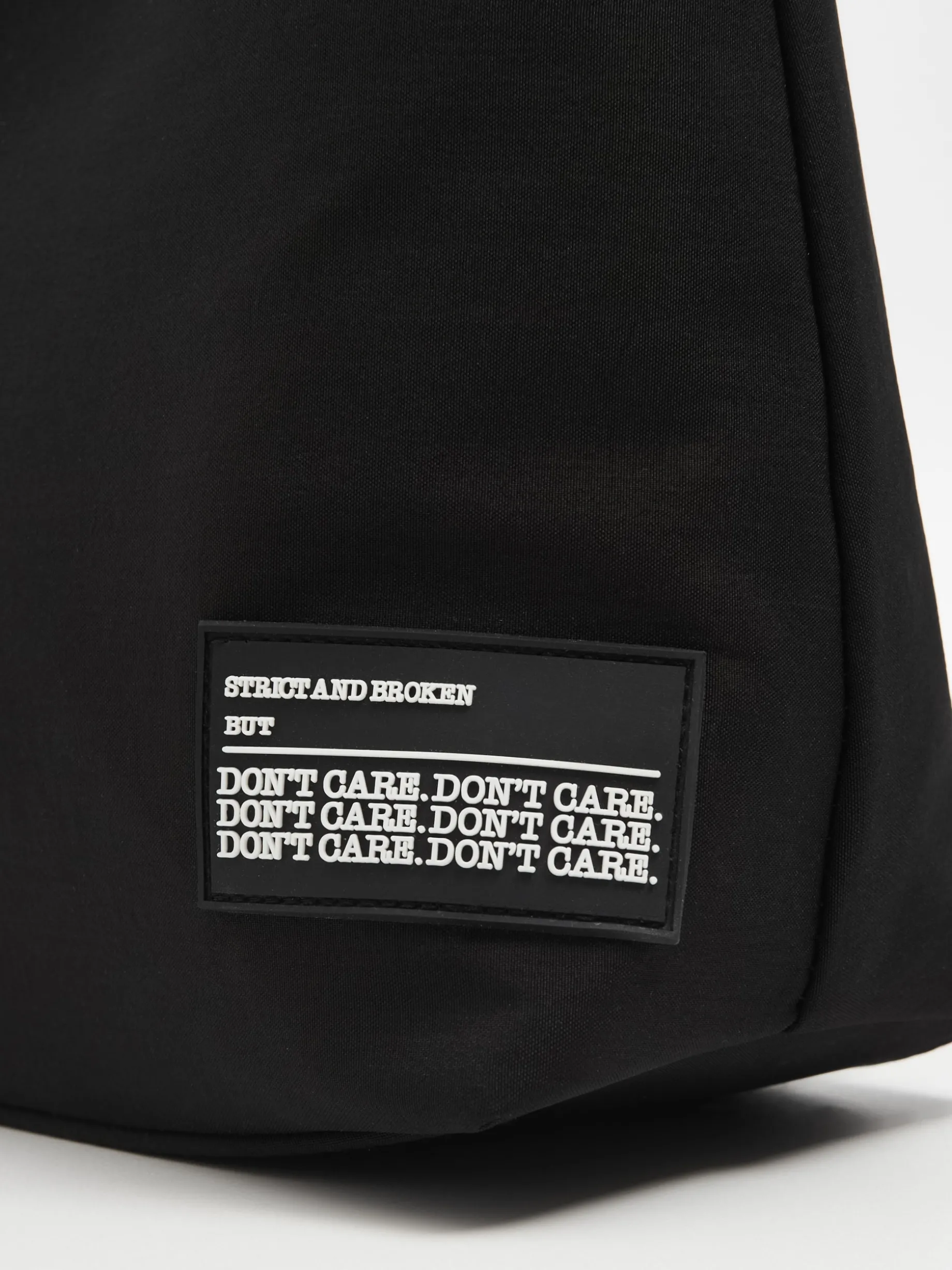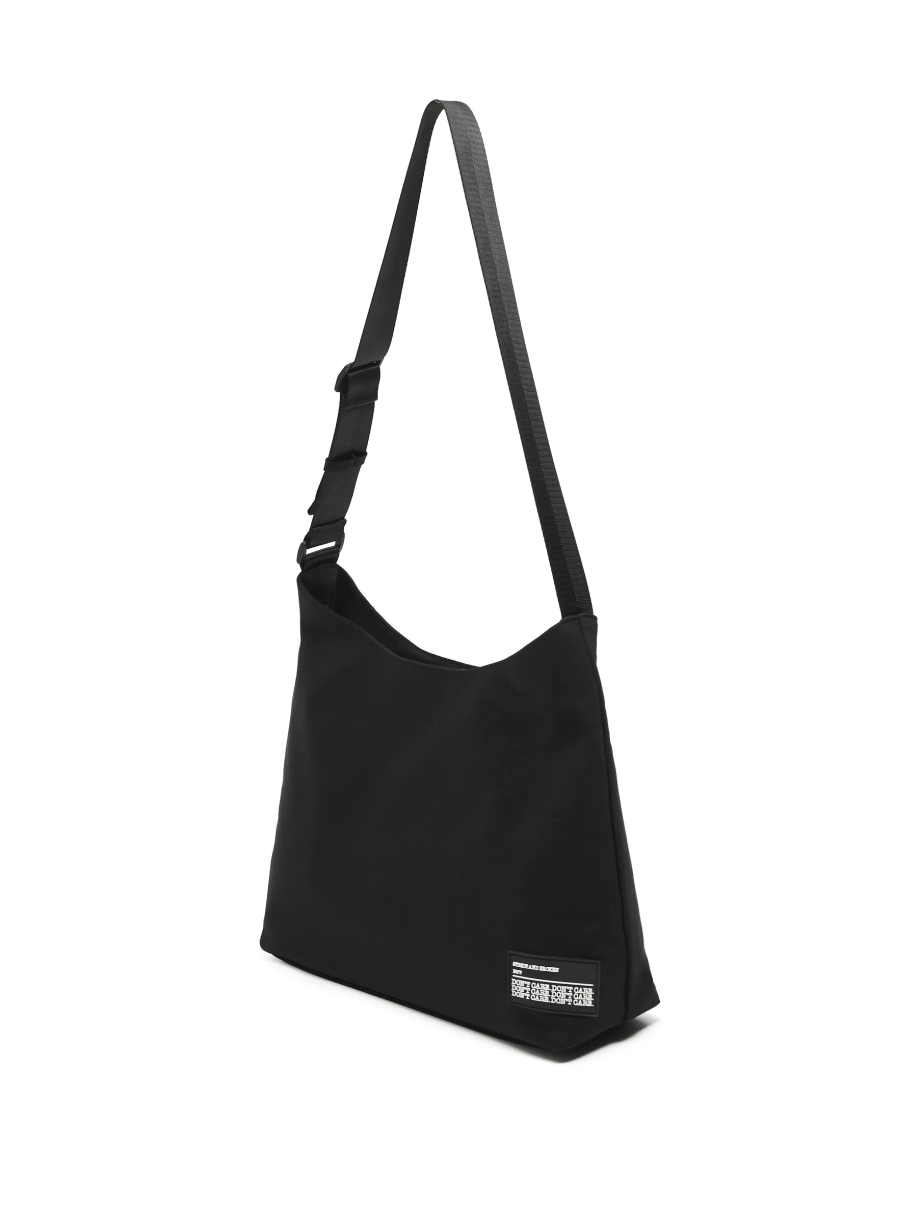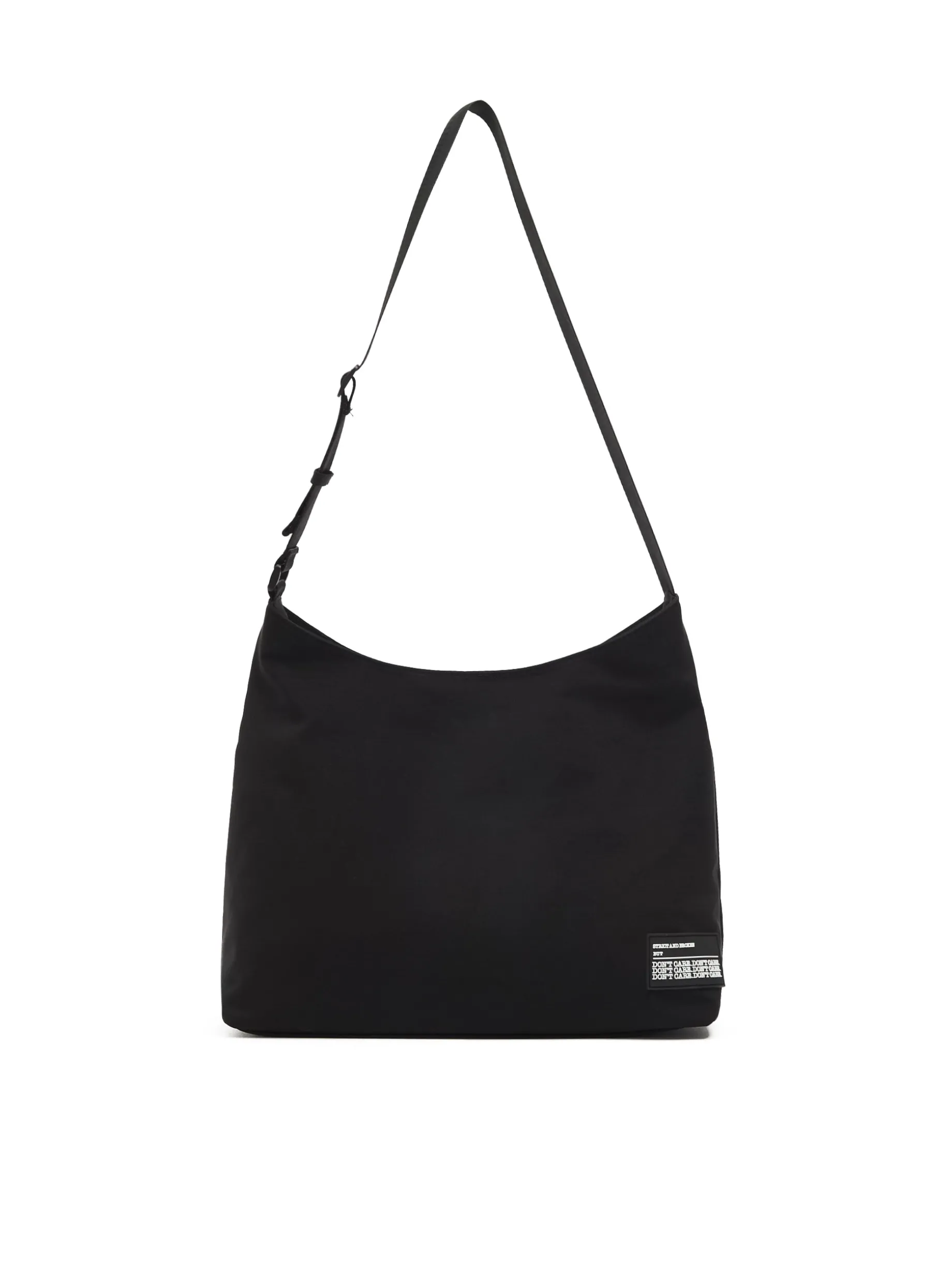 Duża czarna torba damska, wykonana z tkaniny. Pasek z regulacją, zapięcie na zamek, z przodu naszywka. Dostępne inne wersje kolorystyczne. Wymiary torebki: 32 x 37 x 12 cm