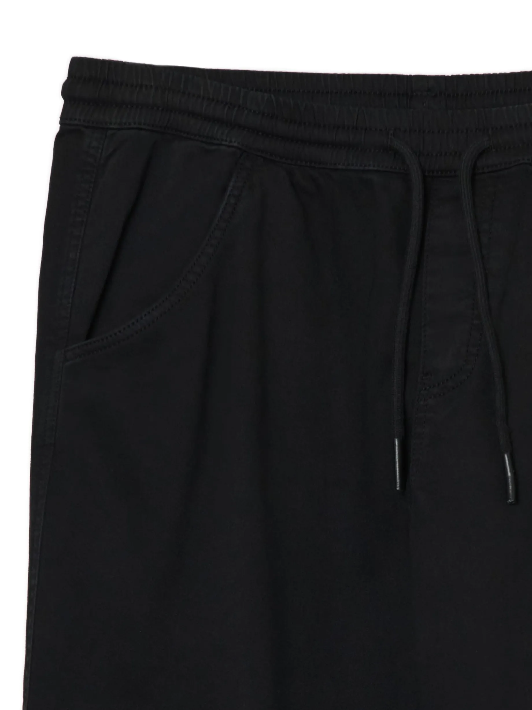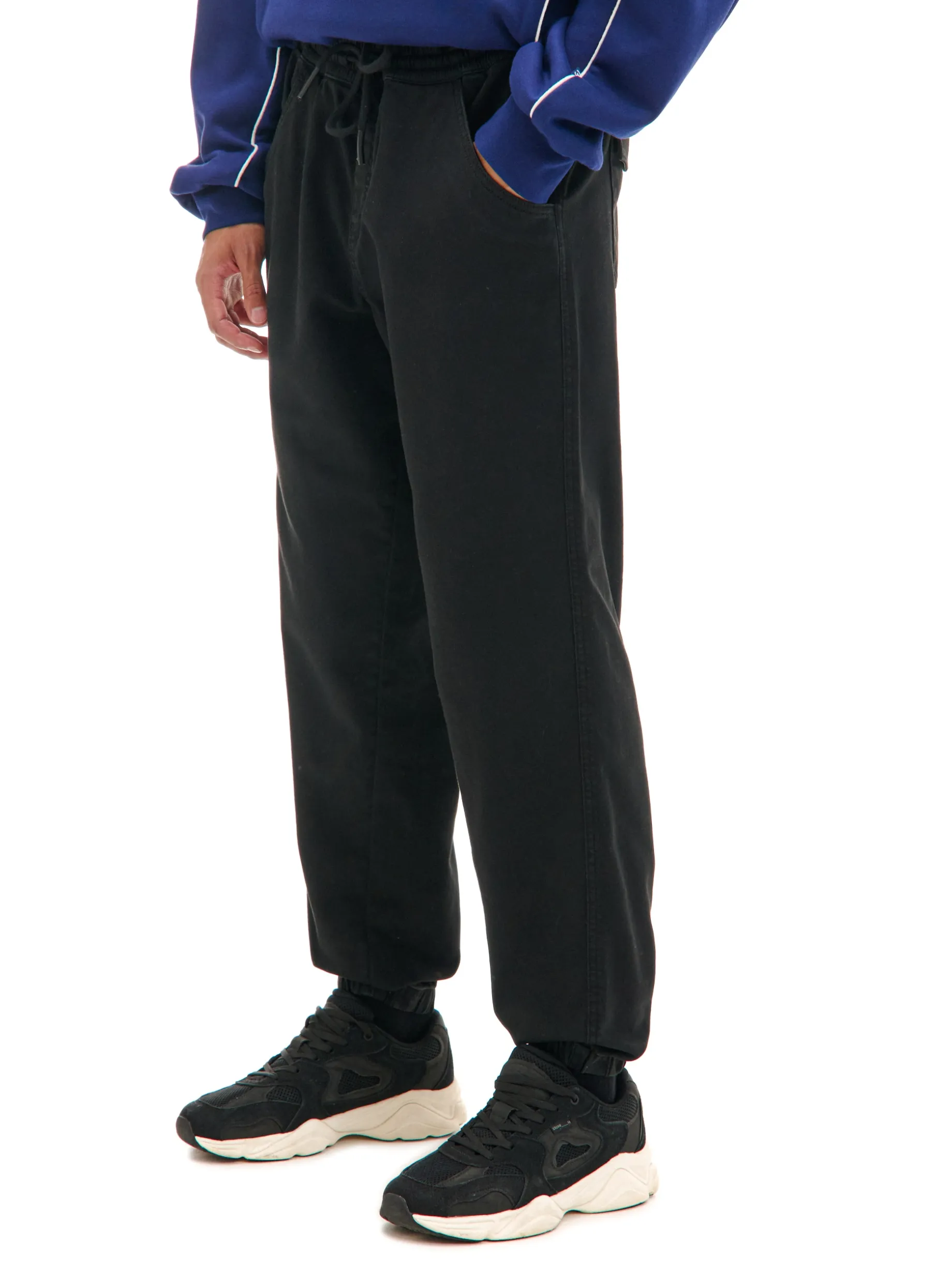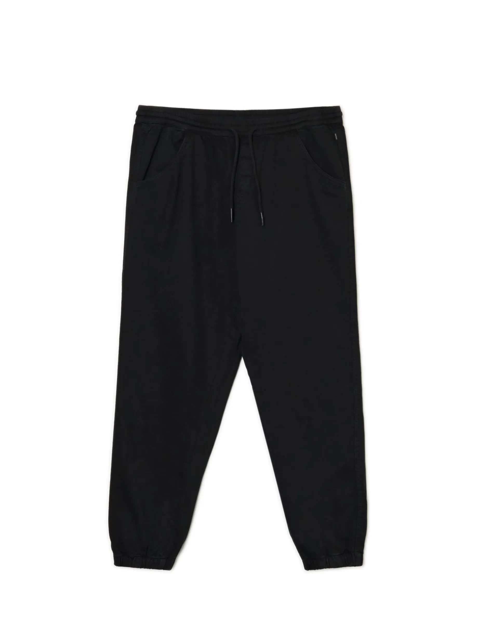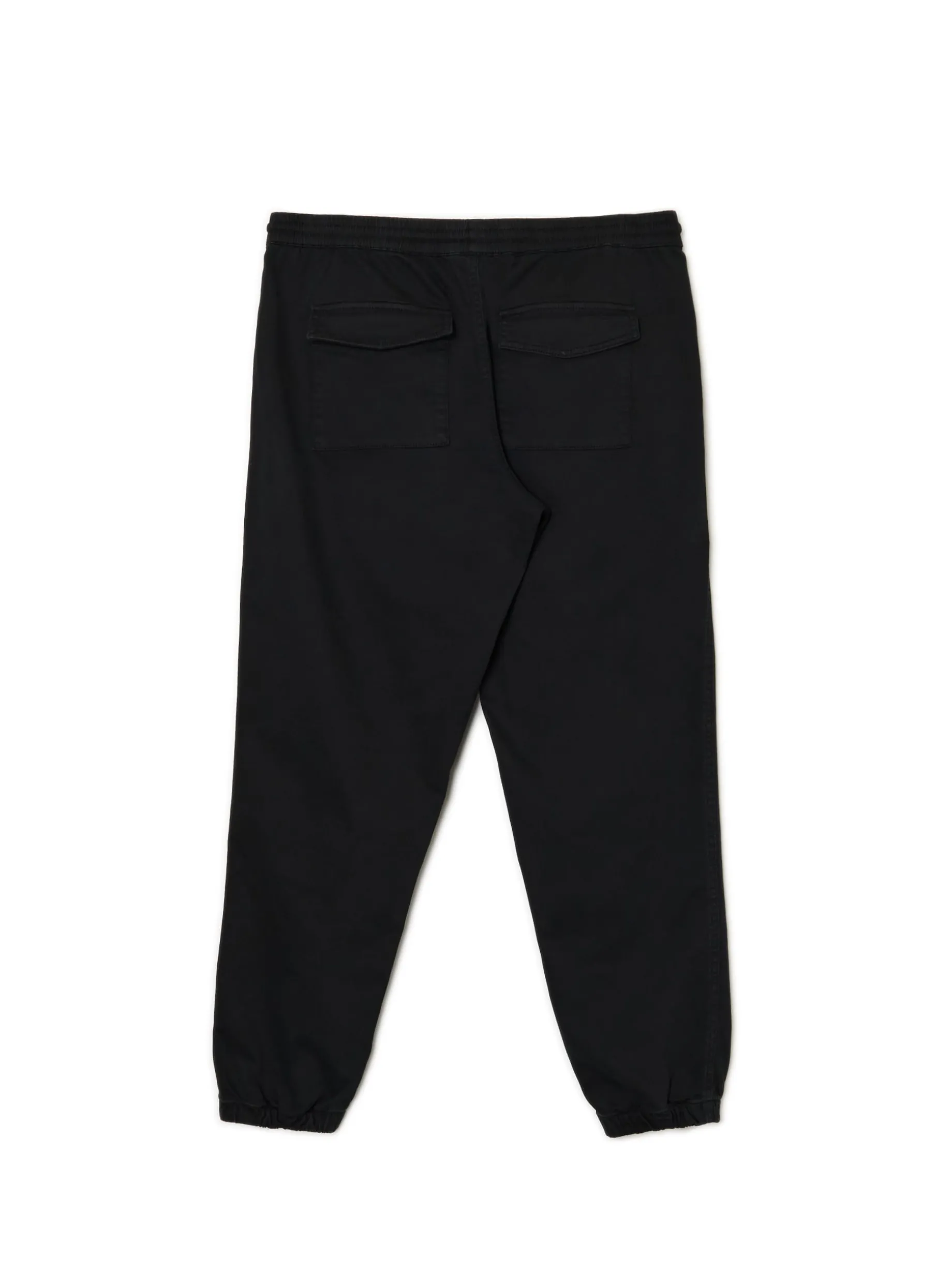 Męskie spodnie dresowe typu jogger, uszyte z czarnego materiału. Elastyczna guma w pasie i ściągacze na nogawkach dopasowują materiał do sylwetki. Wygodny item na różne okazje! joggery uszyte z elastycznej tkaniny o wysokiej zawartości bawełny swobodny, luźny krój gumka w pasie ze sznurkiem do regulacji długie nogawki wykończone ściągaczem otwarte kieszenie po bokach dwie naszywane kieszenie z patkami