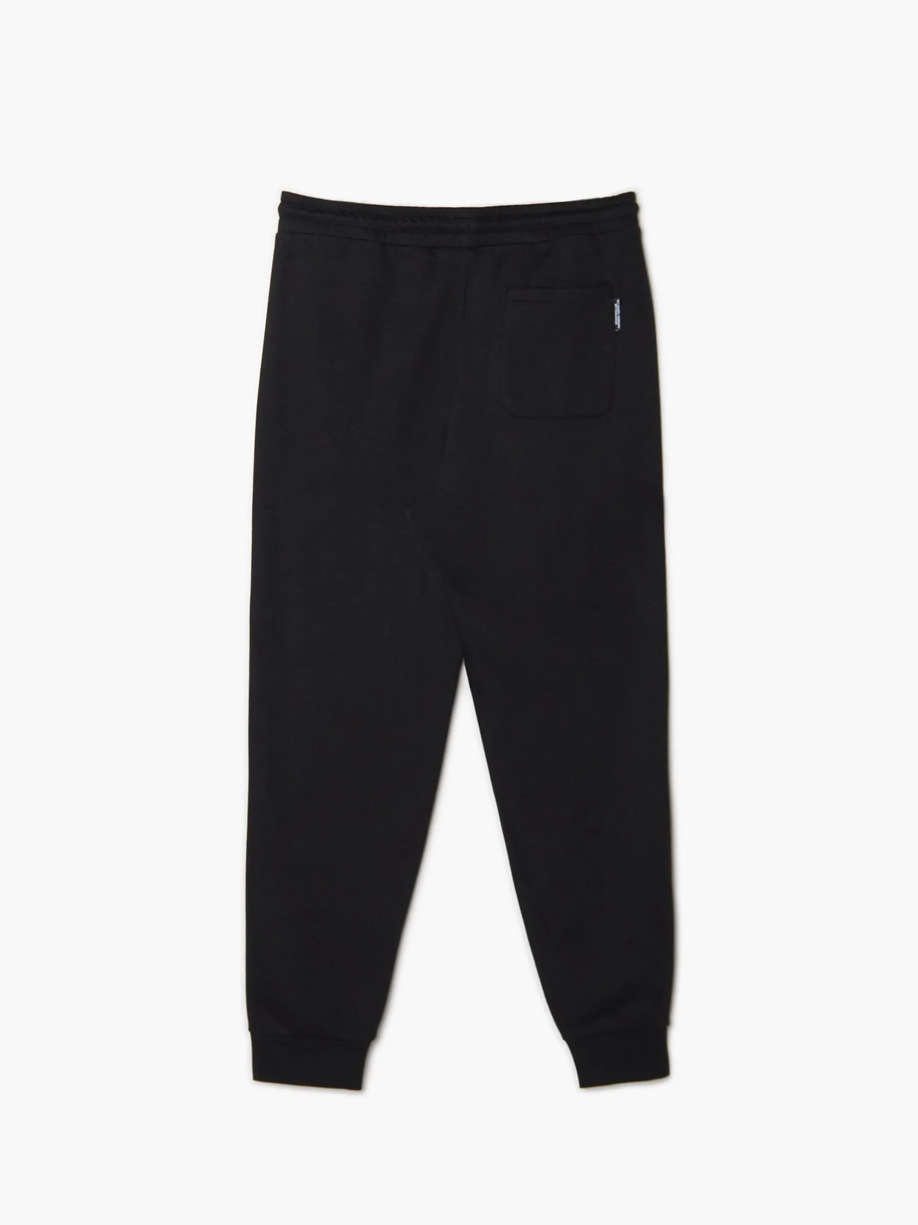 Męskie czarne spodnie dresowe, uszyte z z dzianiny zawierającej bawełnę. regularny stan w pasie gumka i sznurek do regulacji długa nogawka, zakończona ściągaczem trzy kieszenie dostępne w innej wersji kolorystycznej Model prezentuje produkt w rozmiarze M/L. Wzrost modela: 185 cm