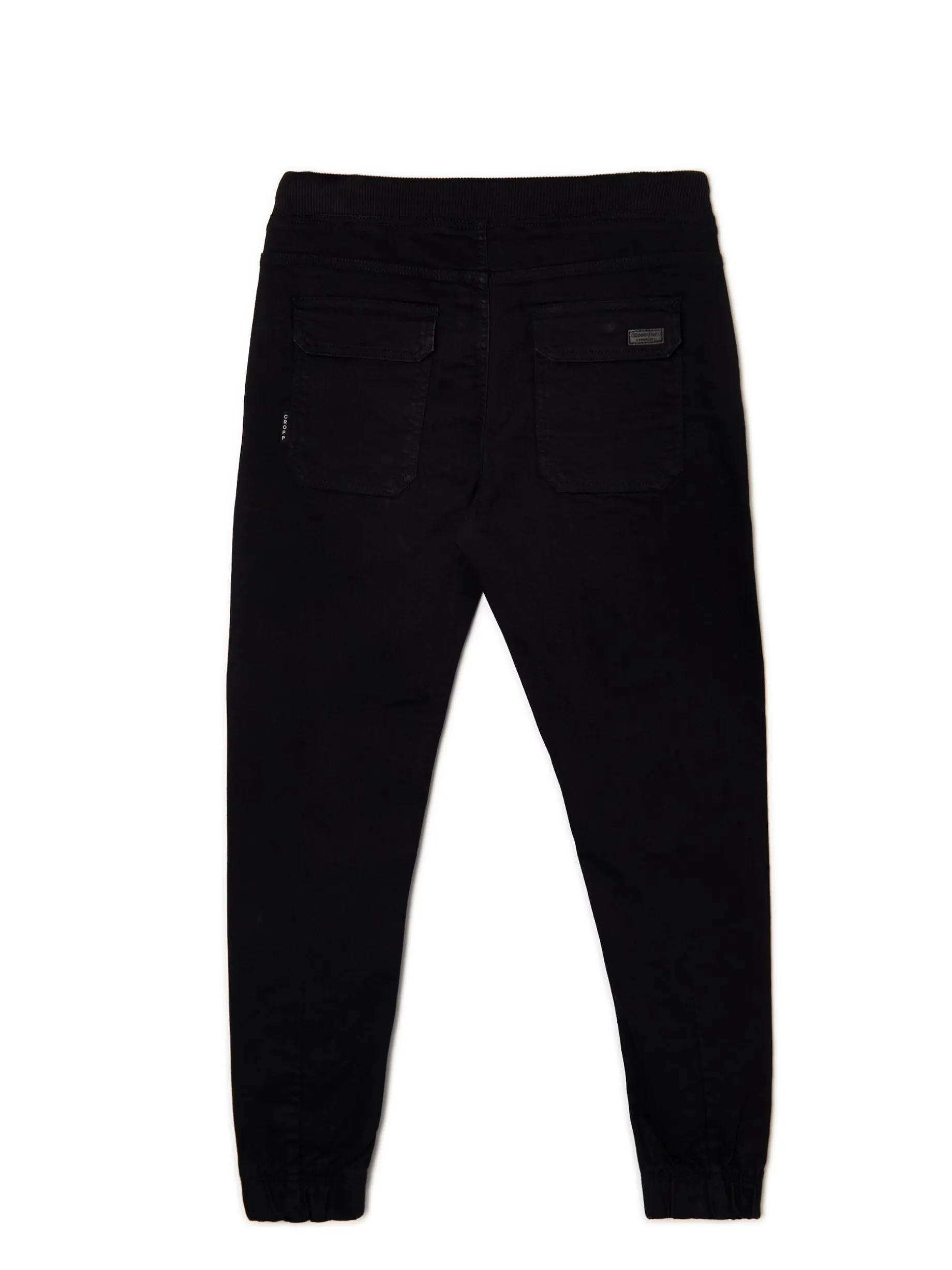 Męskie spodnie jeansowe, uszyte z tkaniny o wysokiej zawartości bawełny. wygodny krój jogger regularny stan elastyczna gumka w pasie i sznurek do regulacji, pas wykonany z miękkiego, dzianinowego ściągacza długa, wąska nogawka zakończona gumką cztery kieszenie, w tym dwie zapinane na zatrzaski dostępne w innych kolorach