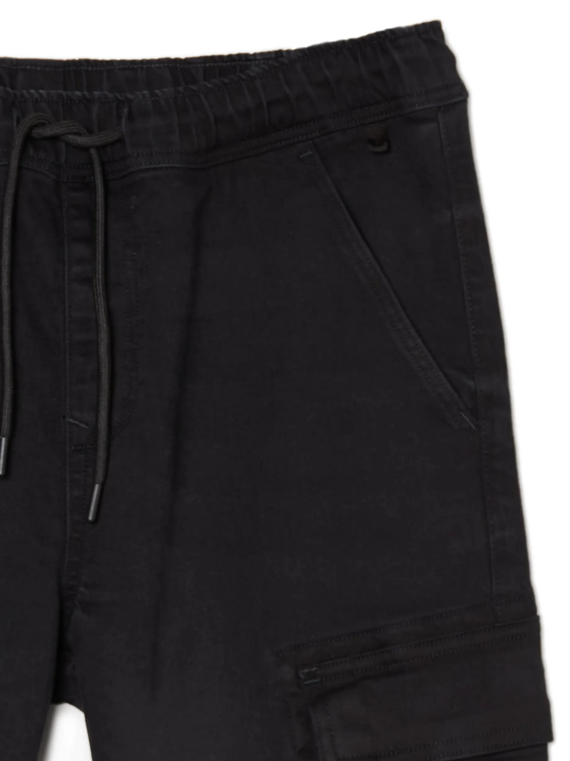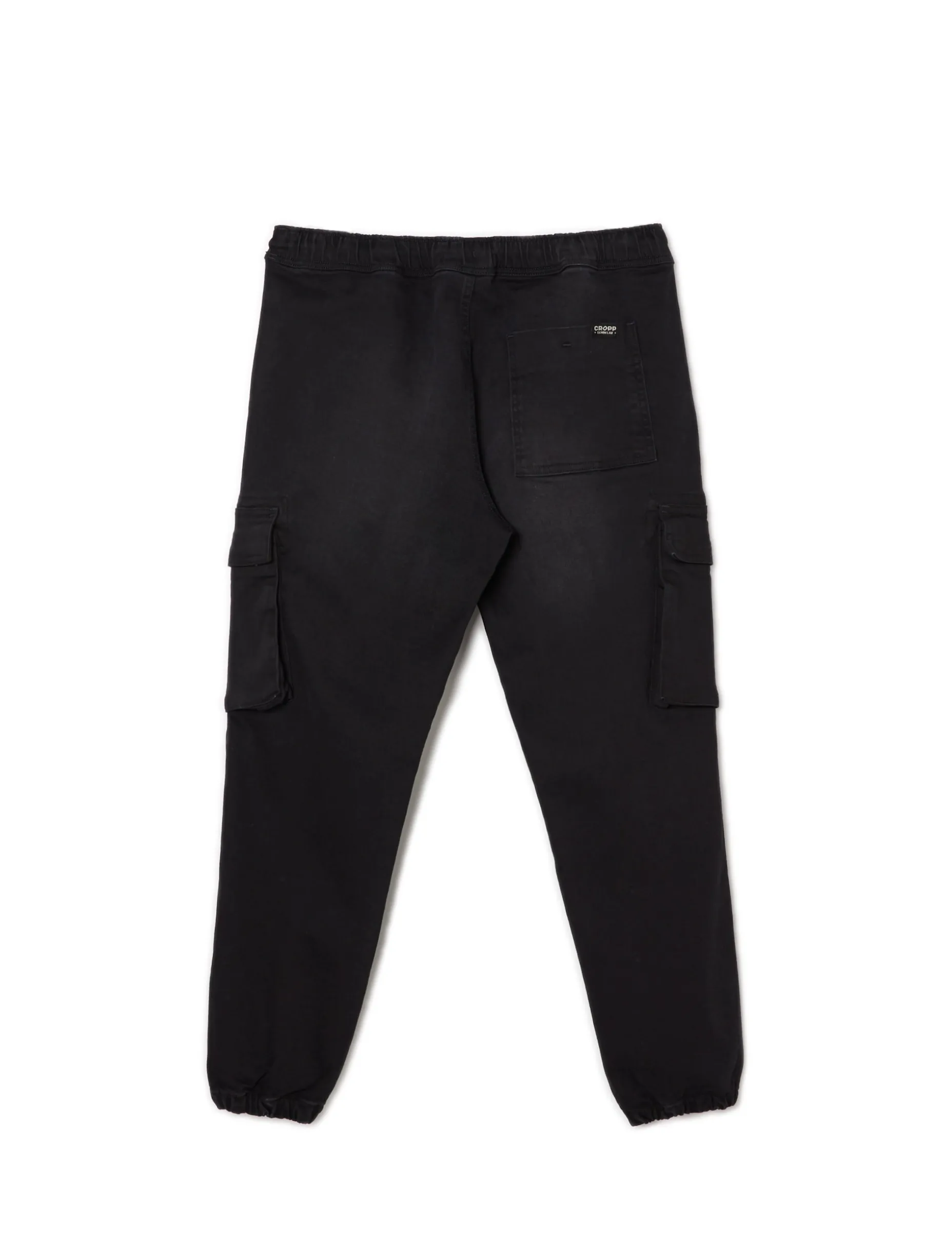 Jeansowe czarne spodnie męskie o kroju jogger, uszyte z bawełny z dodatkiem elastanu. w pasie gumka i sznurek do regulacji 5 kieszeni, w tym kieszenie typu cargo nogawka ze ściągaczem jeansy dostępne w innej wersji kolorystycznej