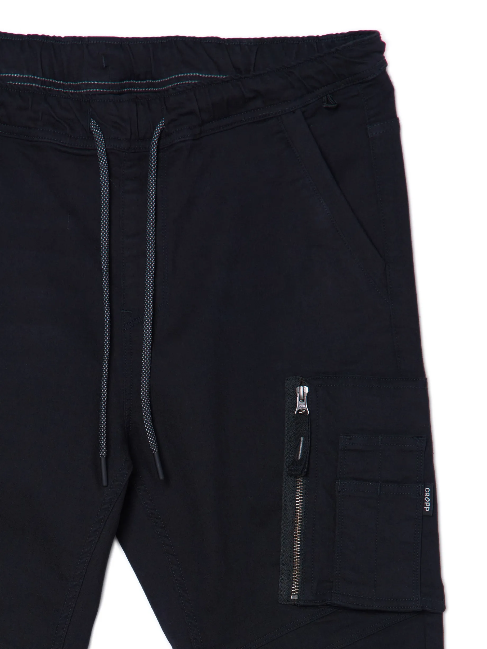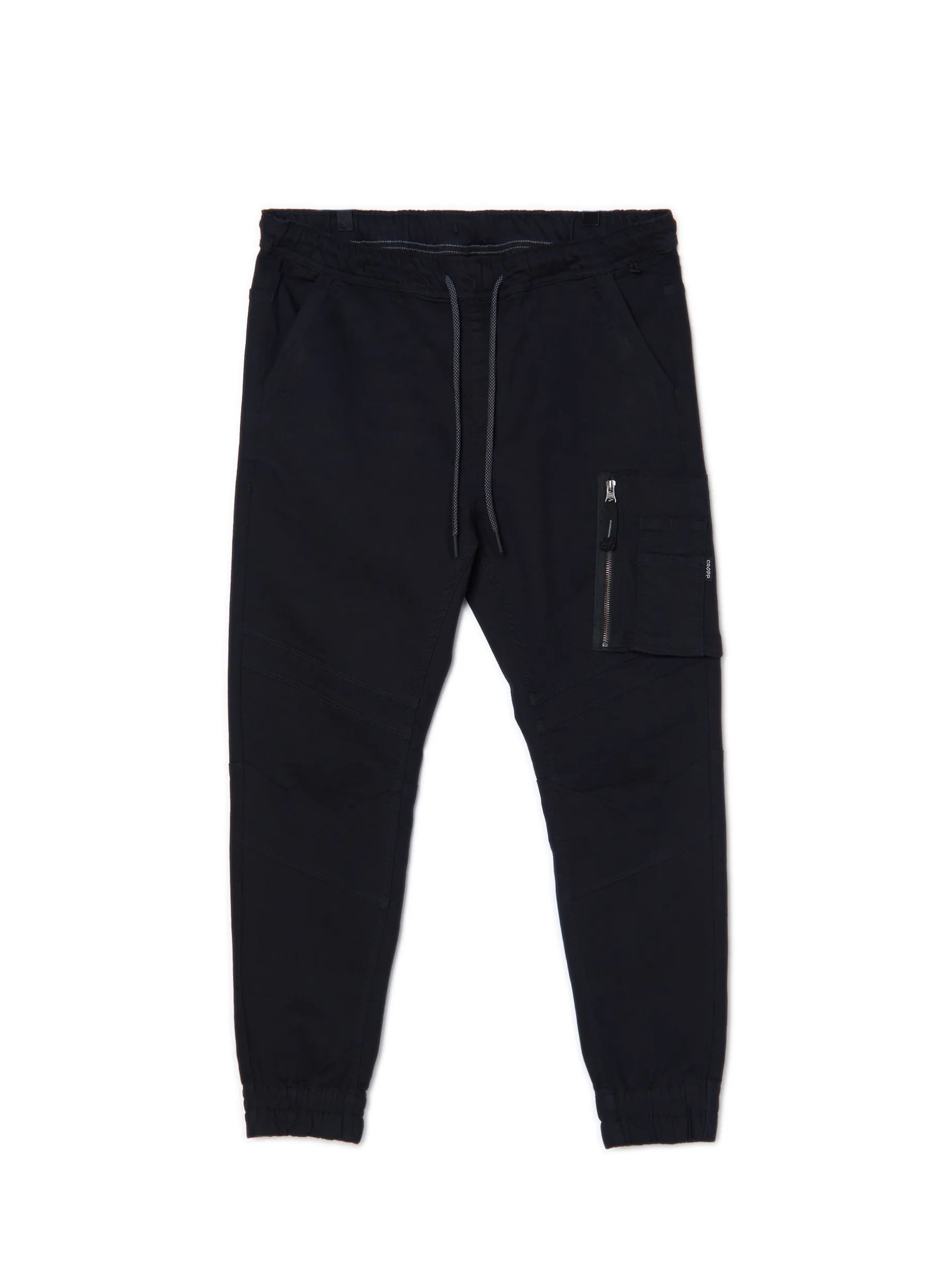 Czarne spodnie jeansowe o kroju jogger chino, uszyte z tkaniny o wysokiej zawartości bawełny. regularny stan, w pasie gumka i sznurek do regulacji pięć kieszeni, w tym jedna cargo, zapinana na suwak imitacja rozporka wąska nogawka z ukośnymi przeszyciami, zakończona ściągaczem Wzrost modela: 184 cm