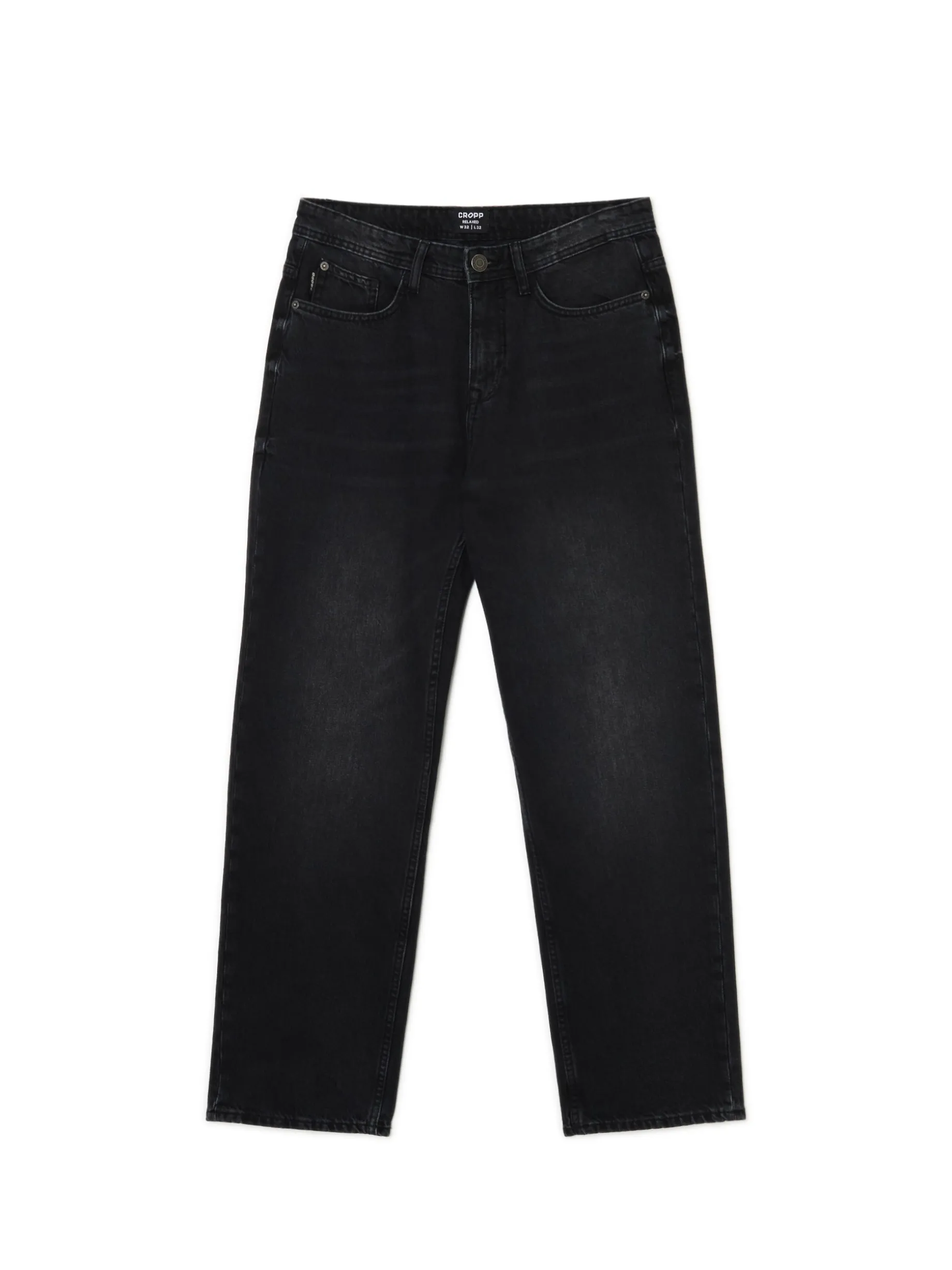 Męskie spodnie jeansowe typu relaxed, uszyte z bawełnianej tkaniny w czarnym kolorze. Szlufki blisko siebie to praktyczne rozwiązanie na zmęczone ręce po całym dniu. Zrelaksuj się! 100% bawełny prosty krój zapięcie na zamek i guzik wąskie szlufki na pasek pięć kieszeni delikatny efekt sprania