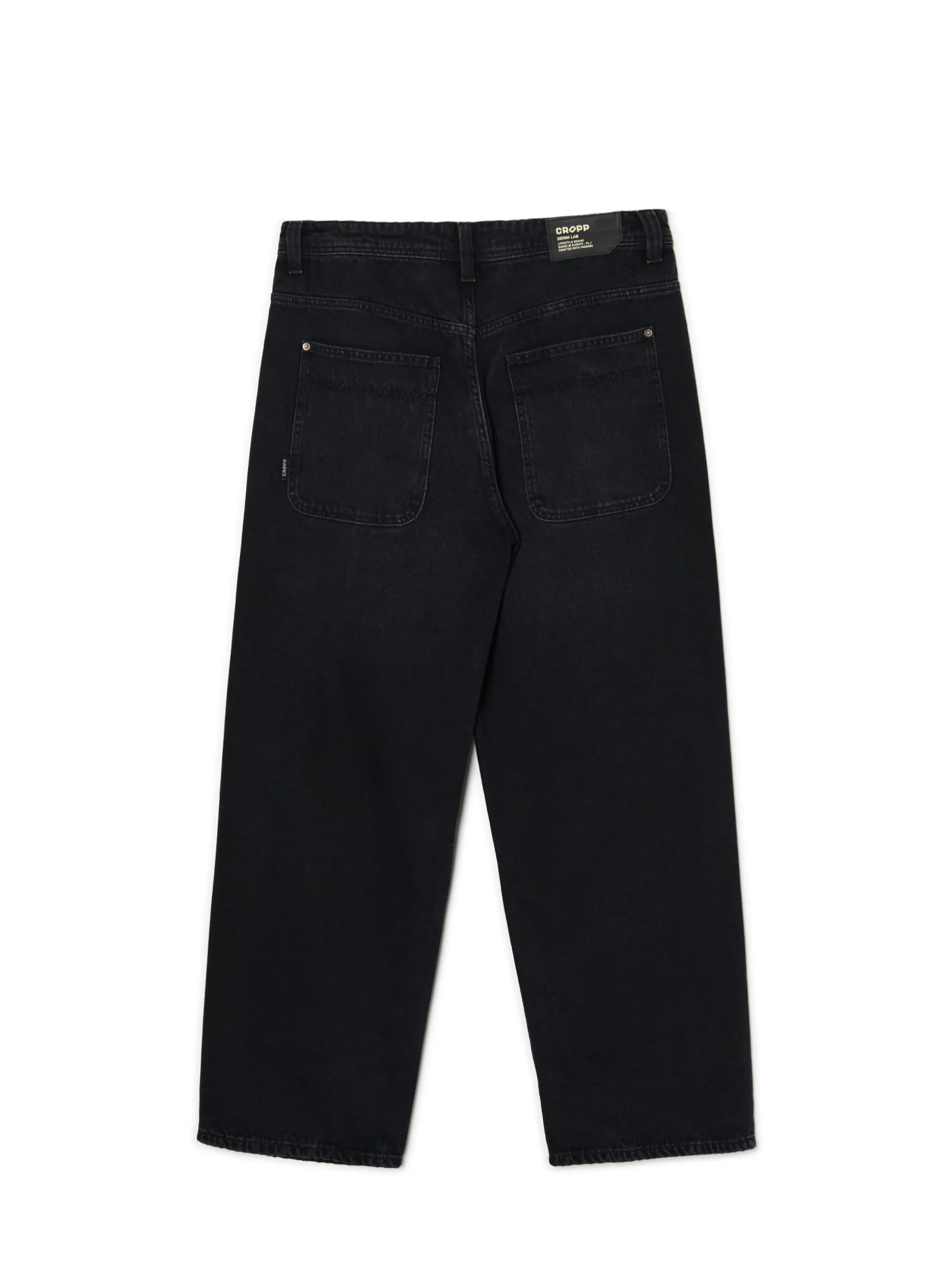Spodnie męskie uszyte z denimowej tkaniny w kolorze czarnym z efektem sprania. Ten casual z ozdobnymi postrzępieniami będzie świetnym dodatkiem do Twoich stylizacji. 100% bawełny obszerny krój super baggy zapięcie na zamek i guzik długie, bardzo szerokie nogawki pięć kieszeni szlufki na pasek ozdobne postrzępienia efekt sprania na całości