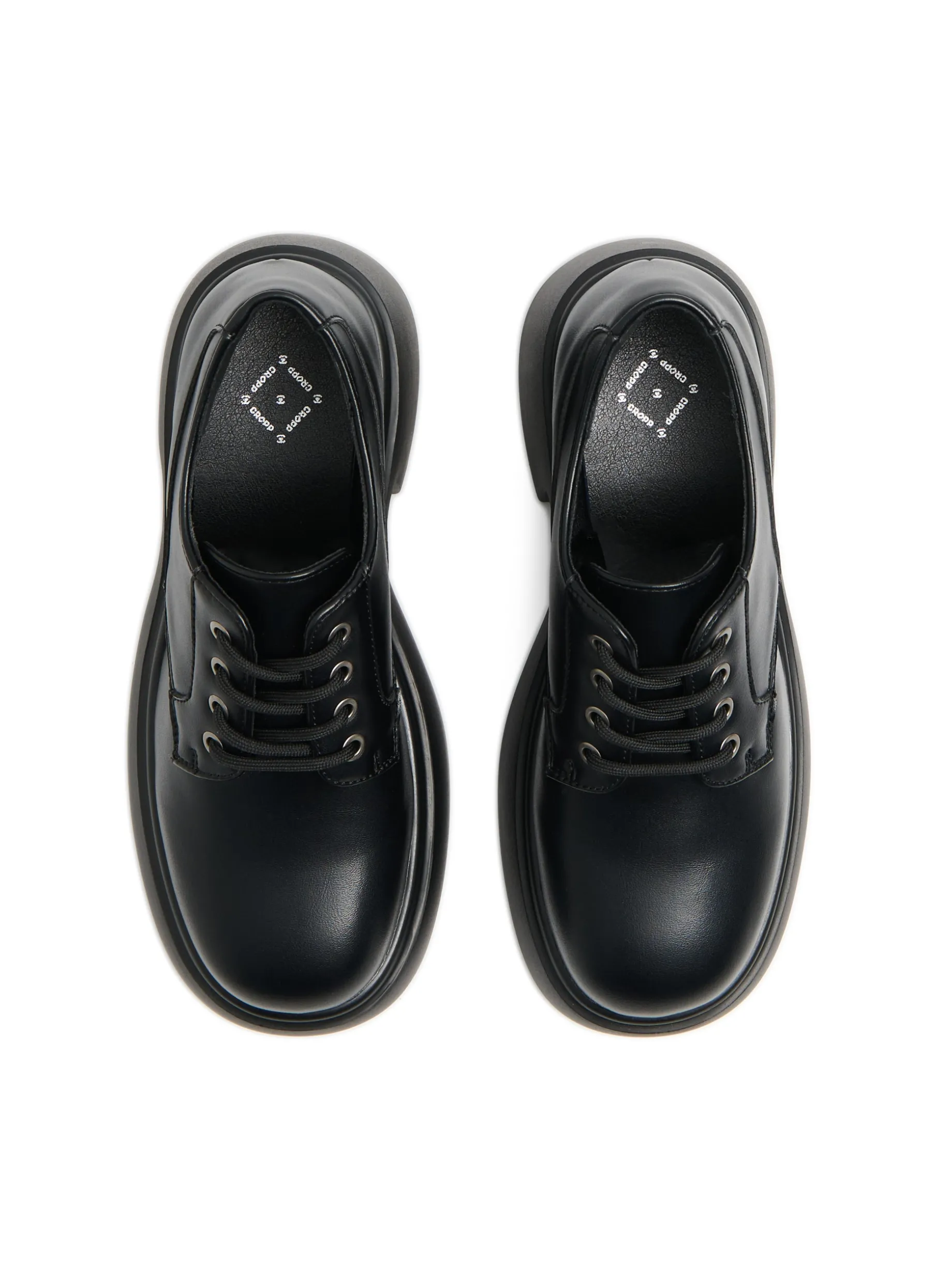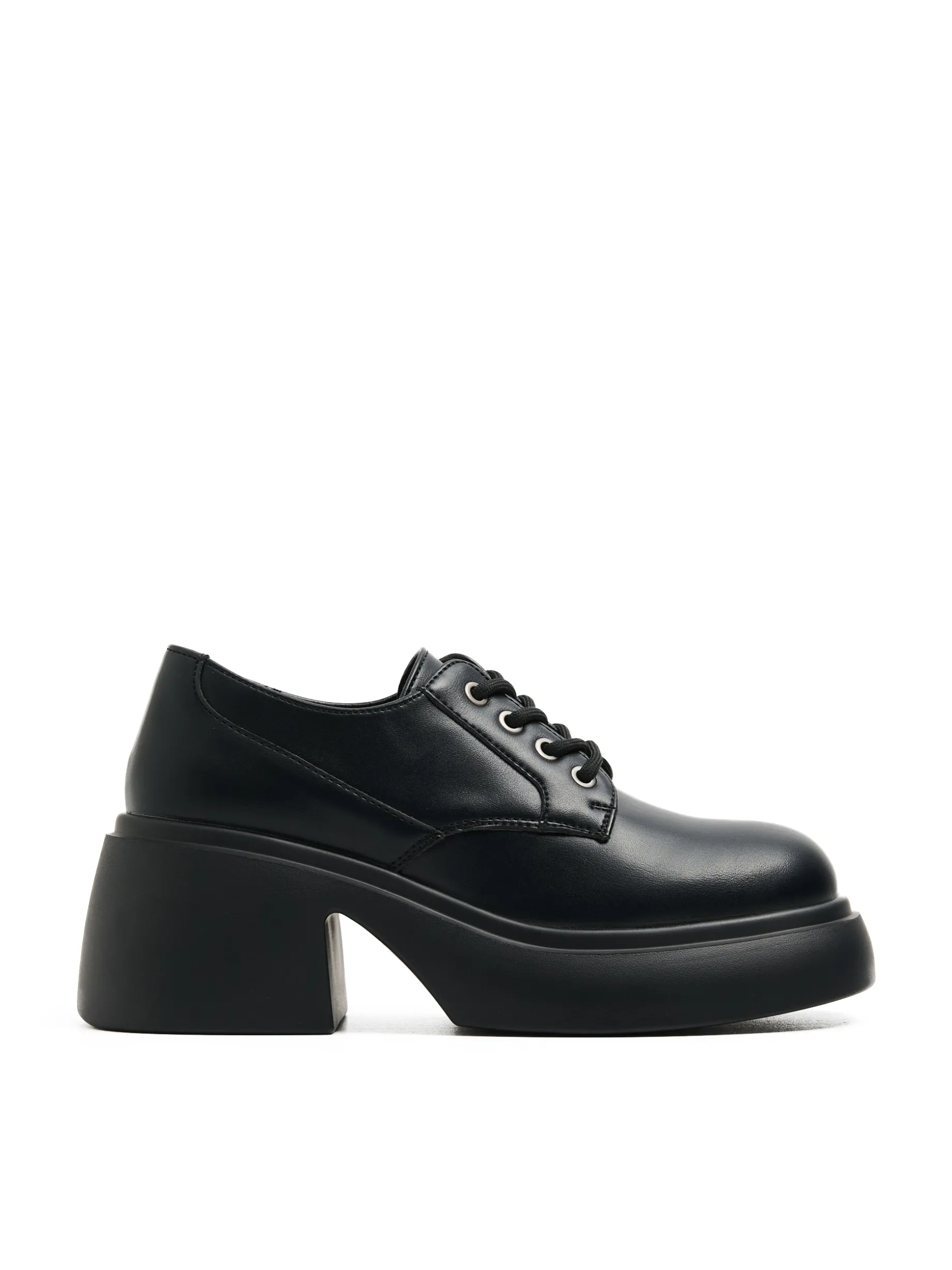 Czarne damskie półbuty typu derby na gładkiej, solidnej platformie z szerokim obcasem. Klasyk, który uzupełni Twoją stylizację! cholewka z imitacji skóry gruba, solidna podeszwa obcas w formie słupka wiązane na czarne sznurowadła