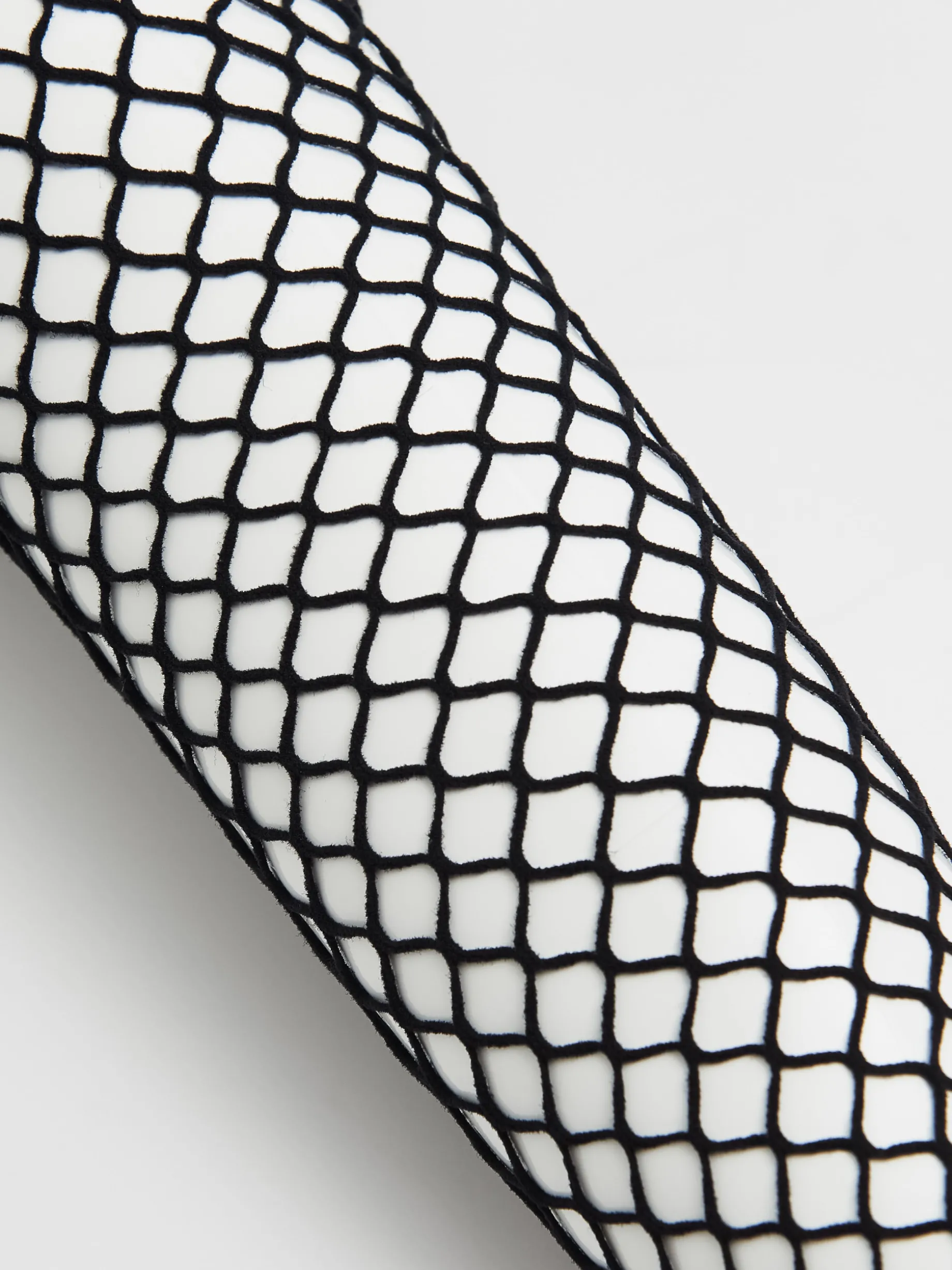 Para damskich rajstop typu kabaretki z dużymi oczkami uszyte z dzianiny w czarnym kolorze.