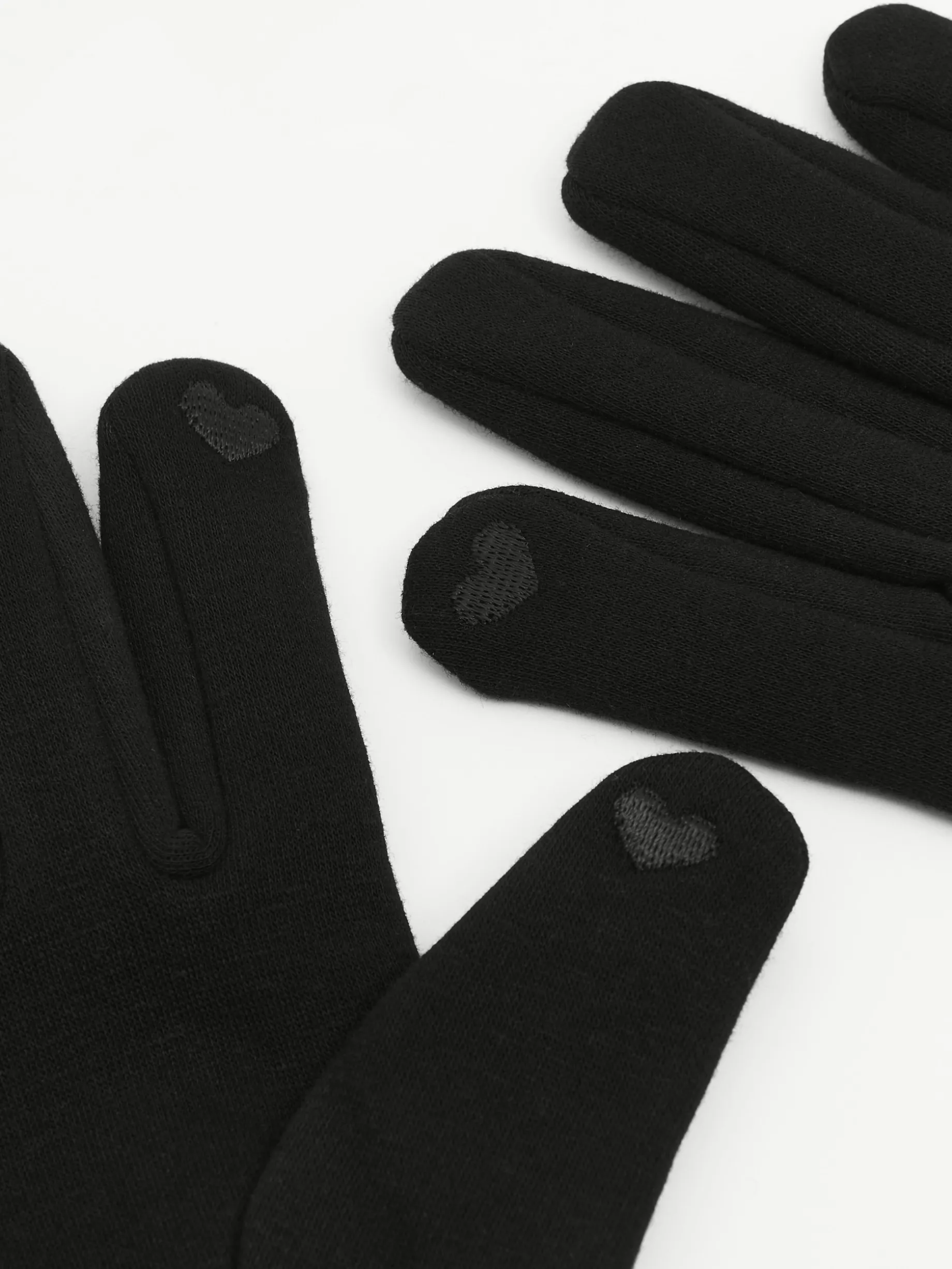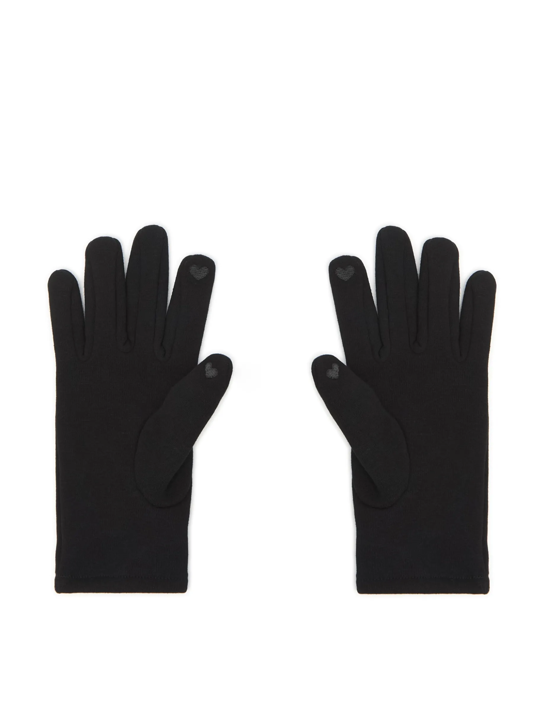 Czarne rękawiczki damskie uszyte z elastycznej dzianiny. Haft w kształcie serca umożliwia korzystanie z dotykowego smartfona bez konieczności zdejmowania rękawiczek.
