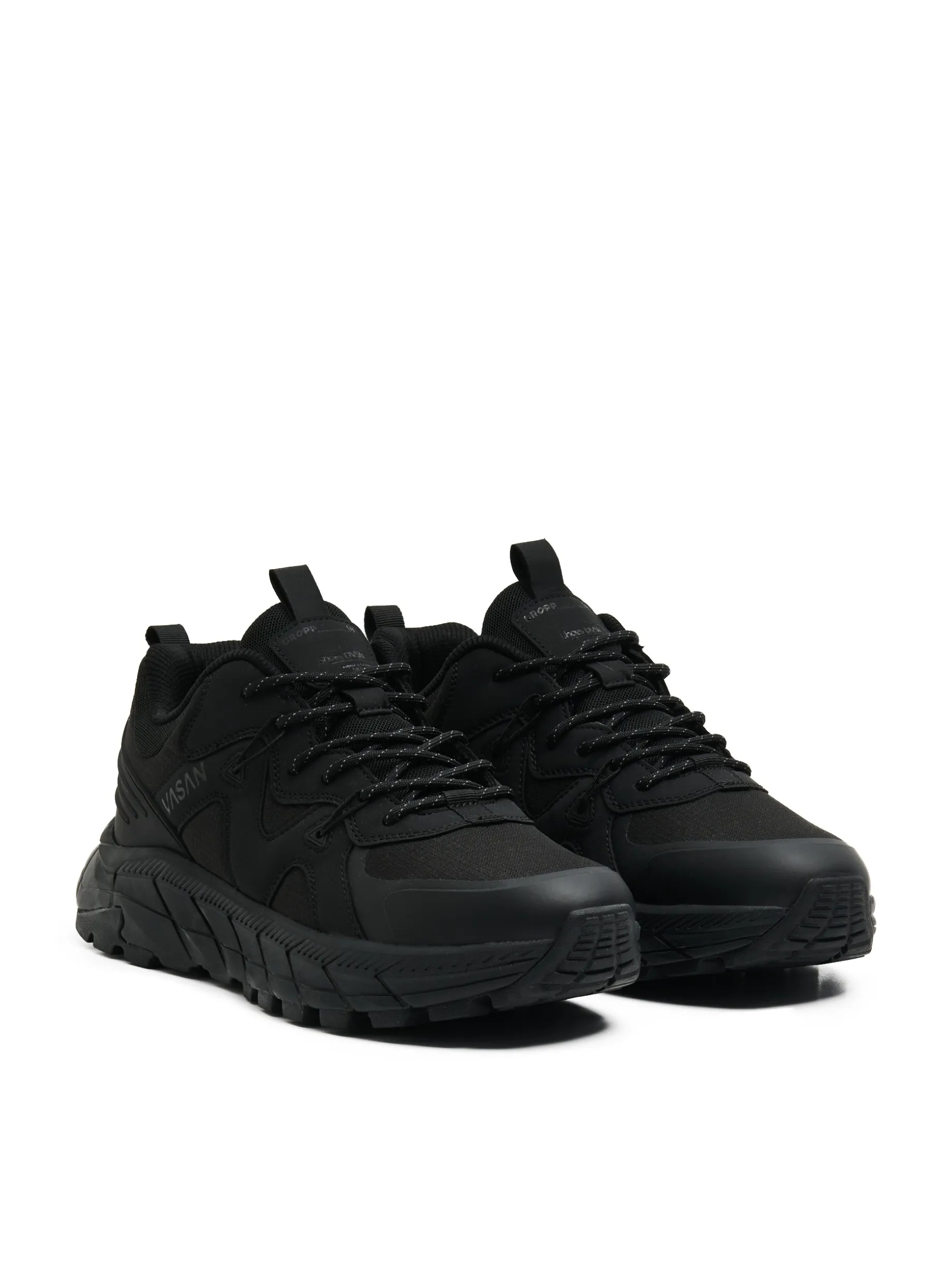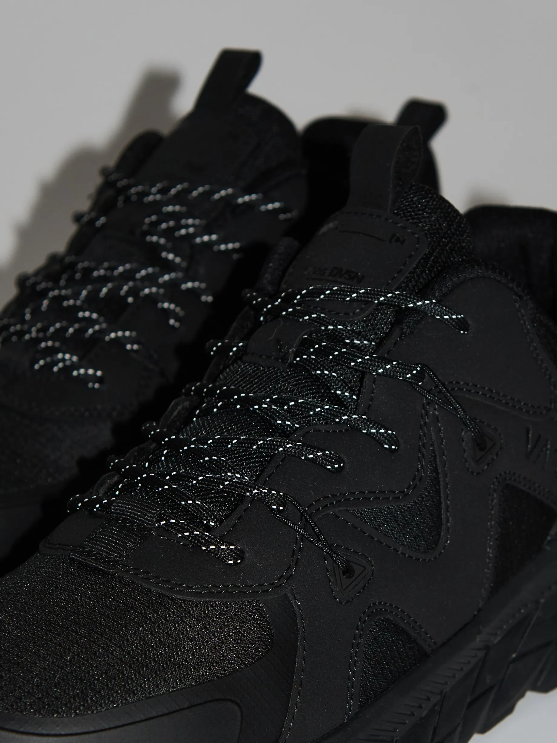Czarne męskie sneakersy typu chunky z elastyczną cholewką i solidną podeszwą. Wyposażone w gumowe wstawki chroniące przed uszkodzeniami i sznurowadła z efektem reflective. Idealne na wieczorne, spontaniczne wypady – feel safe with Cropp! sznurowane sneakersy chunky z łączonych materiałów gruba podeszwa z termoplastycznej gumy wiązane na świecące w ciemności sznurówki lekkie gąbkowanie wokół kostki wygodne uchwyty do wkładania i zdejmowania butów naszywka Cropp