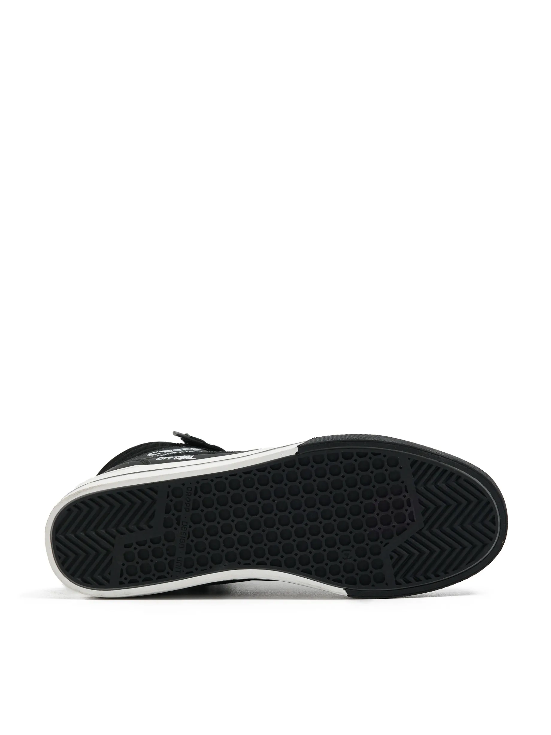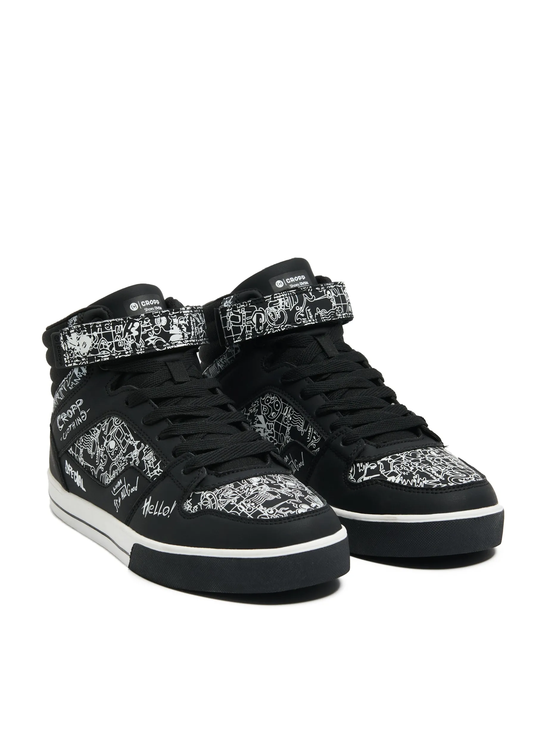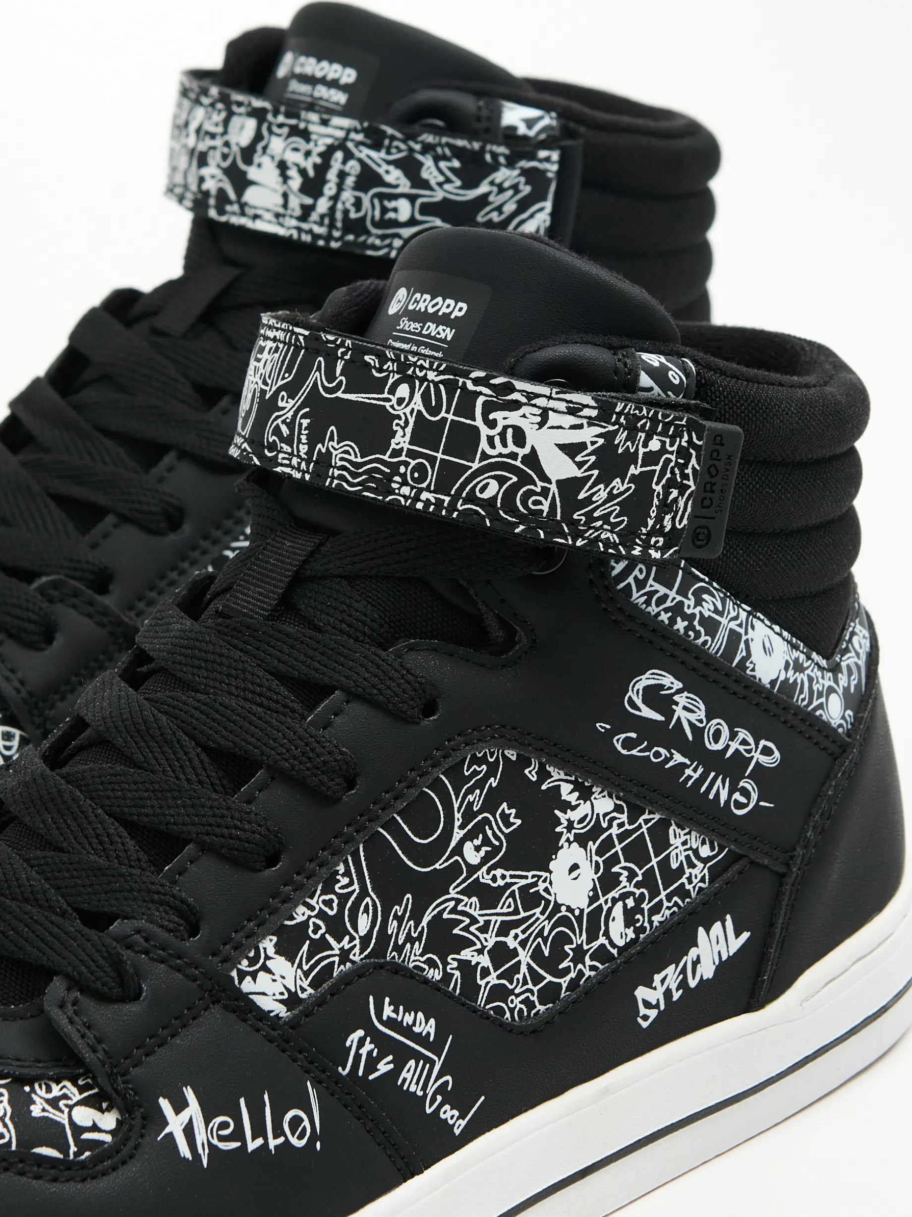 Czarne buty męskie typu sneakersy wykonane z łączonych materiałów. Wysoka cholewka z wiązaniem i dodatkowym zapięciem na rzep dobrze usztywnia kostkę. Model idealny do różnego typu aktywności podczas kapryśnej jesieni! wysokie sneakersy z elastyczną cholewką lekkie gąbkowanie wokół kostki płaska, dwukolorowa podeszwa z termoplastycznej gumy wiązane na płaskie, czarne sznurowadła sznurowanie i zapięcie na rzep wzmacniany nosek zwiększający ochronę przed zużyciem kontrastowy nadruk all over naszywka z napisem Cropp