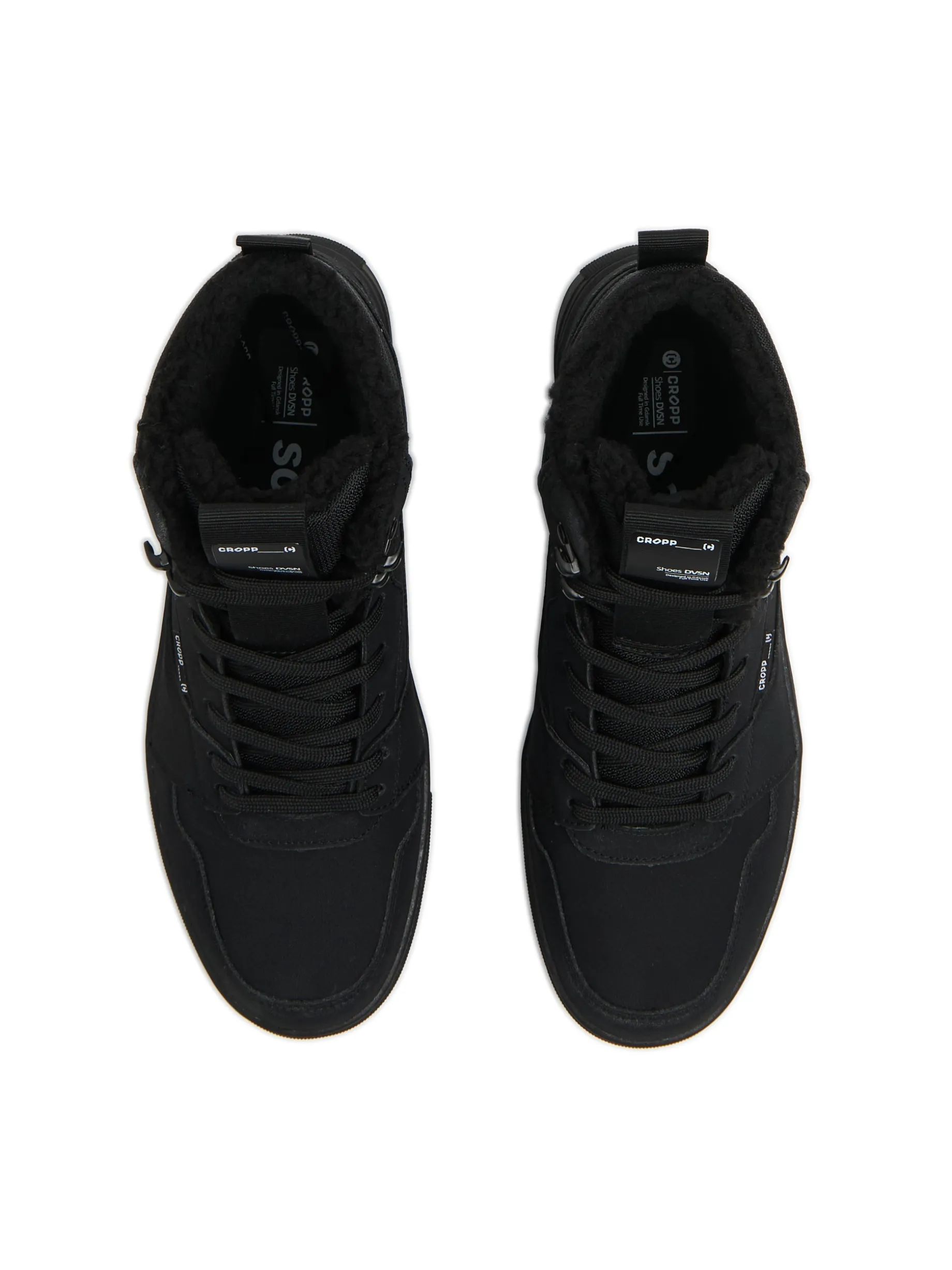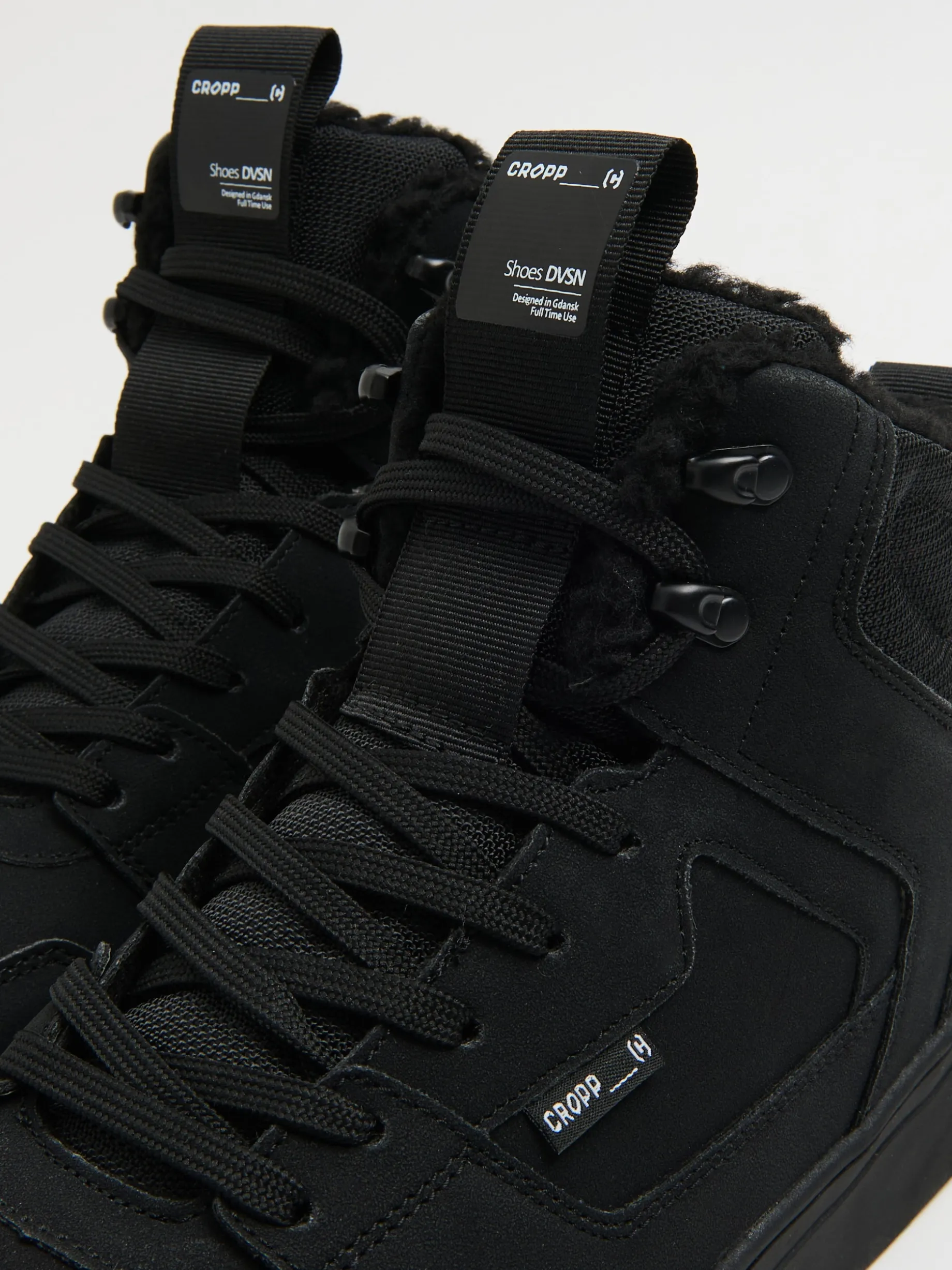 Męskie sneakersy za kostkę wykonane z imitacji skóry z delikatnym meszkiem. Sznurowanie do kostki i miękka wyściółka ze sztucznego baranka zapewniają komfort noszenia. Wejdź w zimę z naszymi butami! sznurowane sneakersy z ociepleniem wykonane z łączonych materiałów cholewka ze wstawkami ze sztucznej skóry wykończenie na podszewce sherpa lekkie gąbkowanie wokół kostki gruba podeszwa z termoplastycznej gumy wiązane na płaskie, czarne sznurowadła wygodny uchwyt do wkładania i zdejmowania butów metalowe detale naszywka Cropp