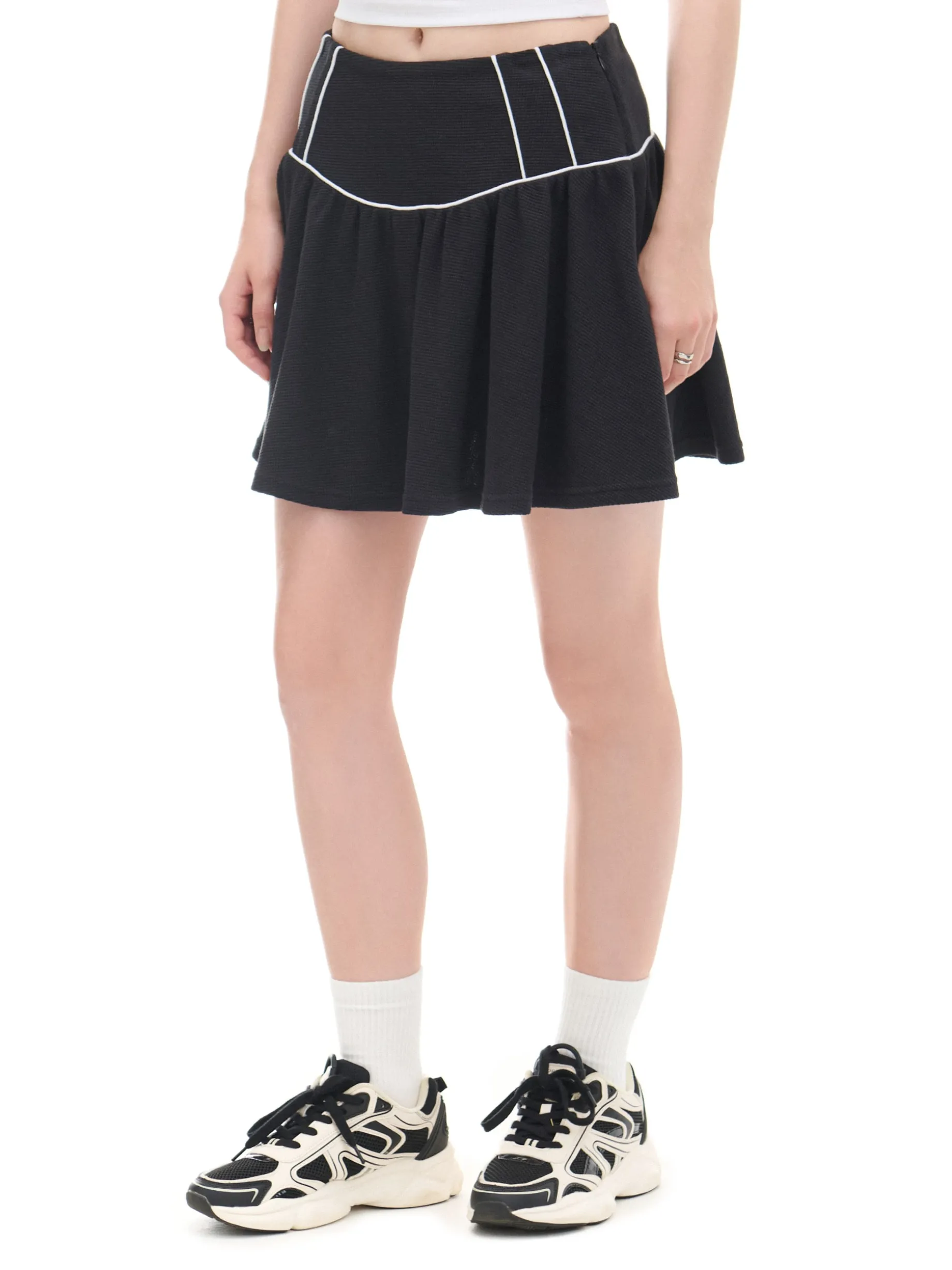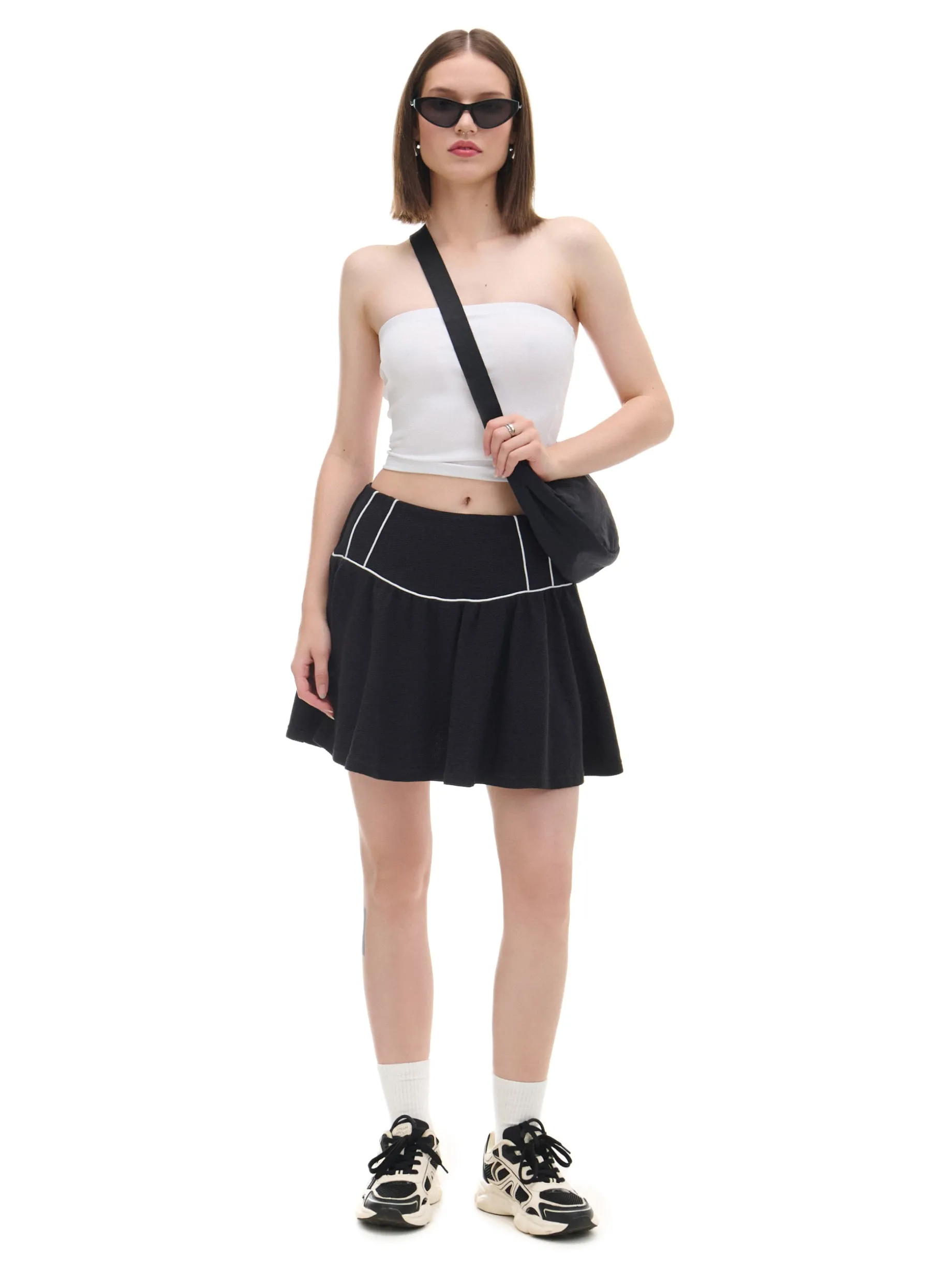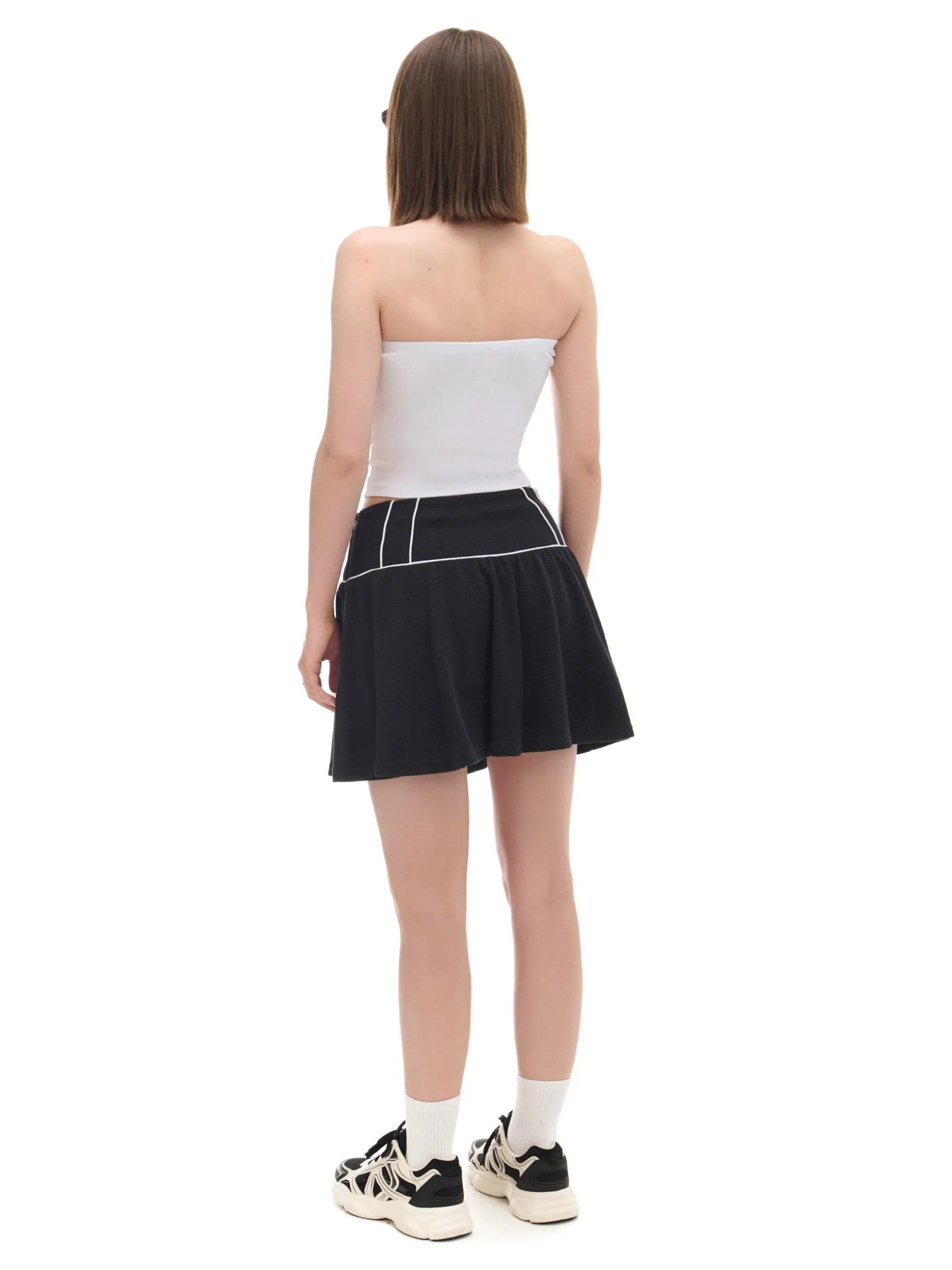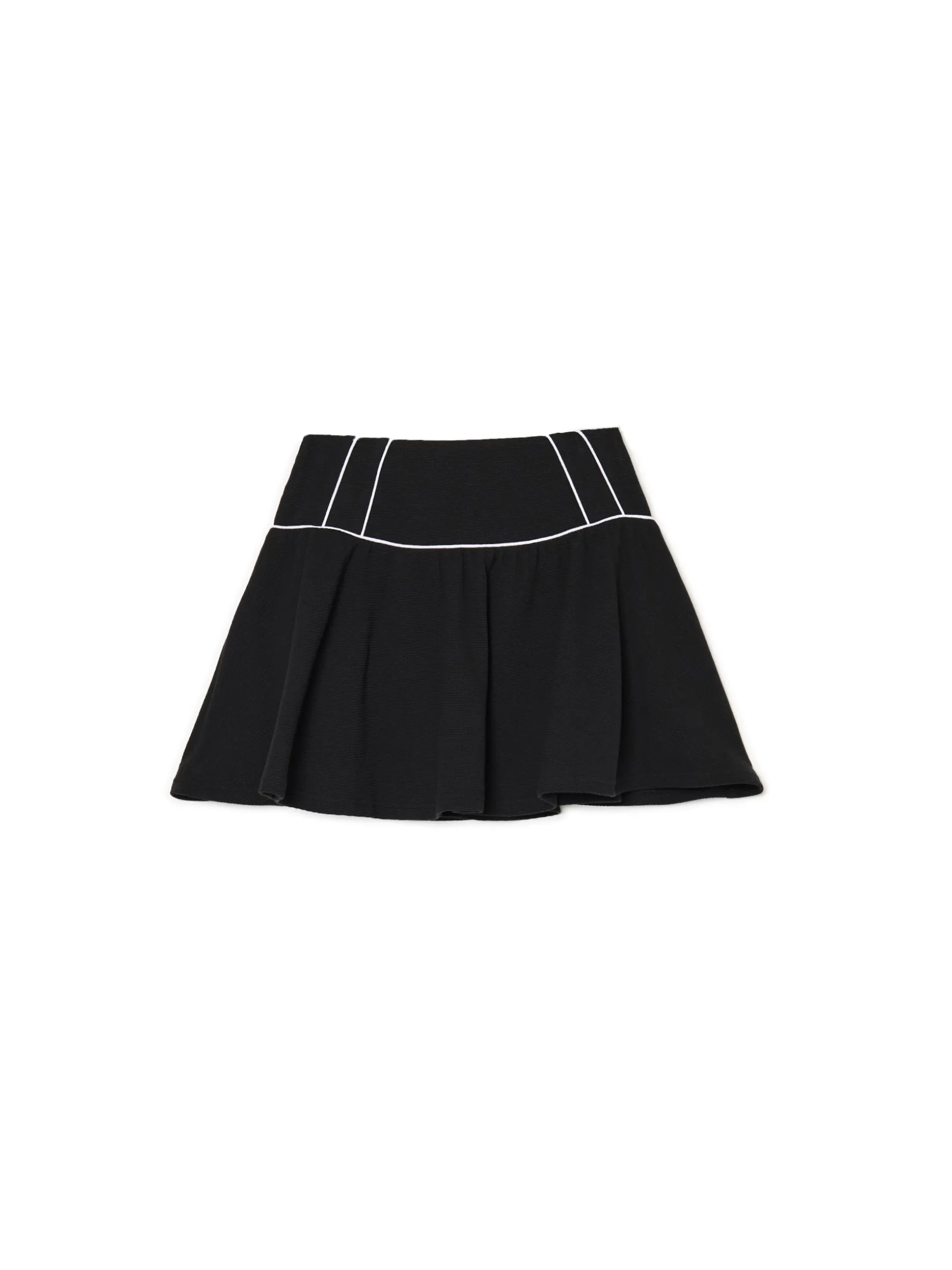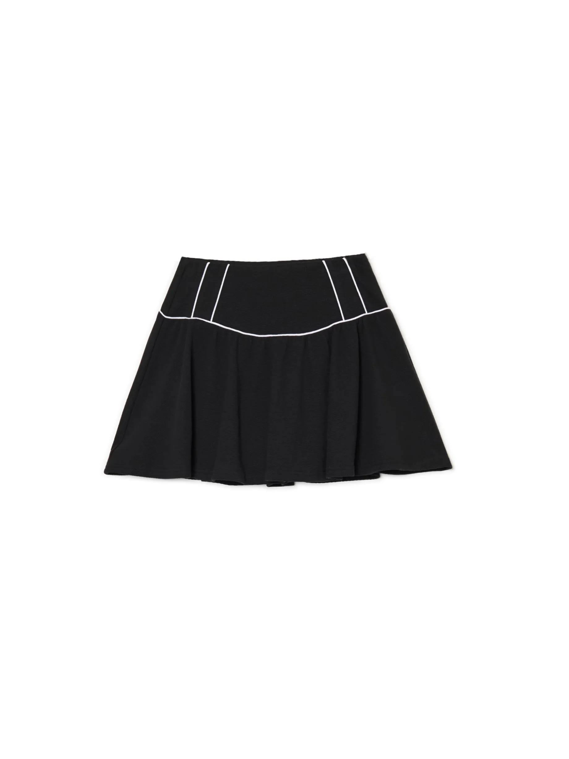 Damskie spódnico-spodenki typu skort, uszyte z dzianiny zawierające bawełnę. Idealne na plażę i nie tylko! regularny stan plisowana spódnica o kroju A pod spodem krótkie spodenki z boku kryty zamek ozdobione delikatną białą lamówką z przodu Wzrost modelki: 172 cm