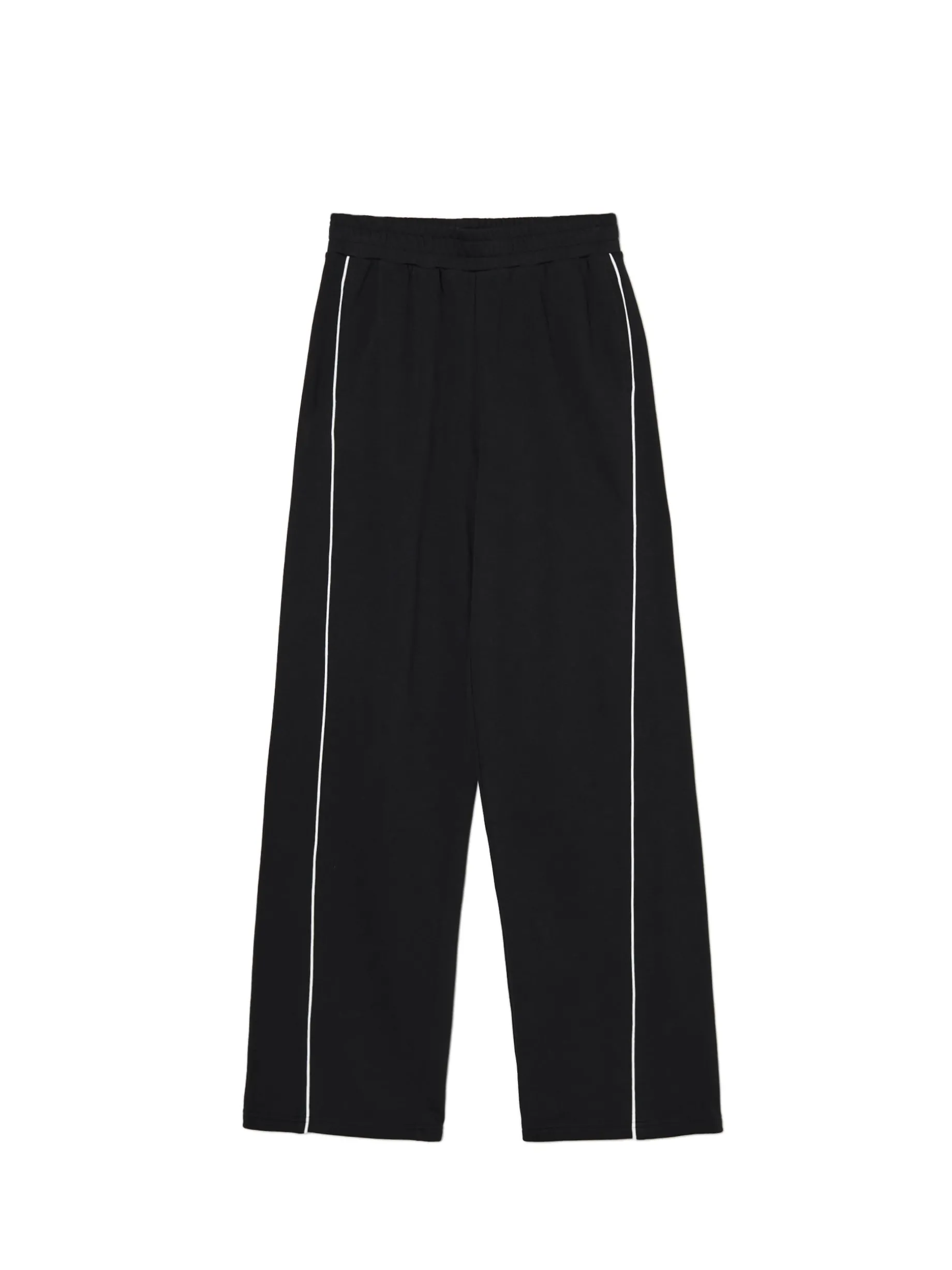 Damskie dresowe spodnie z szerokimi, luźnymi nogawkami uszyte z dzianiny o dużej zawartości bawełny. Hitem tego modelu są ozdobne przeszycia. dzianinowy materiał z bawełną wysoki stan szeroka nogawka z kontrastowym lampasem elastyczna gumka w pasie dwie wszyte kieszenie