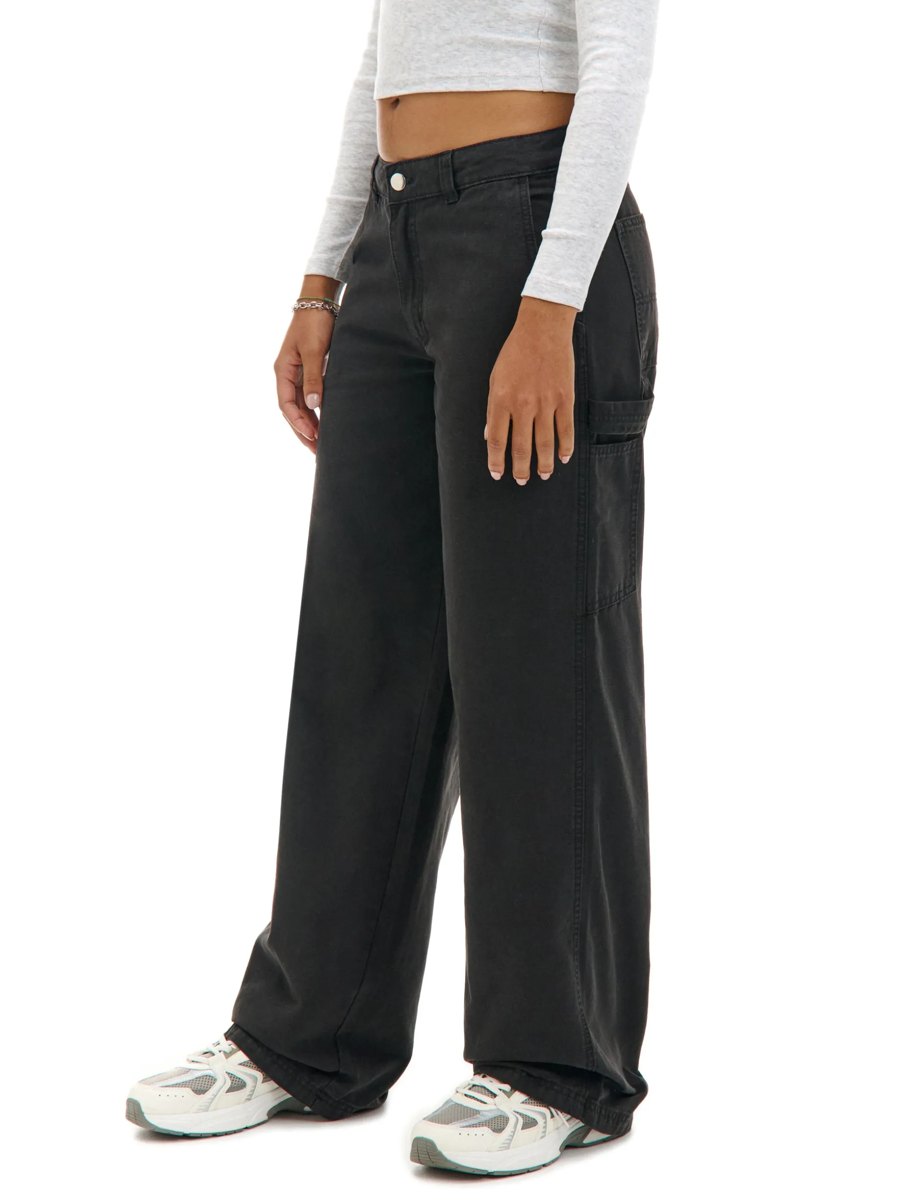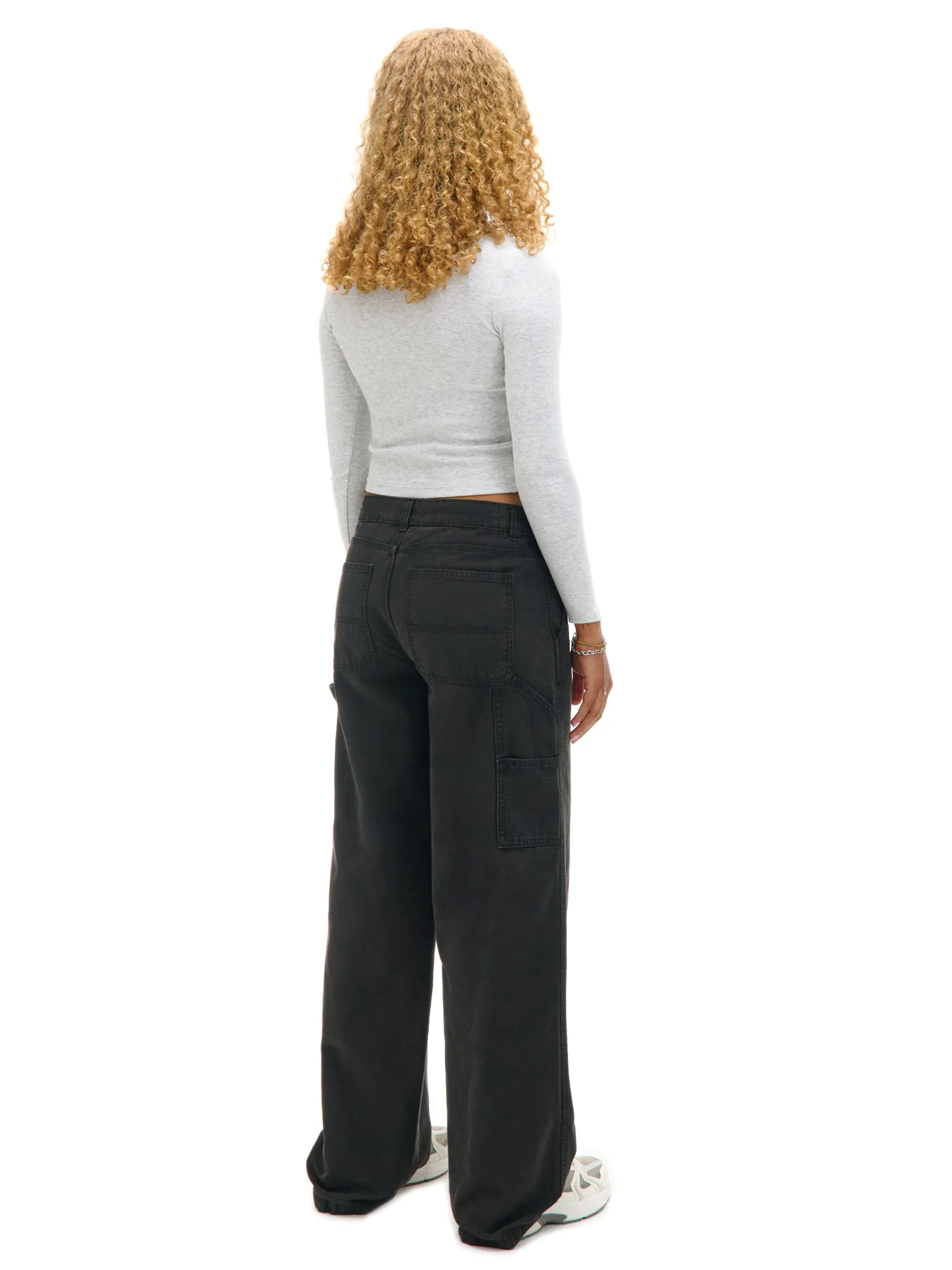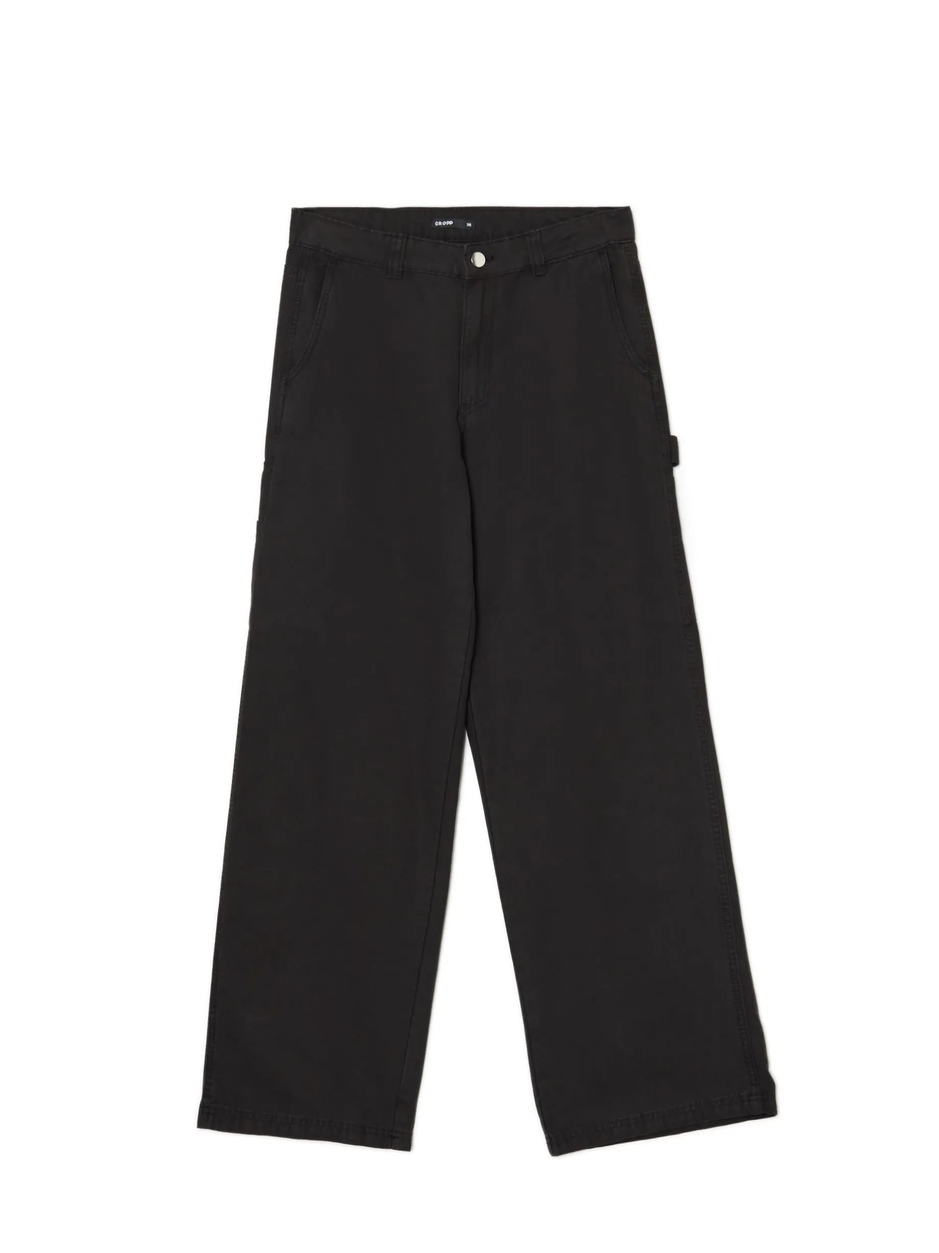 Damskie spodnie uszyte z grubego bawełnianego canvasu w gładkim, czarnym. Solidny, wygodny i stylowy item do zadań specjalnych. 100% bawełny niski stan zapięcie na zamek i guzik długie, proste nogawki dwie skośne kieszenie z przodu dwie naszyte kieszenie tylnie dodatkowe kieszenie carpenter hammer loop na lewej nogawce szlufki na pasek