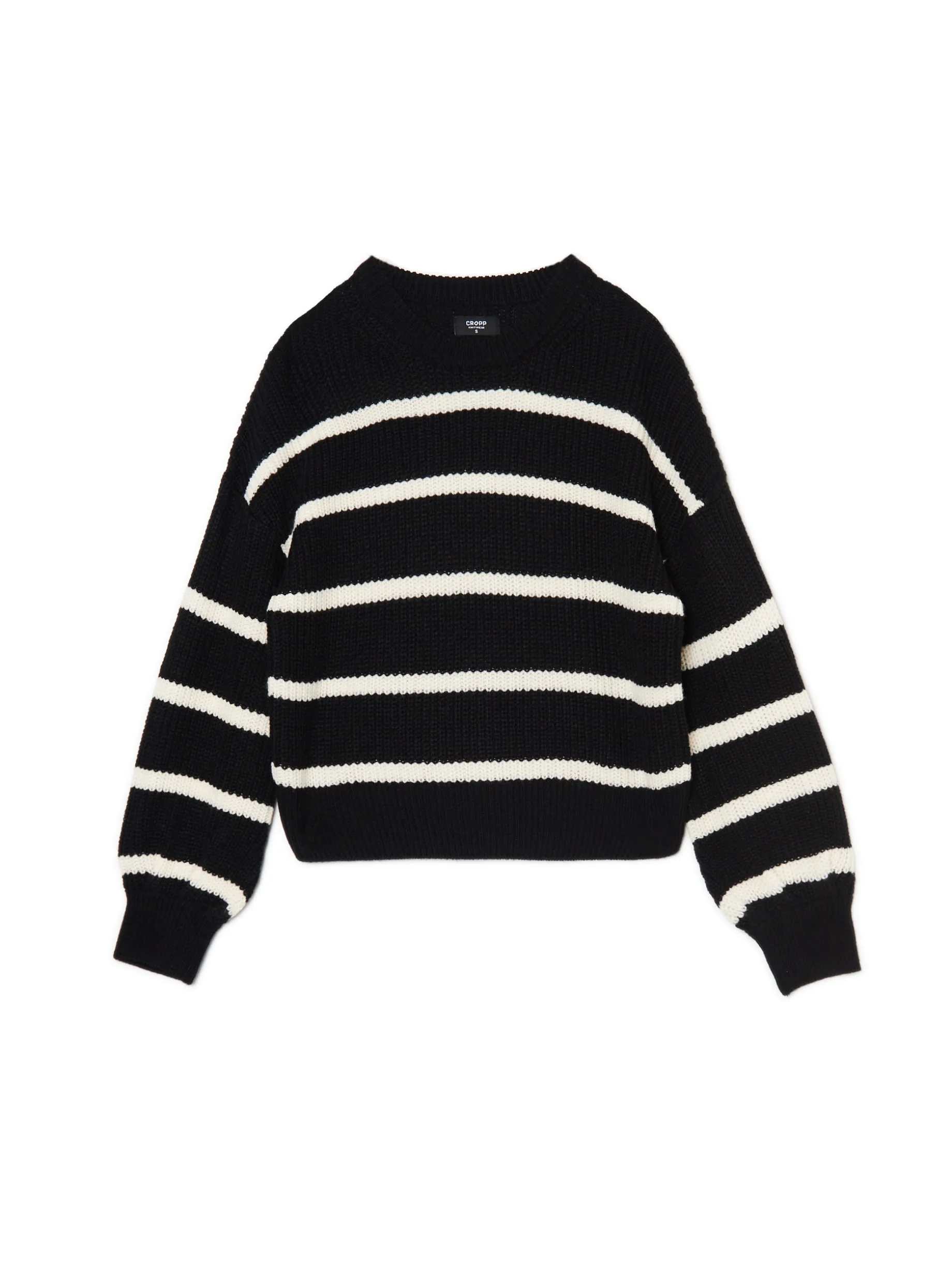 Czarno-biały sweter damski o regularnym kroju, uszyty z dzianiny. Szerokie rękawy z ozdobnym wykończeniem. Dostępne inne warianty kolorystyczne.