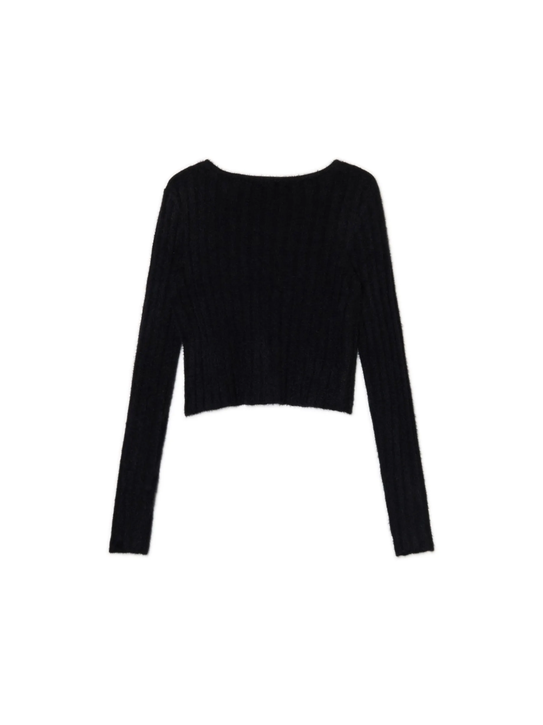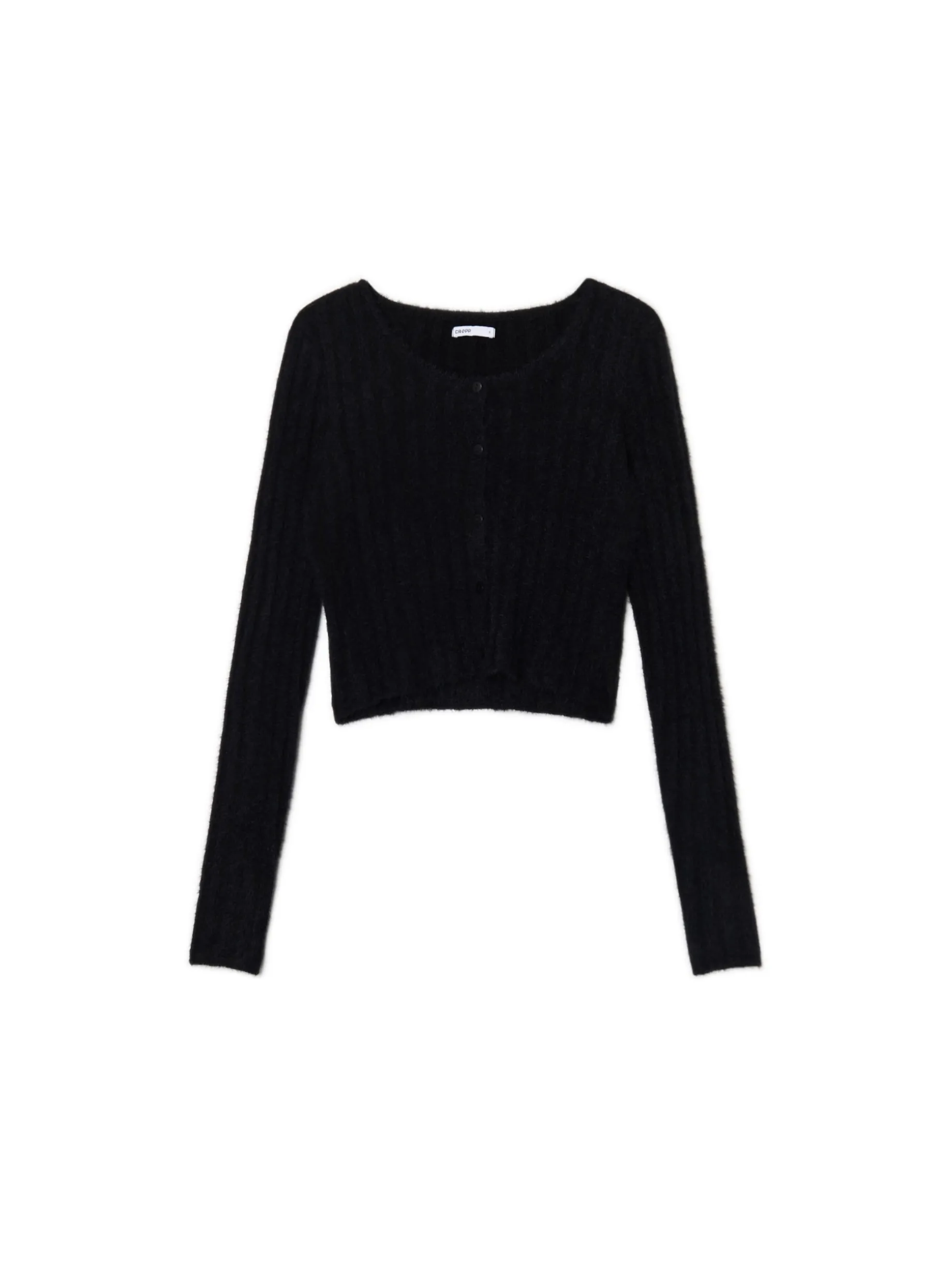 Damski czarny sweterek, uszyty z przyjemnej w dotyku mieszanki dzianin. Idealny, jeśli kochasz cozy vibes: strukturalne pionowe prążki podkreślają jego jesienarski charakter. dopasowany krój długie rękawy dekolt typu łódka z przodu zapięcie na guziki