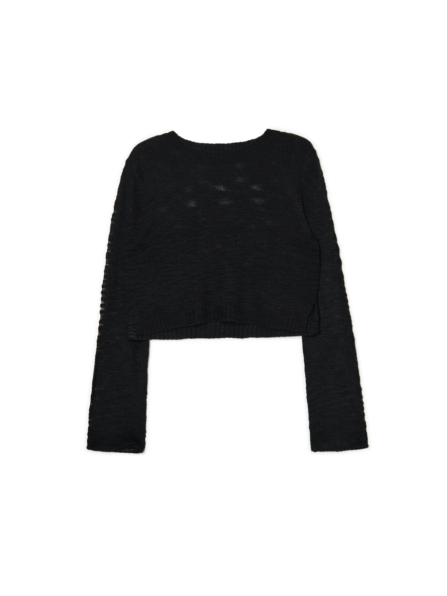 Damski sweter o krószym kroju z długimi rękawami, uszyty z prześwitującego materiału. Fituje z różnego typu koszulkami na ramiączkach i topami. wyjątkowo mocny, a jednocześnie wygodny materiał regularny krój półokrągły dekolt z lamówką długie, swobodne rękawy dekoracyjne rozcięcia po bokach