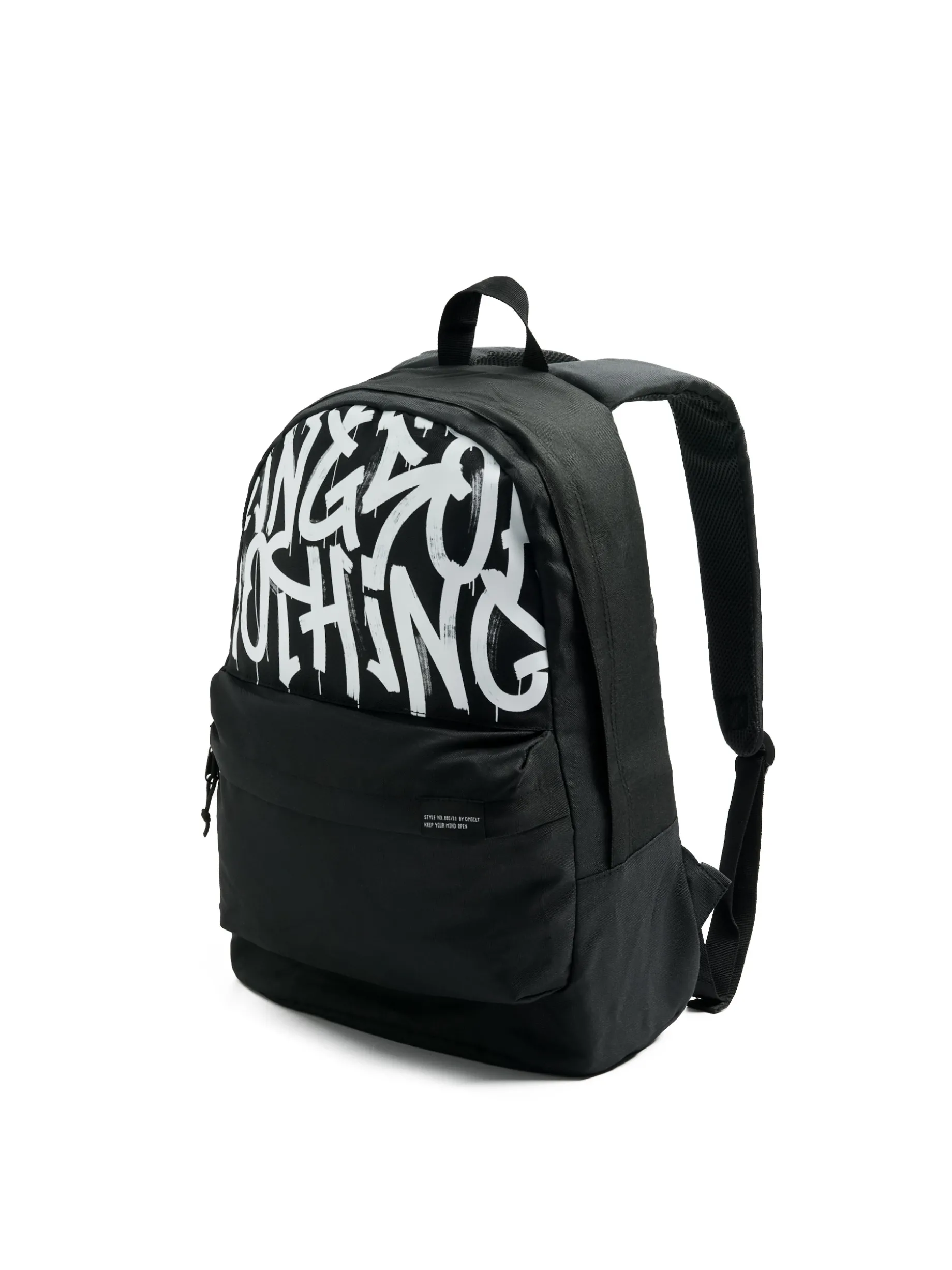 Pojemny męski plecak, wykonany z wytrzymałej czarnej tkaniny. Idealne uzupełnienie streetowych fitów! wygodne, regulowane szelki tylna ścianka plecaka wzmocniona specjalną pianką główna komora oraz dodatkowa kieszeń z przodu zapinane na suwaki wewnętrzna kieszeń na laptopa białe nadruki tekstowe w stylu graffiti niewielka ozdobna metka pojemność: 25 l. Wymiary produktu: 48 x 35 x 15 cm
