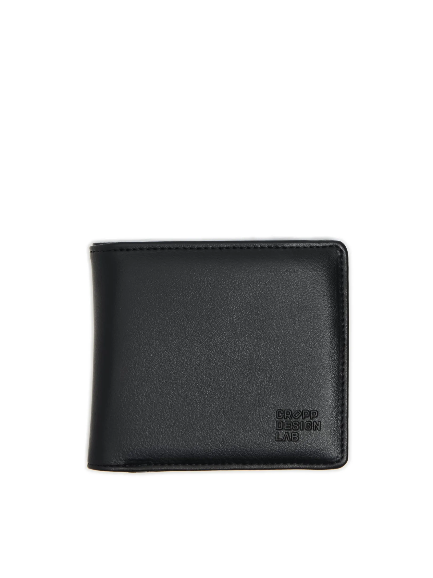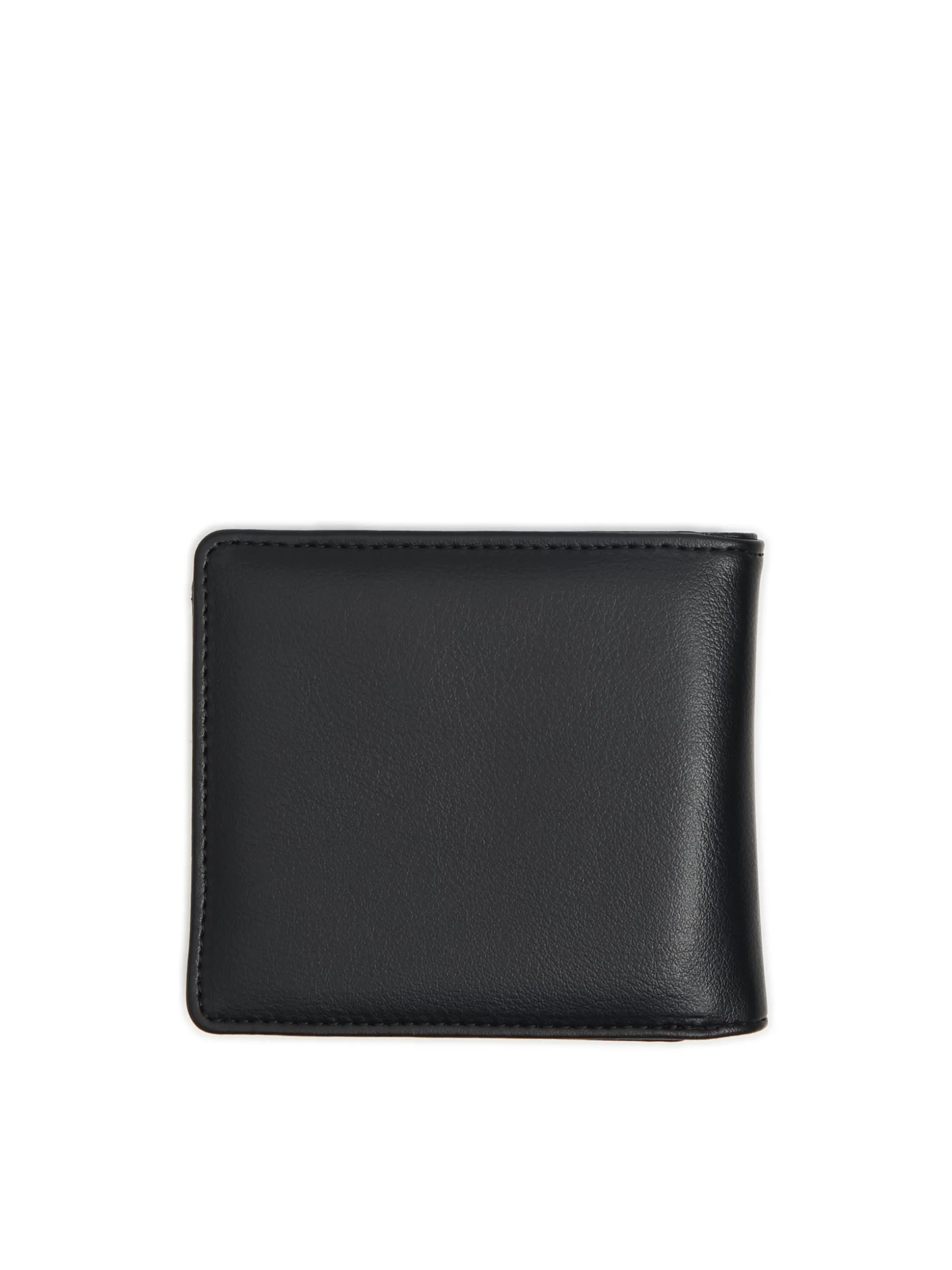 Czarny portfel męski z przegrodami, wykonany z imitacji skóry. Z przodu tłoczony napis. Portfel dostępny w innej wersji kolorystycznej. Wymiary produktu: 10,5 x 12 cm